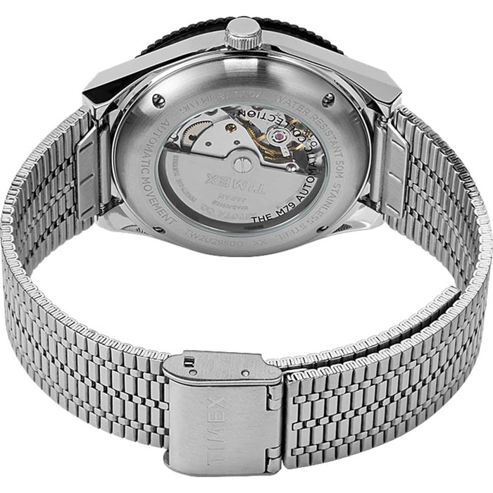 Мужские механические наручные часы с автоподзаводом Timex TW2U29500 коллекции M79 Automatic. Данные часы необходимо носить для обеспечения их правильного хода, так как в часах не используется батарейка, а механизм заводится при движении руки. Вращаясь, полукруглый ротор приводит в движение заводную пружину. В часах установлен японский механизм Miyota. На данной модели отображается день недели и текущая дата. Прозрачная задняя крышка. Вращающийся безель. Стрелки и метки покрыты люминесцентным напылением (светятся в темноте). Стальной браслет. На корпус частично нанесено стойкое PVD покрытие. Водонепроницаемость WR50 (5 атм).