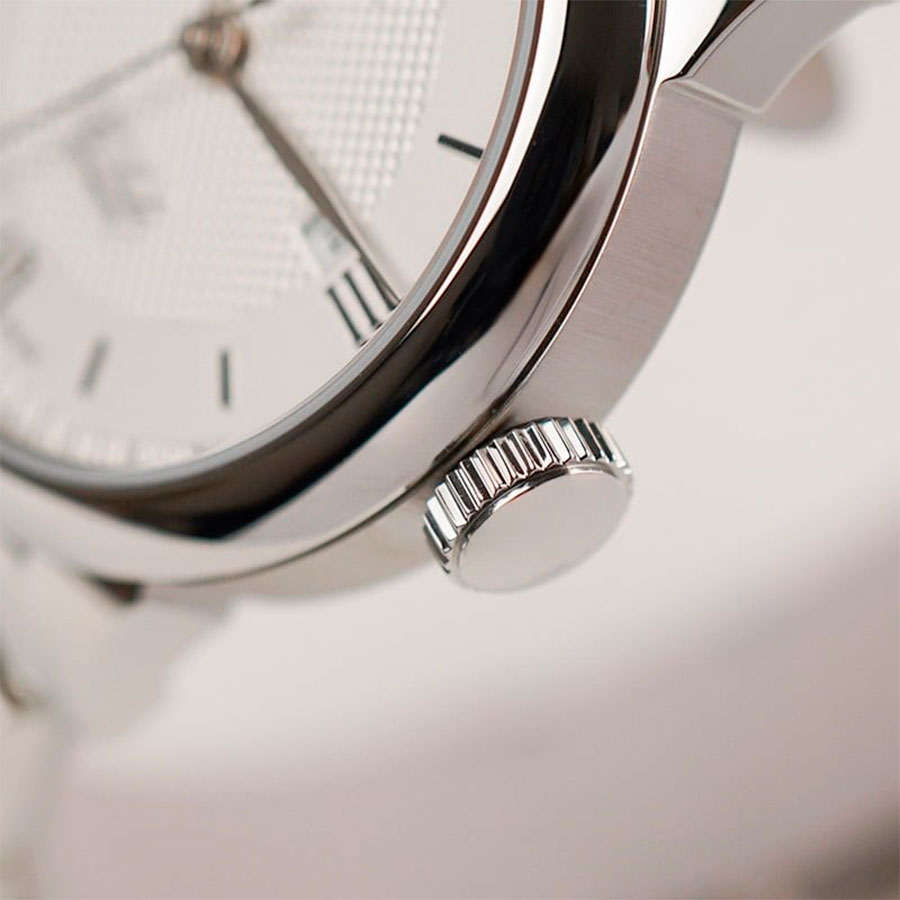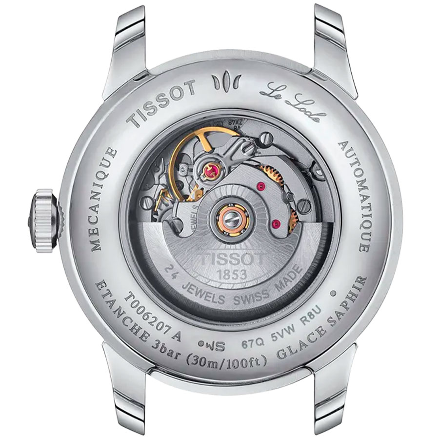 Корпус выполнен из нержавеющей стали, браслет также стальной, что обеспечивает долговечность и износостойкость. Серый циферблат украшен гильоше-декором и защищён сапфировым стеклом с антибликовым покрытием, устойчивым к царапинам. Прозрачная завинчивающаяся задняя крышка открывает вид на работу механизма, добавляя модели особого шарма.
