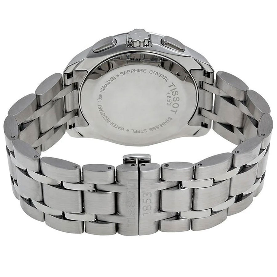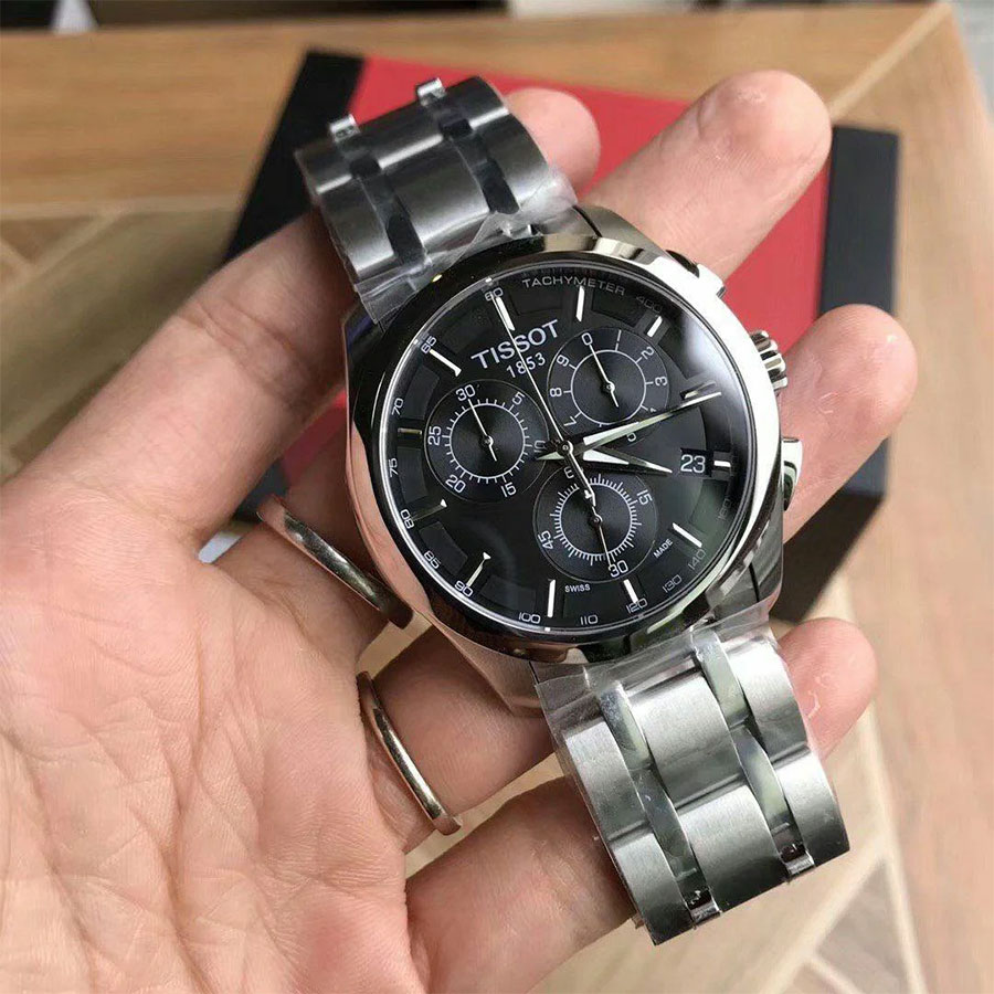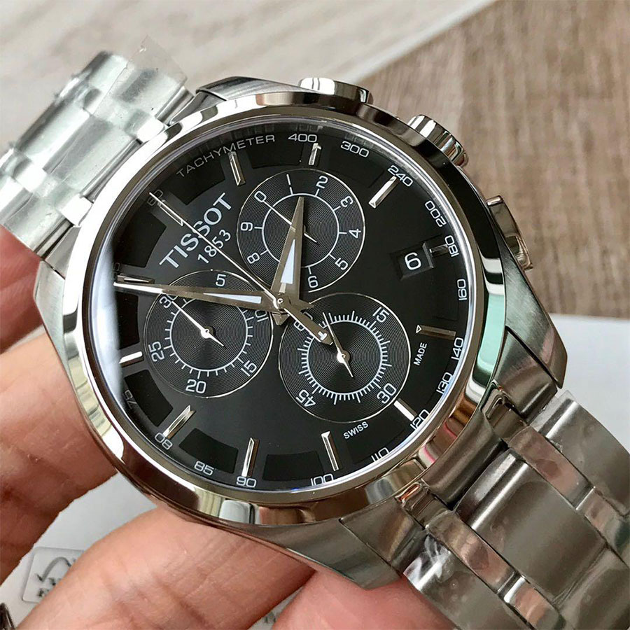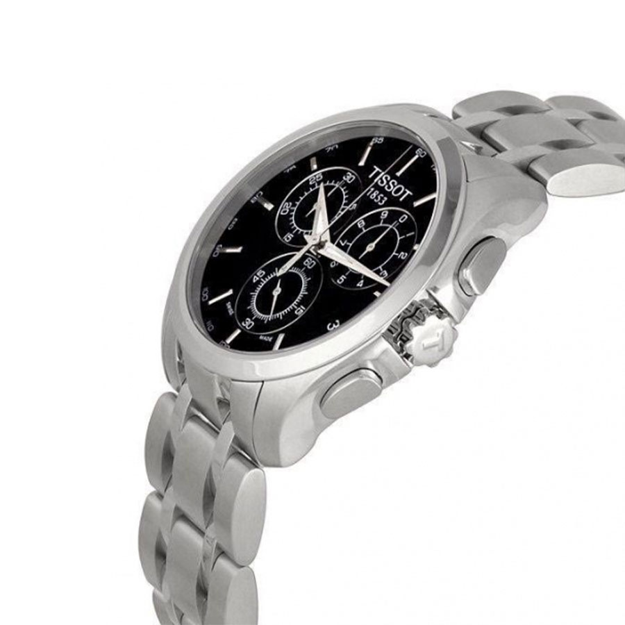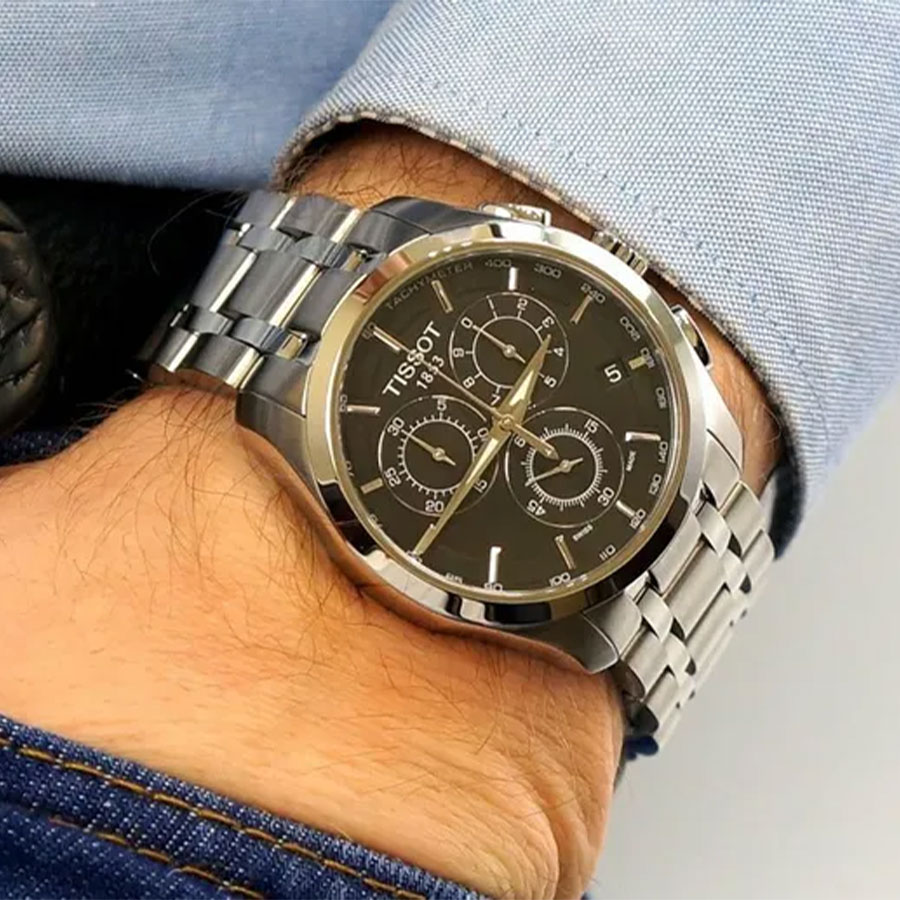 Мужские кварцевые наручные часы с хронографом (секундомером) TISSOT Couturier Chronograph T035.617.11.051.00 коллекции T Classic. Калибр механизма — ETA G10.211. На данной модели отображается текущая дата. Секундомер может отсчитывать до 29 минут 59 секунд. На циферблате присутсвует шкала тахиметра для измерения средней скорости движения. Стрелки покрыты люминесцентным напылением (светятся в темноте). Сапфировое стекло с антибликовым покрытием, устойчивое к появлению царапин. Завинчивающаяся задняя крышка. Стальной браслет. Водонепроницаемость WR100 (10 атм). Размеры корпуса: (ШxТ) 41x11 мм. Гарантийный срок — 3 года (1 год от производителя + 2 года от магазина).