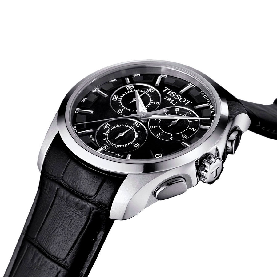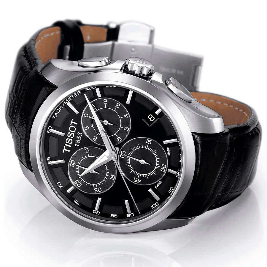 Мужские кварцевые наручные часы с хронографом (секундомером) TISSOT Couturier Chronograph T035.617.16.051.00 коллекции T Classic. Калибр механизма — ETA G10.211. На данной модели отображается текущая дата. Секундомер может отсчитывать до 29 минут 59 секунд. На циферблате присутсвует шкала тахиметра для измерения средней скорости движения. Стрелки покрыты люминесцентным напылением (светятся в темноте). Сапфировое стекло с антибликовым покрытием, устойчивое к появлению царапин. Завинчивающаяся задняя крышка. Кожаный ремешок. Водонепроницаемость WR100 (10 атм). Размеры корпуса: (ШxТ) 41x11 мм. Гарантийный срок — 3 года (1 год от производителя + 2 года от магазина).