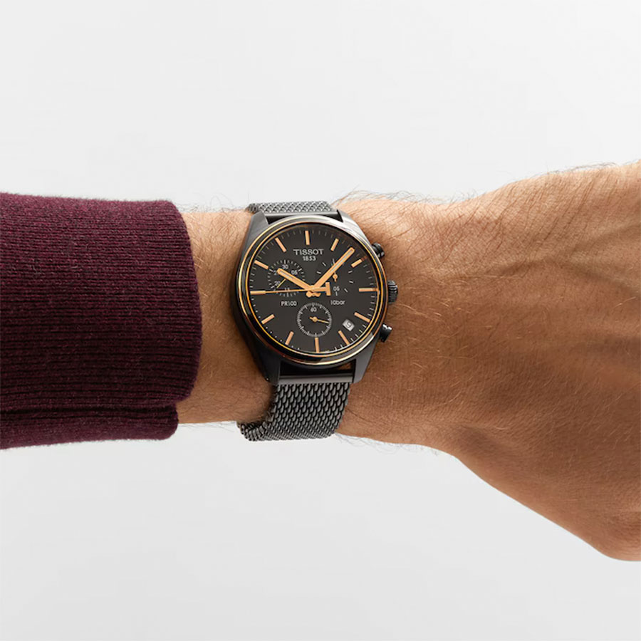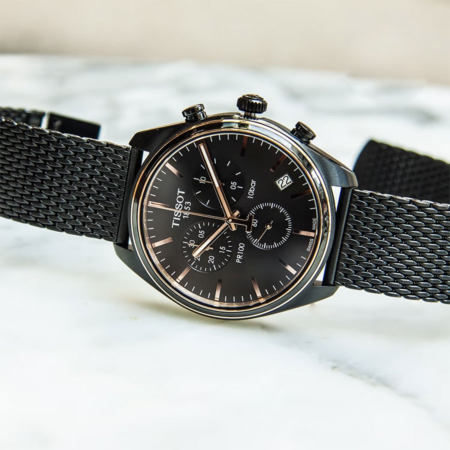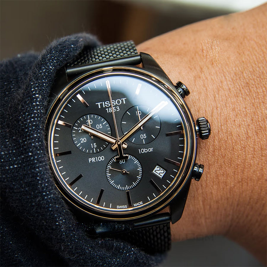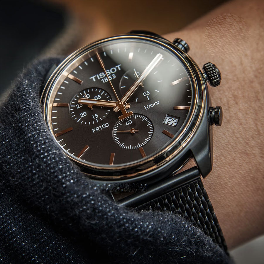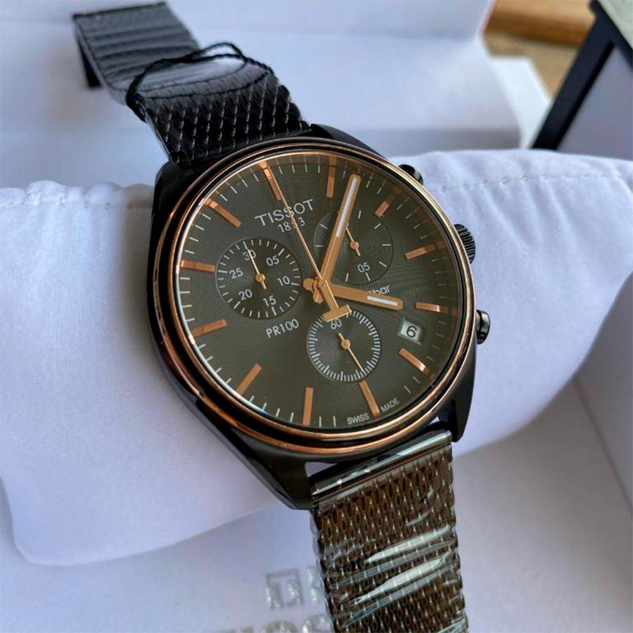 Мужские кварцевые наручные часы с хронографом (секундомером) TISSOT PR 100 Chronograph T101.417.23.061.00 коллекции T Classic. Калибр механизма — ETA G10.211. На данной модели отображается текущая дата. Секундомер может отсчитывать до 29 минут 59 секунд. Сапфировое стекло с антибликовым покрытием, устойчивое к появлению царапин. Стрелки покрыты люминесцентным напылением (светятся в темноте). Стальной браслет миланского плетения. На корпус и браслет нанесено стойкое PVD покрытие. Водонепроницаемость WR100 (10 атм). Размеры корпуса: (ШxТ) 41x10 мм. Гарантийный срок — 3 года (1 год от производителя + 2 года от магазина).