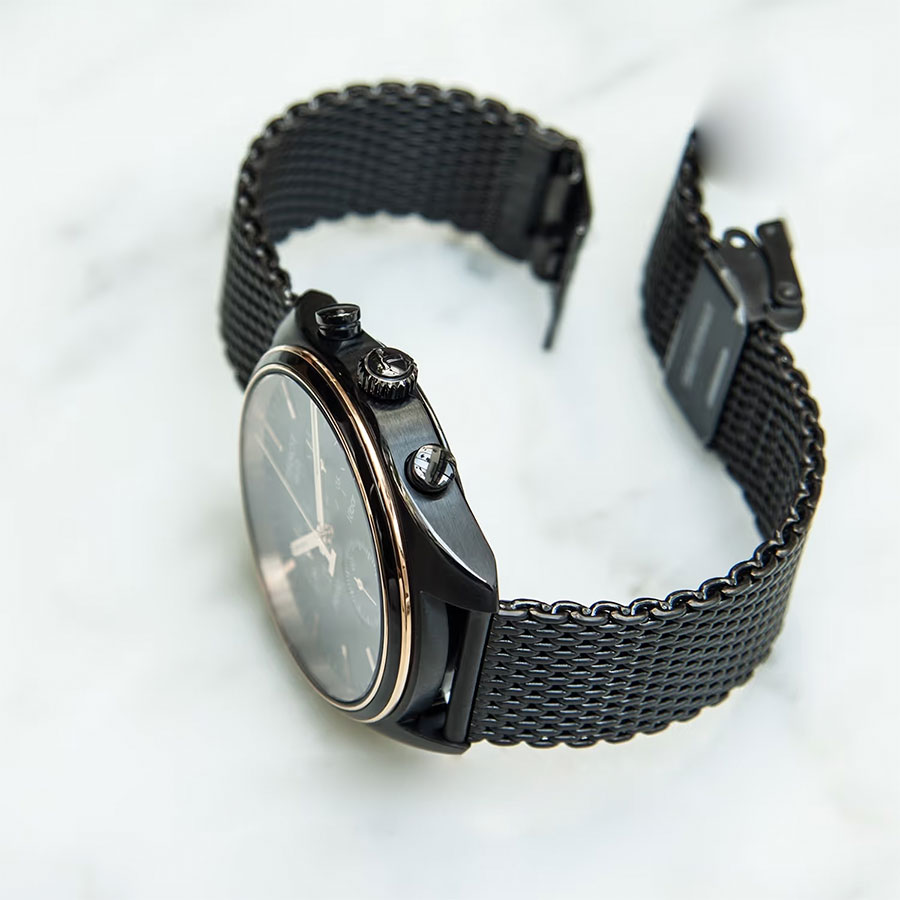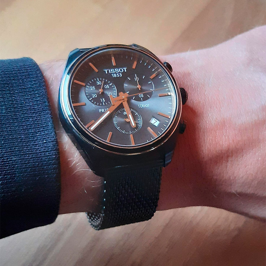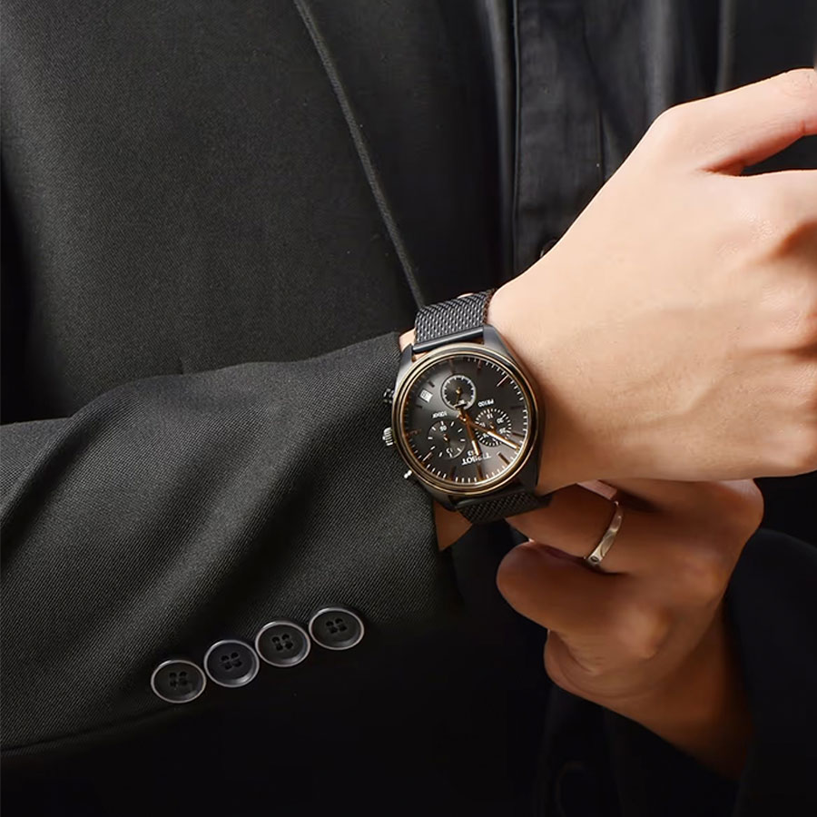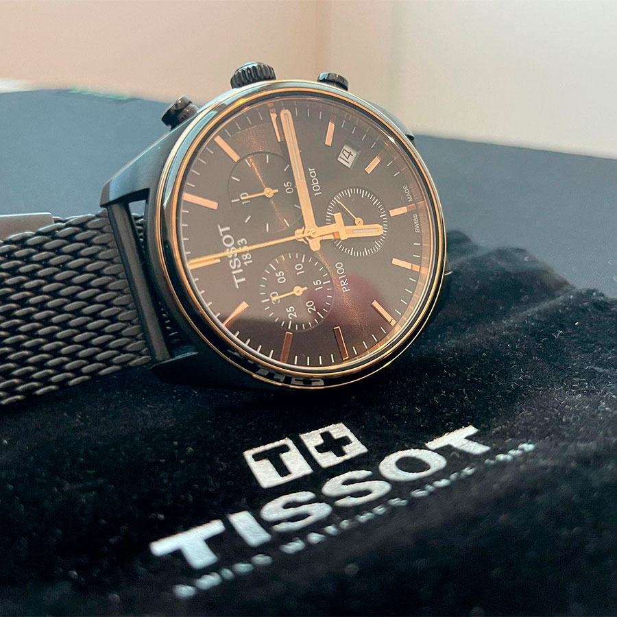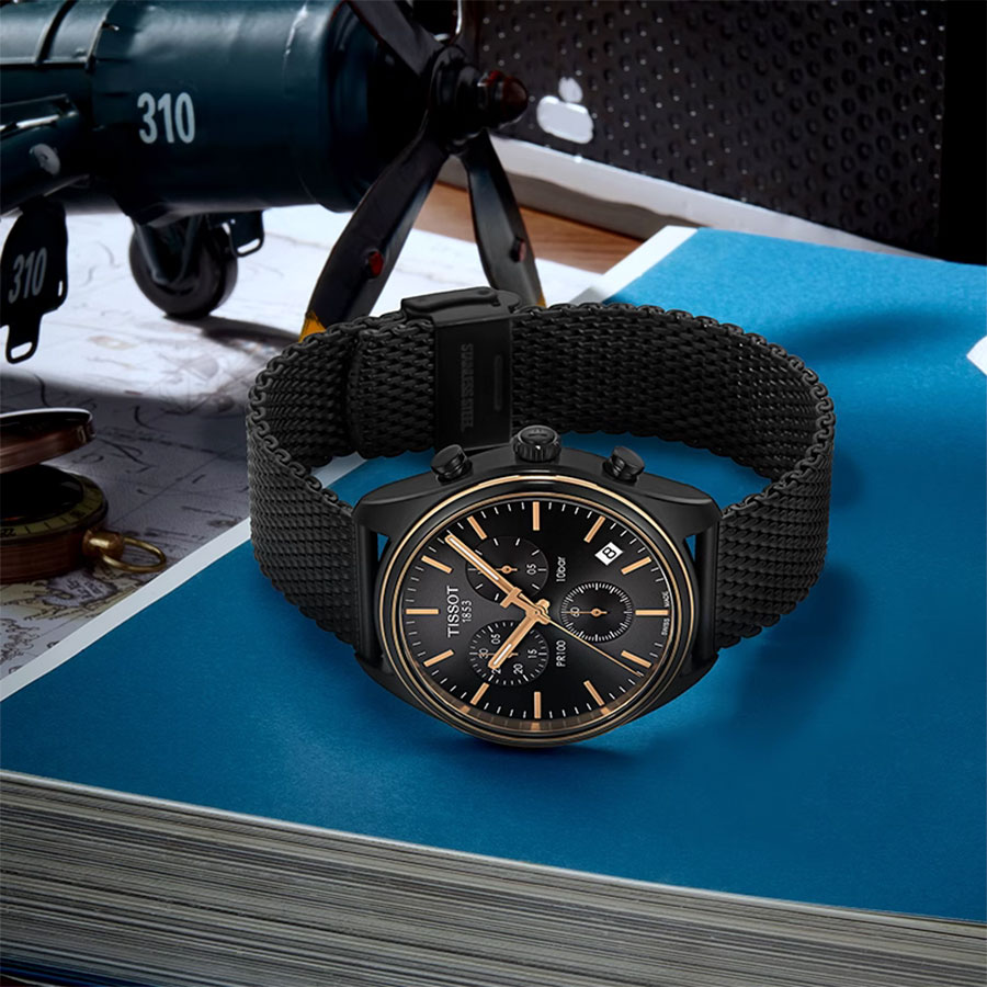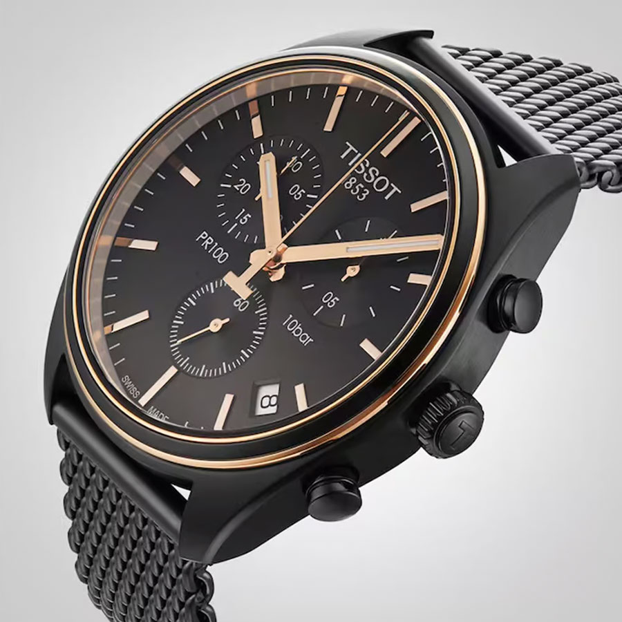 Мужские кварцевые наручные часы с хронографом (секундомером) TISSOT PR 100 Chronograph T101.417.23.061.00 коллекции T Classic. Калибр механизма — ETA G10.211. На данной модели отображается текущая дата. Секундомер может отсчитывать до 29 минут 59 секунд. Сапфировое стекло с антибликовым покрытием, устойчивое к появлению царапин. Стрелки покрыты люминесцентным напылением (светятся в темноте). Стальной браслет миланского плетения. На корпус и браслет нанесено стойкое PVD покрытие. Водонепроницаемость WR100 (10 атм). Размеры корпуса: (ШxТ) 41x10 мм. Гарантийный срок — 3 года (1 год от производителя + 2 года от магазина).