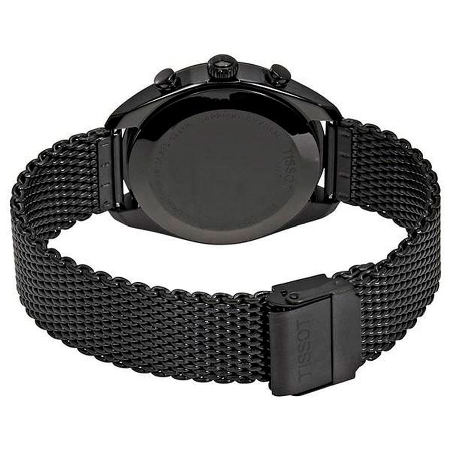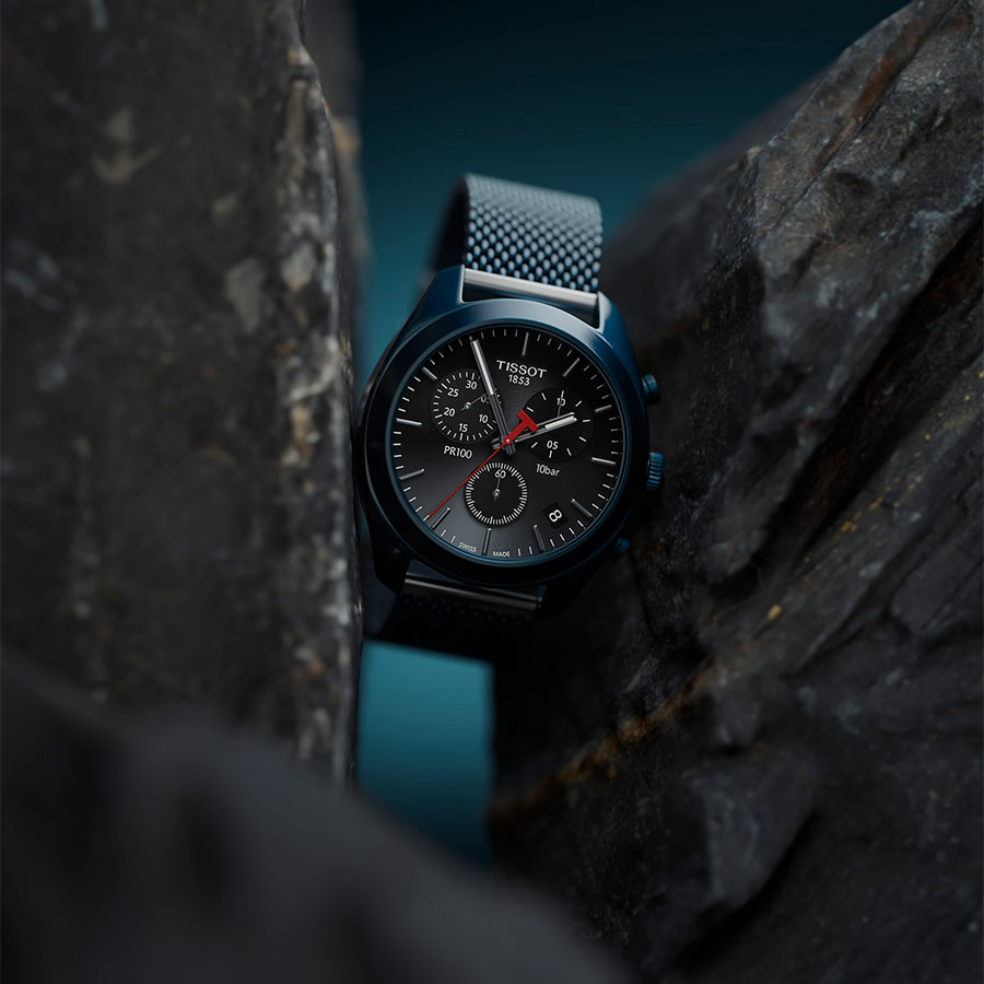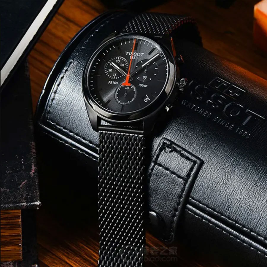 Мужские кварцевые наручные часы с хронографом (секундомером) TISSOT PR 100 Chronograph T101.417.33.051.00 коллекции T Classic. Калибр механизма — ETA G10.211. На данной модели отображается текущая дата. Секундомер может отсчитывать до 29 минут 59 секунд. Сапфировое стекло с антибликовым покрытием, устойчивое к появлению царапин. Стрелки покрыты люминесцентным напылением (светятся в темноте). Стальной браслет миланского плетения. На корпус и браслет нанесено стойкое PVD покрытие. Водонепроницаемость WR100 (10 атм). Размеры корпуса: (ШxТ) 41x10 мм. Гарантийный срок — 3 года (1 год от производителя + 2 года от магазина).