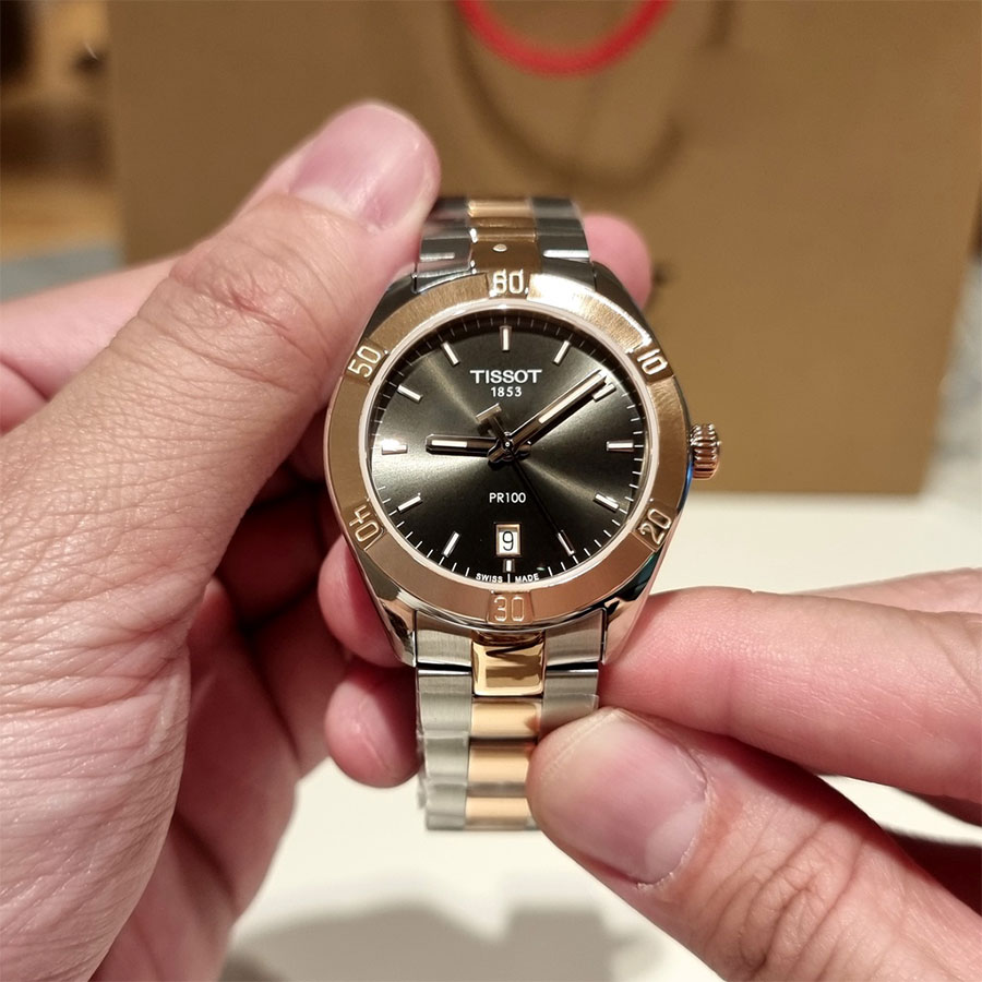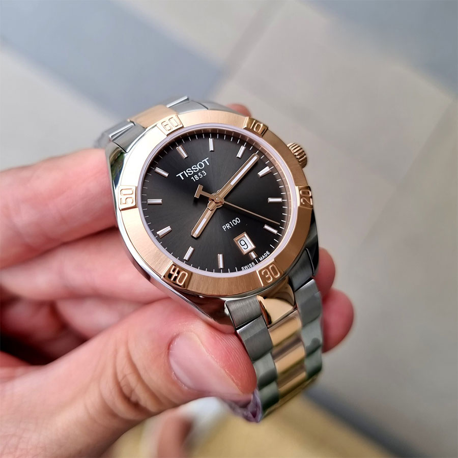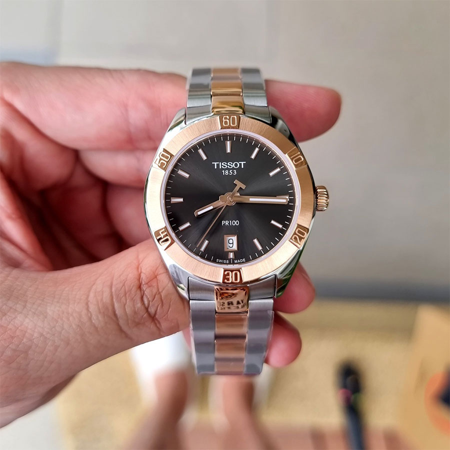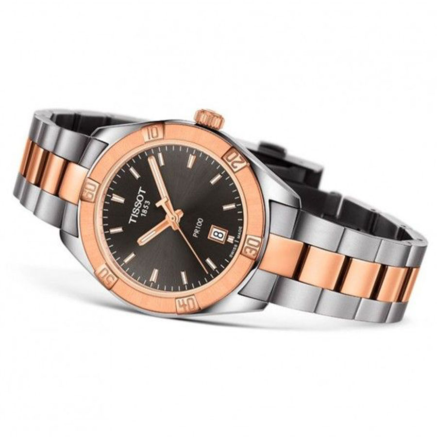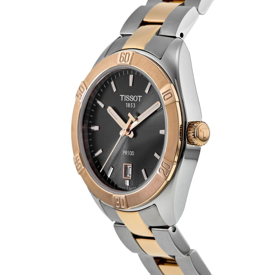 Женские кварцевые наручные часы TISSOT PR 100 Sport Chic T101.910.22.061.00 коллекции T Classic. Калибр механизма — ETA 955.412. На данной модели отображается текущая дата. Стрелки и метки покрыты люминесцентным напылением (светятся в темноте). Сапфировое стекло с антибликовым покрытием, устойчивое к появлению царапин. Стальной браслет. На корпус и браслет частично нанесено стойкое PVD покрытие. Водонепроницаемость WR100 (10 атм). Размеры корпуса: (ШxТ) 36x9 мм. Гарантийный срок — 3 года (1 год от производителя + 2 года от магазина).