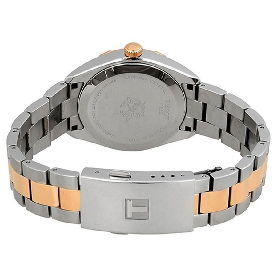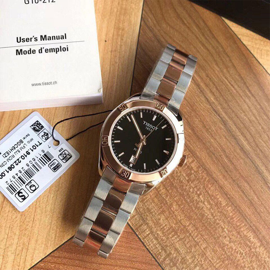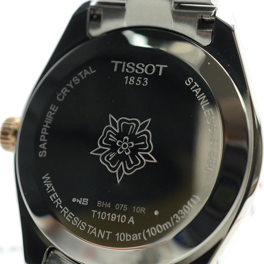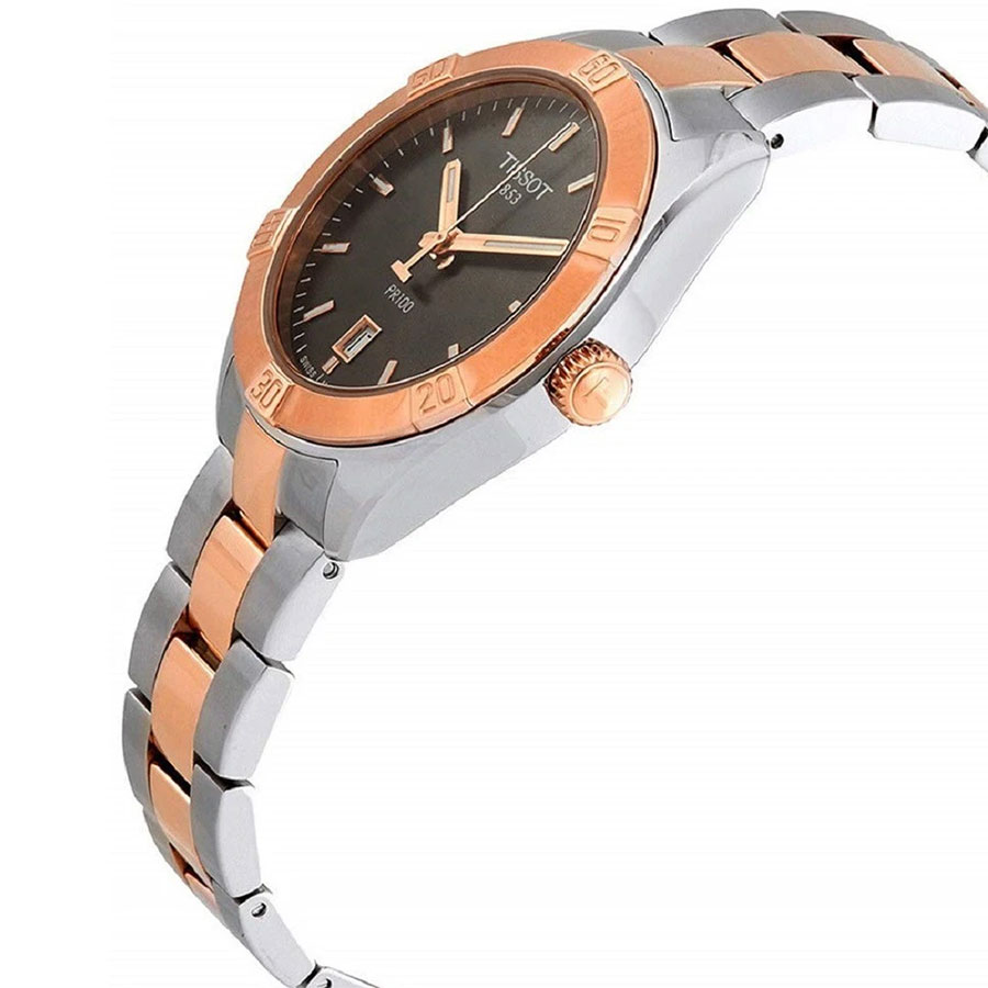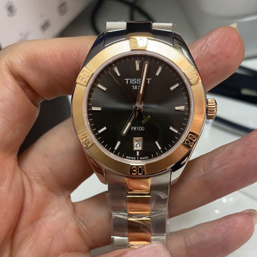 Женские кварцевые наручные часы TISSOT PR 100 Sport Chic T101.910.22.061.00 коллекции T Classic. Калибр механизма — ETA 955.412. На данной модели отображается текущая дата. Стрелки и метки покрыты люминесцентным напылением (светятся в темноте). Сапфировое стекло с антибликовым покрытием, устойчивое к появлению царапин. Стальной браслет. На корпус и браслет частично нанесено стойкое PVD покрытие. Водонепроницаемость WR100 (10 атм). Размеры корпуса: (ШxТ) 36x9 мм. Гарантийный срок — 3 года (1 год от производителя + 2 года от магазина).