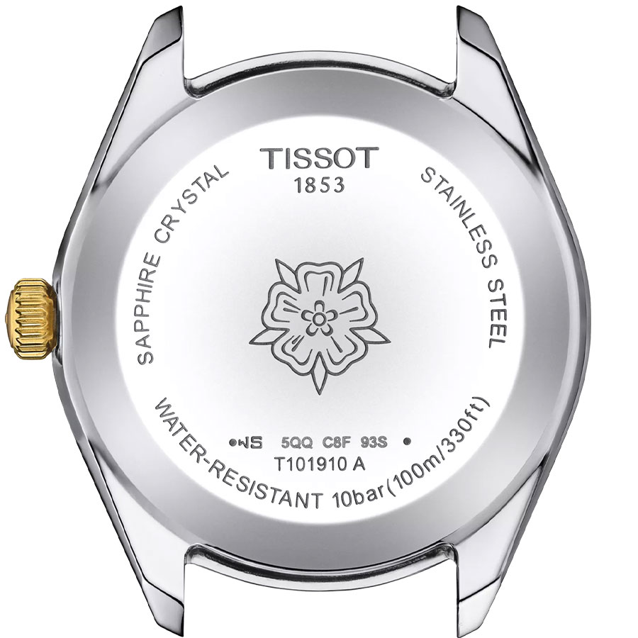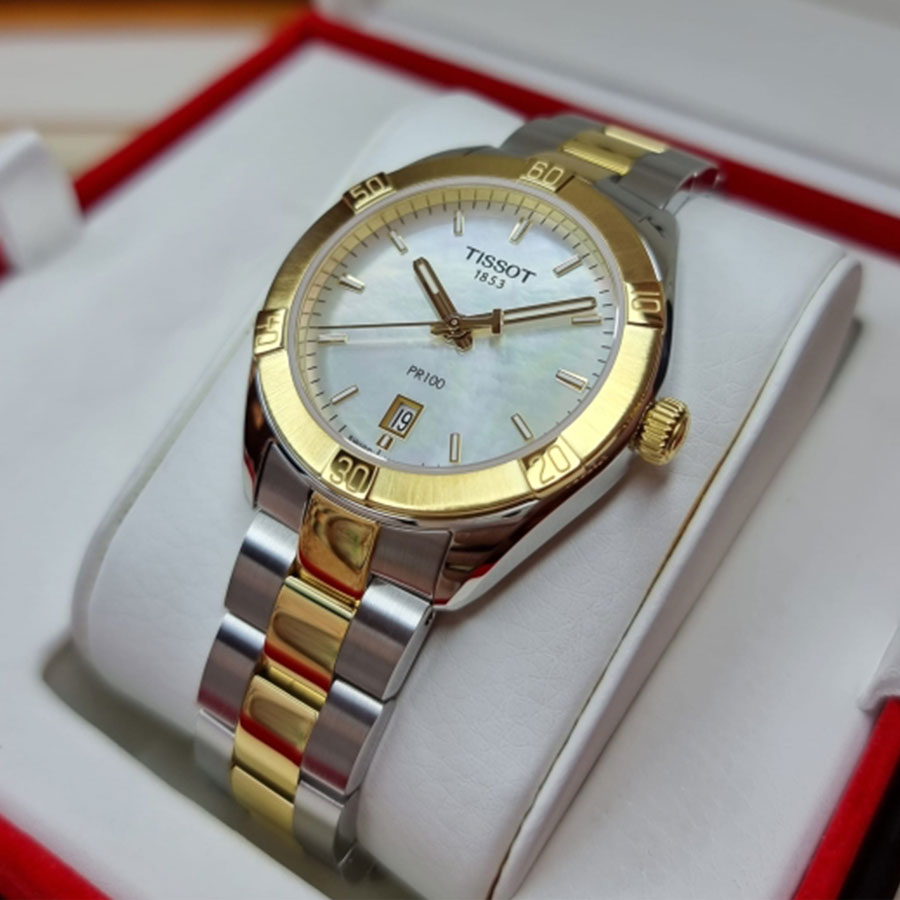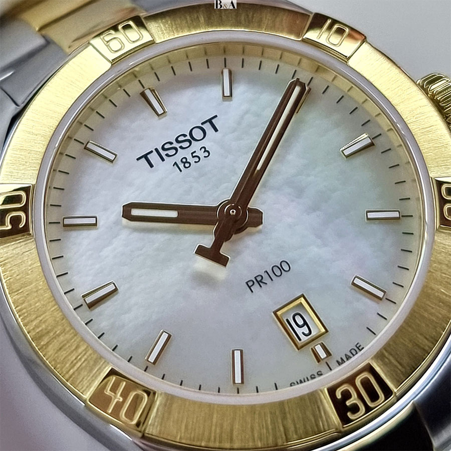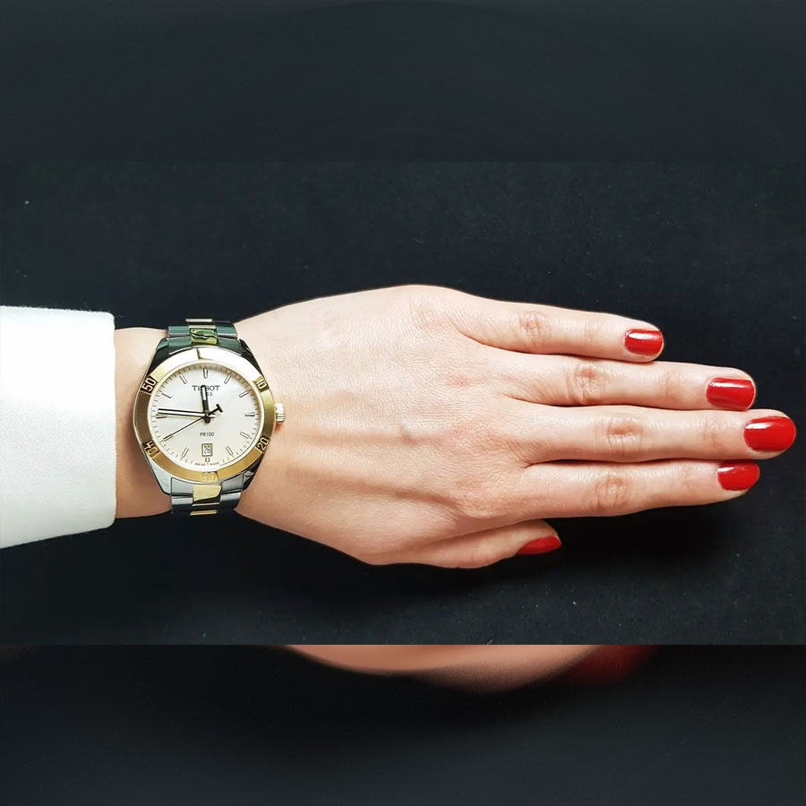 Женские кварцевые наручные часы TISSOT PR 100 Sport Chic T101.910.22.111.00 коллекции T Classic. Калибр механизма — ETA 955.412. На данной модели отображается текущая дата. Стрелки и метки покрыты люминесцентным напылением (светятся в темноте). Сапфировое стекло с антибликовым покрытием, устойчивое к появлению царапин. Стальной браслет. На корпус и браслет частично нанесено стойкое PVD покрытие. Водонепроницаемость WR100 (10 атм). Размеры корпуса: (ШxТ) 36x9 мм. Гарантийный срок — 3 года (1 год от производителя + 2 года от магазина).