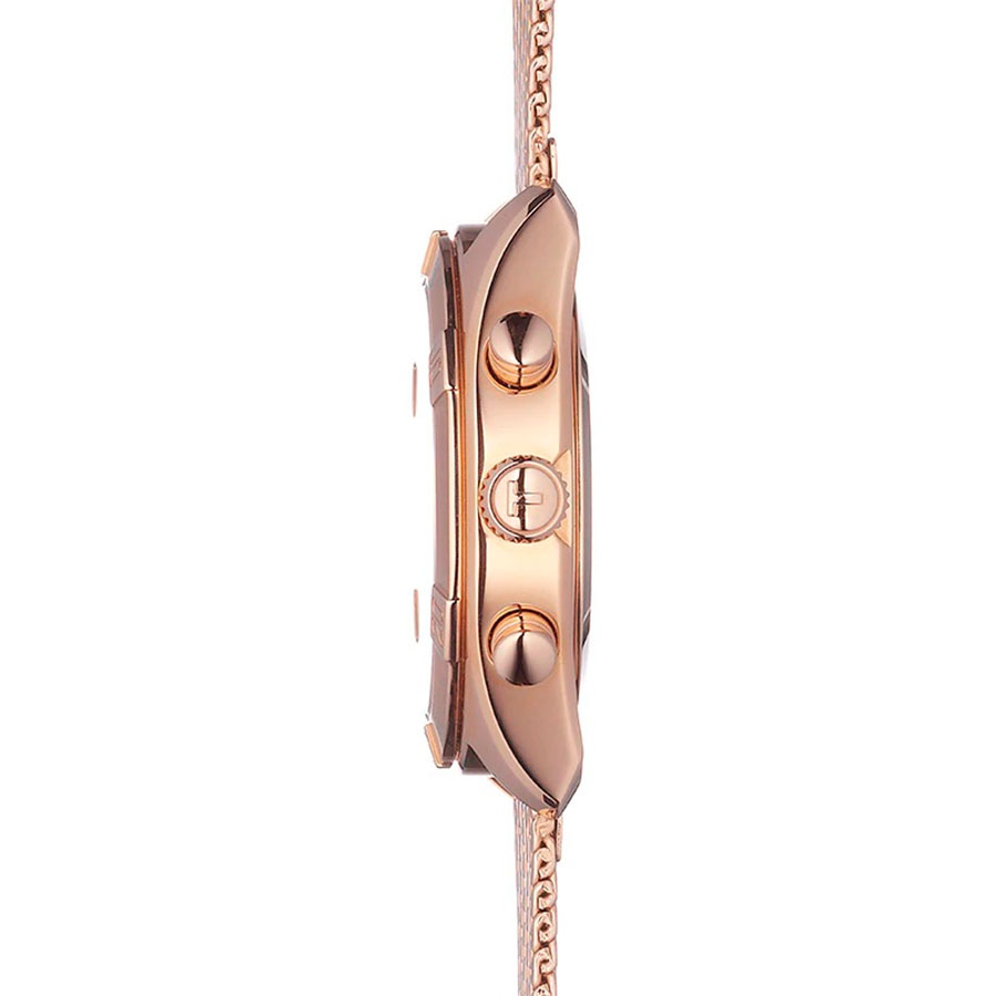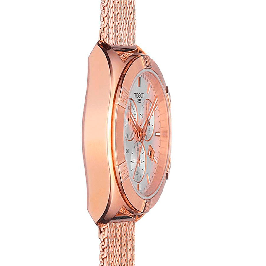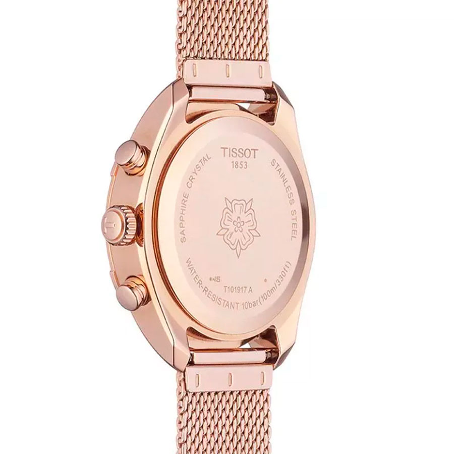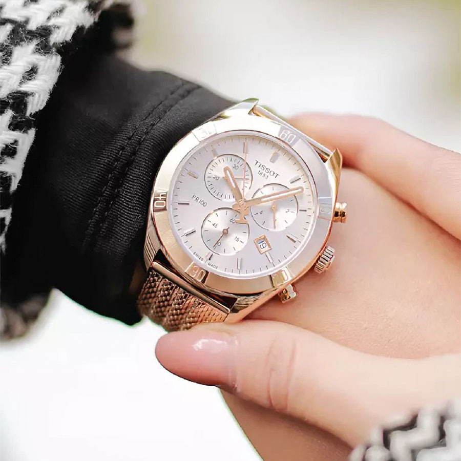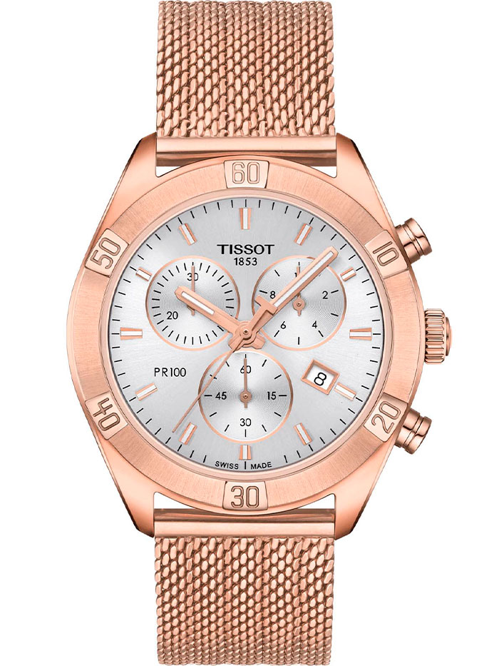 Женские кварцевые наручные часы с хронографом (секундомером) TISSOT PR 100 Sport Chic Chronograph T101.917.33.031.00 коллекции T Classic. Калибр механизма — ETA G15.212. На данной модели отображается текущая дата. Секундомер может отсчитывать до 29 минут 59 секунд. Стрелки и метки покрыты люминесцентным напылением (светятся в темноте). Сапфировое стекло с антибликовым покрытием, устойчивое к появлению царапин. Стальной браслет миланского плетения. На корпус и браслет нанесено стойкое PVD покрытие. Водонепроницаемость WR100 (10 атм). Размеры корпуса: (ШxТ) 38x10 мм. Гарантийный срок — 3 года (1 год от производителя + 2 года от магазина).