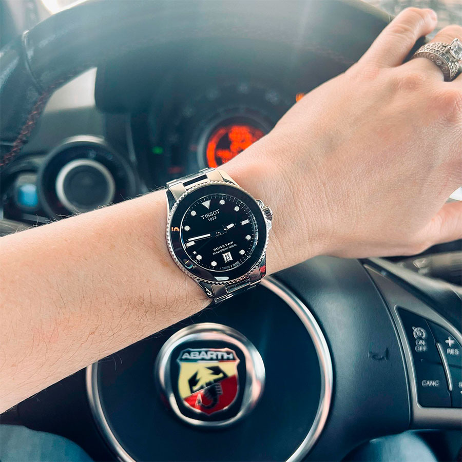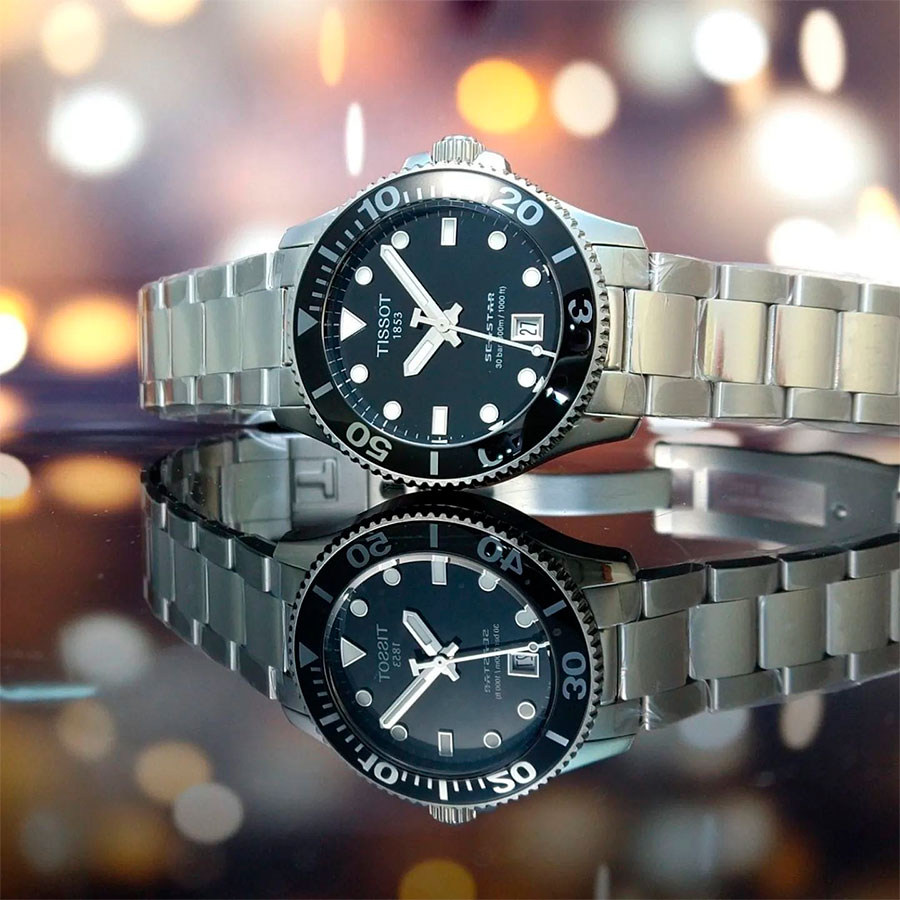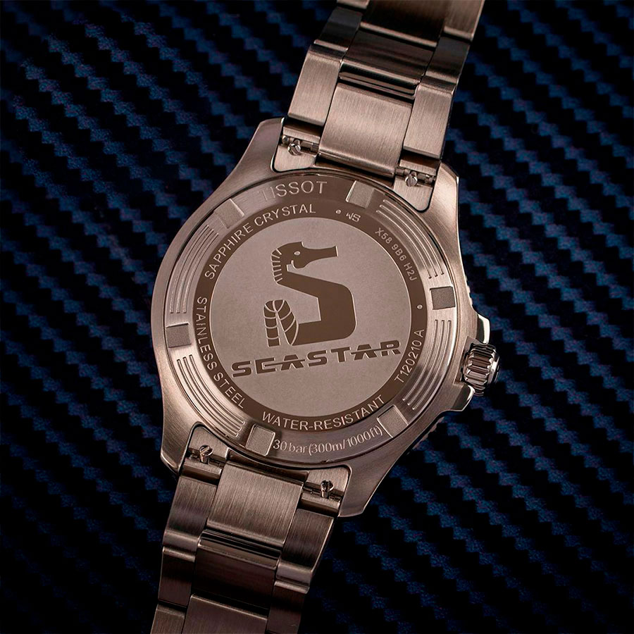 Кварцевые наручные часы TISSOT Seastar 1000 T120.210.11.051.00 коллекции T Sport. Калибр механизма — ETA F05.111. На данной модели отображается текущая дата. Стрелки и метки покрыты люминесцентным напылением Super-LumiNova® (светятся в темноте). Сапфировое стекло с антибликовым покрытием, устойчивое к появлению царапин. Завинчивающиеся заводная головка и задняя крышка. Однонаправленный вращающийся безель со вставкой из минерального стекла. Стальной браслет с системой быстрой замены и возможностью быстрого удлинения для удобного использования с гидрокостюмом. В комплекте идет дополнительный силиконовый ремешок. Водонепроницаемость WR300 (30 атм). Размеры корпуса: (ШxТ) 36x9.7 мм. Гарантийный срок — 3 года (1 год от производителя + 2 года от магазина).
