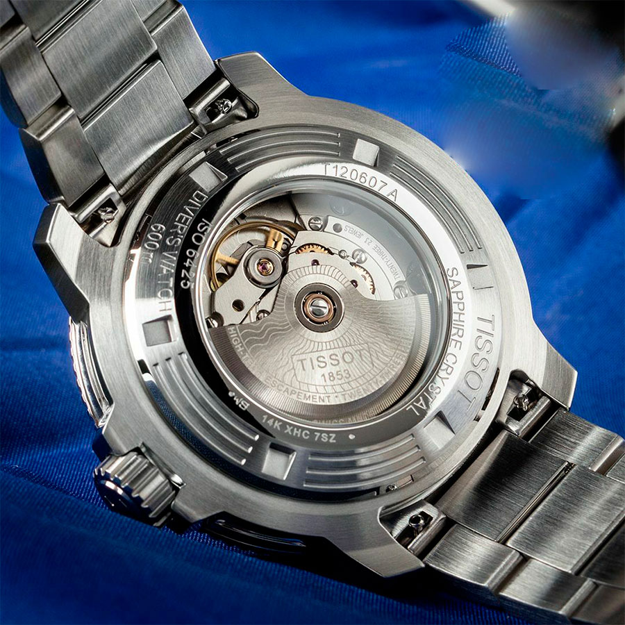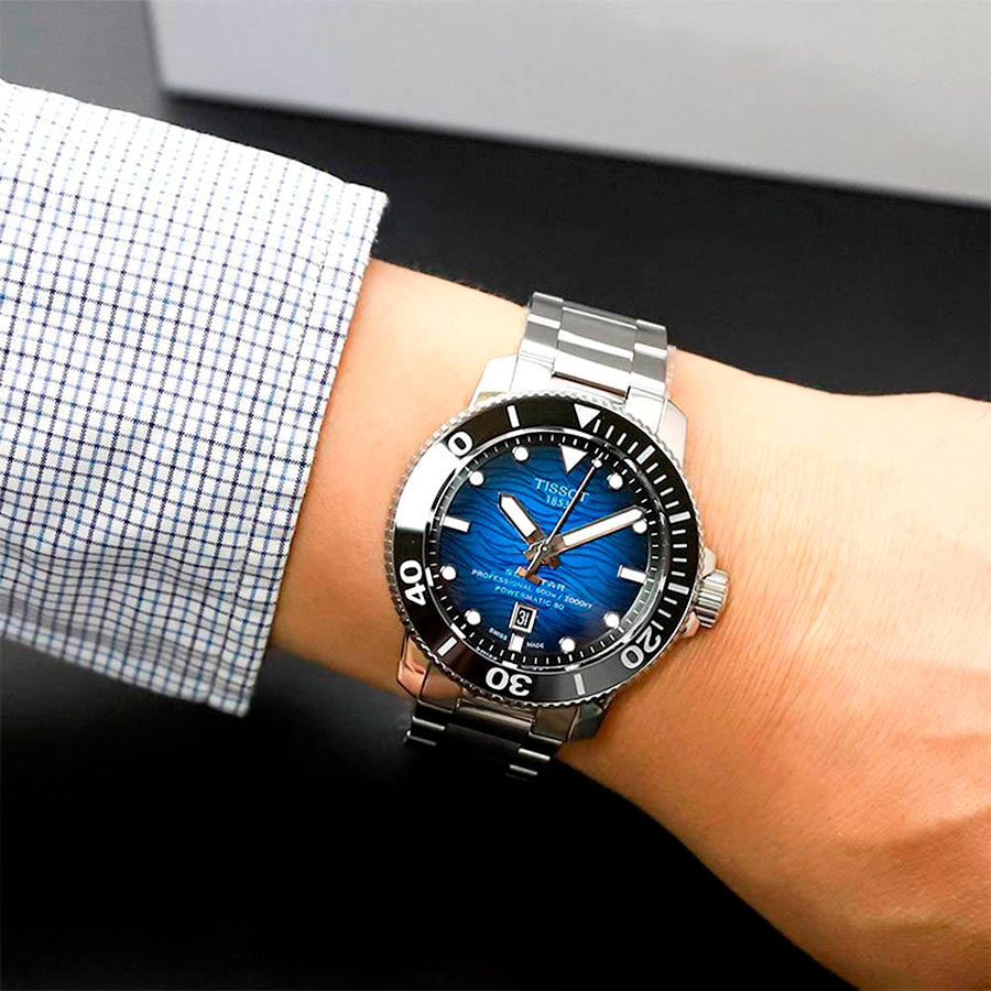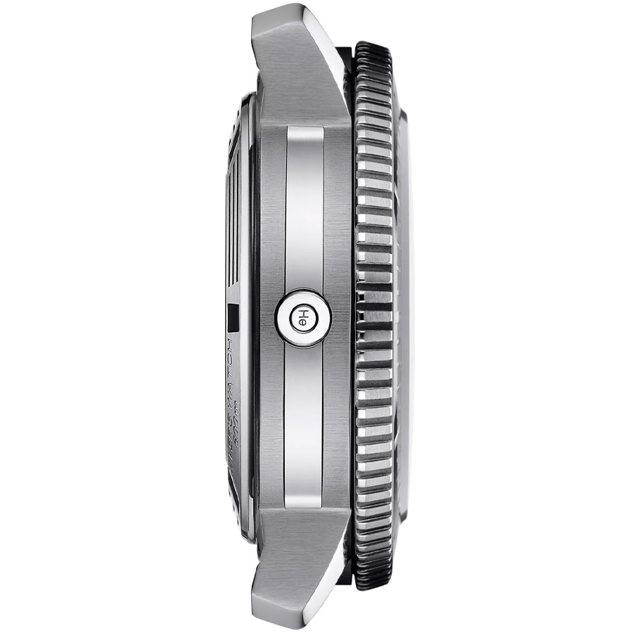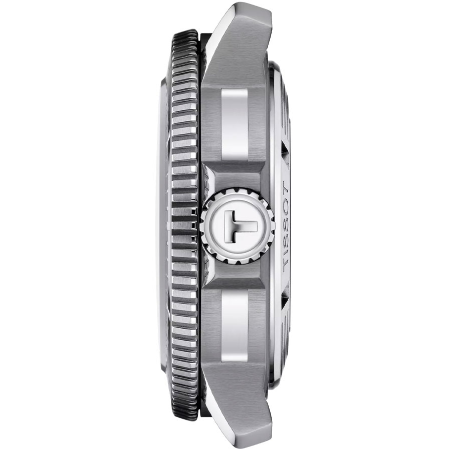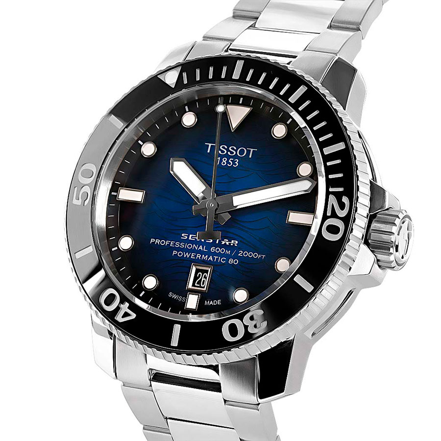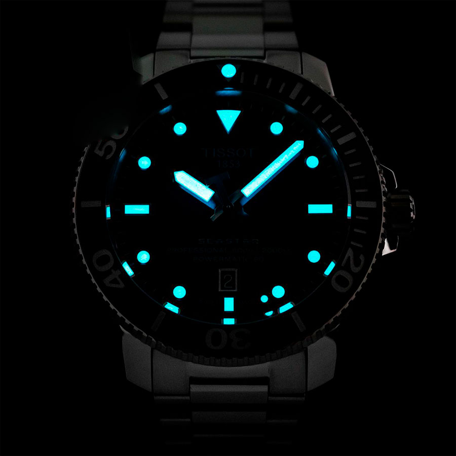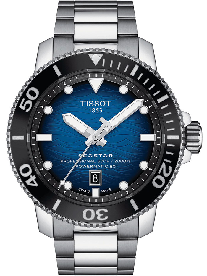 Мужские механические наручные часы TISSOT Seastar 2000 Professional Powermatic 80 T120.607.11.041.01 коллекции T Sport с автоподзаводом и возможностью ручного завода. Калибр механизма — Powermatic 80.111. В механизме часов использована запатентованная балансирная пружина Nivachron, благодаря чему запас хода значительно увеличен и составляет не менее 80-ти часов. Количество камней - 23. Функция стоп-секунда (остановка секундной стрелки для установки точного времени). На данной модели отображается текущая дата. Стрелки и метки покрыты люминесцентным напылением Super-LumiNova® (светятся в темноте). Сапфировое стекло с антибликовым покрытием, устойчивое к появлению царапин. Прозрачная задняя крышка. Завинчивающиеся заводная головка и задняя крышка. Однонаправленный вращающийся безель с керамической вставкой. Стальной браслет с возможностью быстрого удлинения для удобного использования с гидрокостюмом. Данная модель обладает высокой степенью водонепроницаемости WR600 (60 атм), имеет гелиевый клапан, подходит для глубокого погружения под воду и соответствует стандарту дайверских часов ISO 6425. Размеры корпуса: (ШxТ) 46x16.3 мм. Гарантийный срок — 3 года (1 год от производителя + 2 года от магазина).