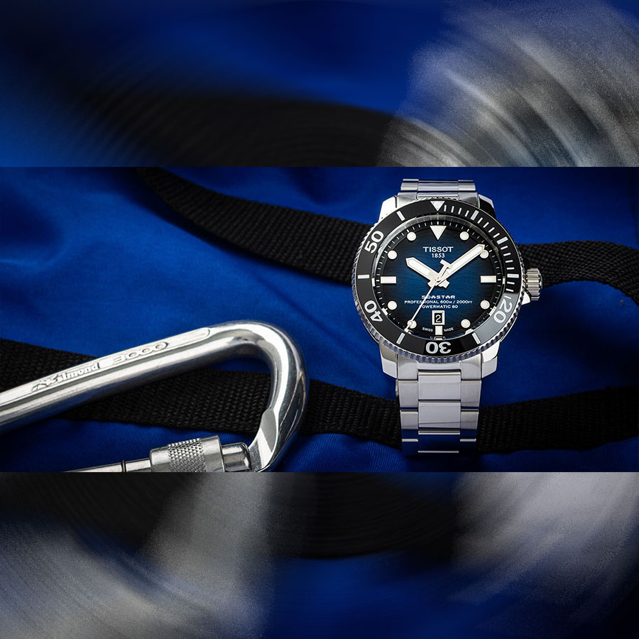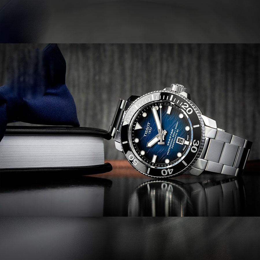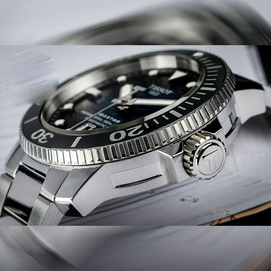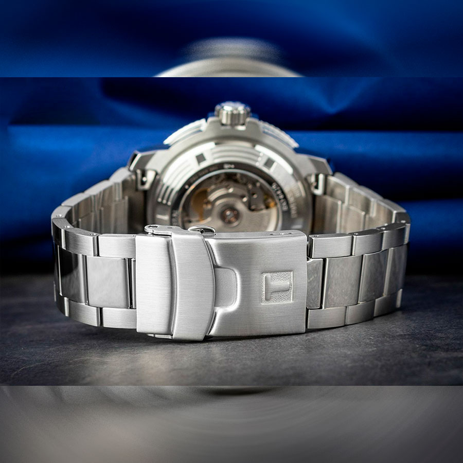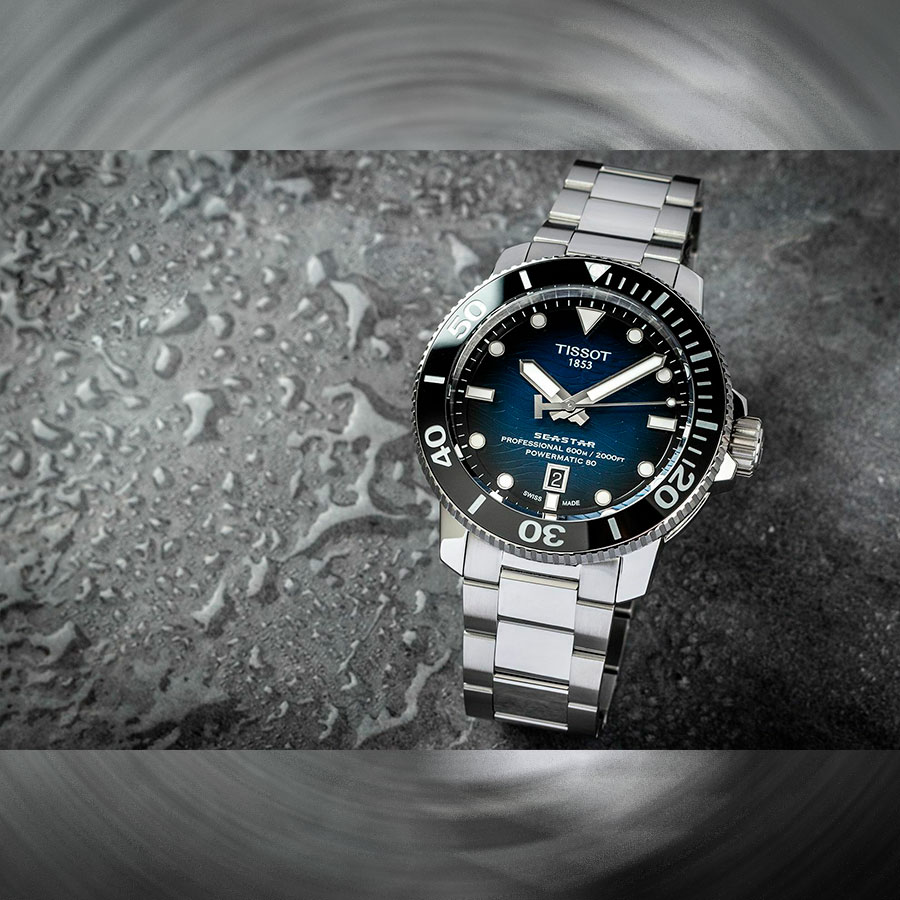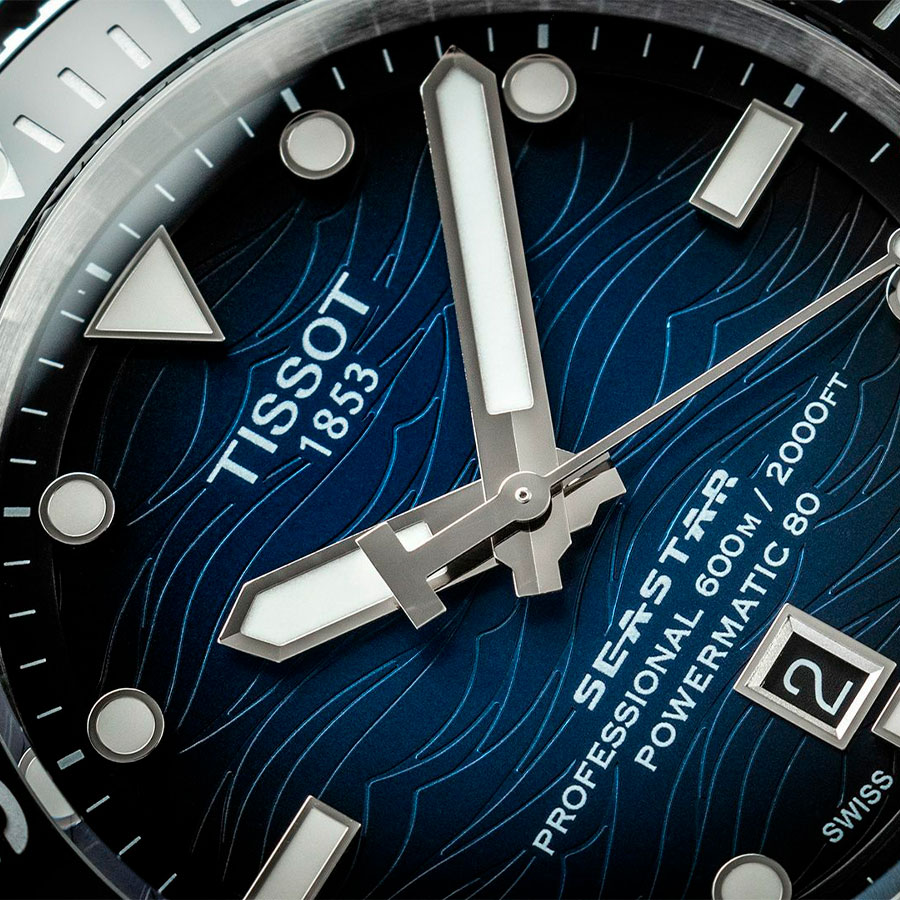 Мужские механические наручные часы TISSOT Seastar 2000 Professional Powermatic 80 T120.607.11.041.01 коллекции T Sport с автоподзаводом и возможностью ручного завода. Калибр механизма — Powermatic 80.111. В механизме часов использована запатентованная балансирная пружина Nivachron, благодаря чему запас хода значительно увеличен и составляет не менее 80-ти часов. Количество камней - 23. Функция стоп-секунда (остановка секундной стрелки для установки точного времени). На данной модели отображается текущая дата. Стрелки и метки покрыты люминесцентным напылением Super-LumiNova® (светятся в темноте). Сапфировое стекло с антибликовым покрытием, устойчивое к появлению царапин. Прозрачная задняя крышка. Завинчивающиеся заводная головка и задняя крышка. Однонаправленный вращающийся безель с керамической вставкой. Стальной браслет с возможностью быстрого удлинения для удобного использования с гидрокостюмом. Данная модель обладает высокой степенью водонепроницаемости WR600 (60 атм), имеет гелиевый клапан, подходит для глубокого погружения под воду и соответствует стандарту дайверских часов ISO 6425. Размеры корпуса: (ШxТ) 46x16.3 мм. Гарантийный срок — 3 года (1 год от производителя + 2 года от магазина).