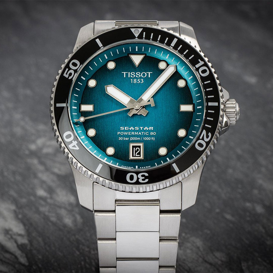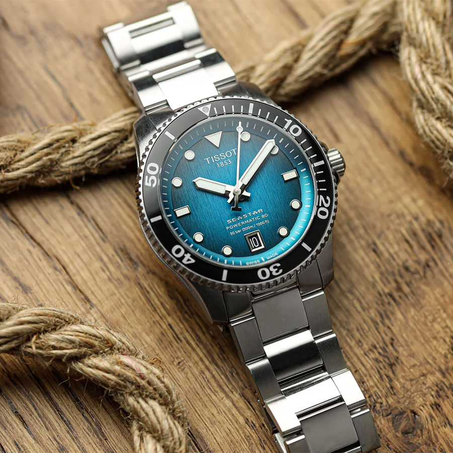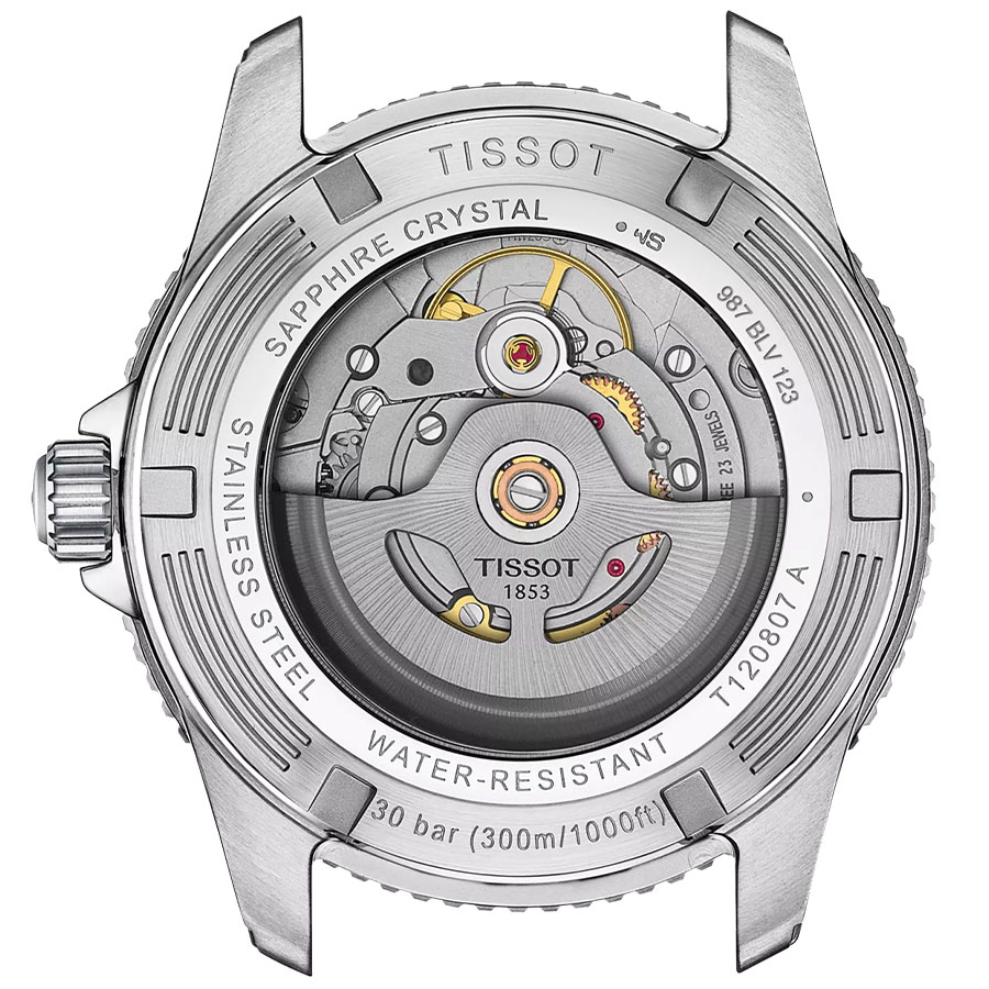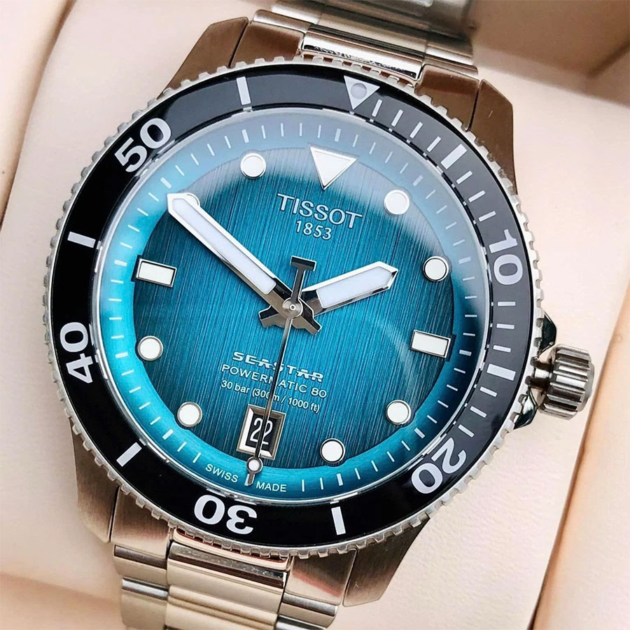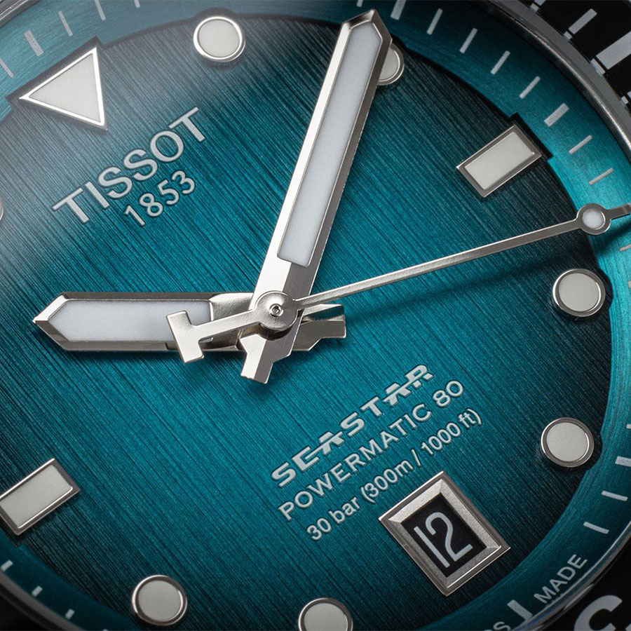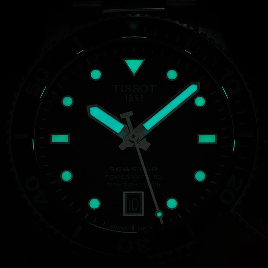 Мужские механические наручные часы TISSOT Seastar 1000 Powermatic 80 T120.807.11.091.00 коллекции T Sport с автоподзаводом и возможностью ручного завода. Калибр механизма — Powermatic 80.111. В механизме часов использована запатентованная балансирная пружина Nivachron, благодаря чему запас хода значительно увеличен и составляет не менее 80-ти часов. Количество камней - 23. Функция стоп-секунда (остановка секундной стрелки для установки точного времени). На данной модели отображается текущая дата. Стрелки и метки покрыты люминесцентным напылением Super-LumiNova® (светятся в темноте). Сапфировое стекло с антибликовым покрытием, устойчивое к появлению царапин. Прозрачная задняя крышка. Завинчивающиеся заводная головка и задняя крышка. Однонаправленный вращающийся безель с вставкой из минерального стекла. Стальной браслет с системой быстрой замены. Водонепроницаемость WR300 (30 атм). Размеры корпуса: (ШxТ) 40x12.5 мм. Гарантийный срок — 3 года (1 год от производителя + 2 года от магазина).