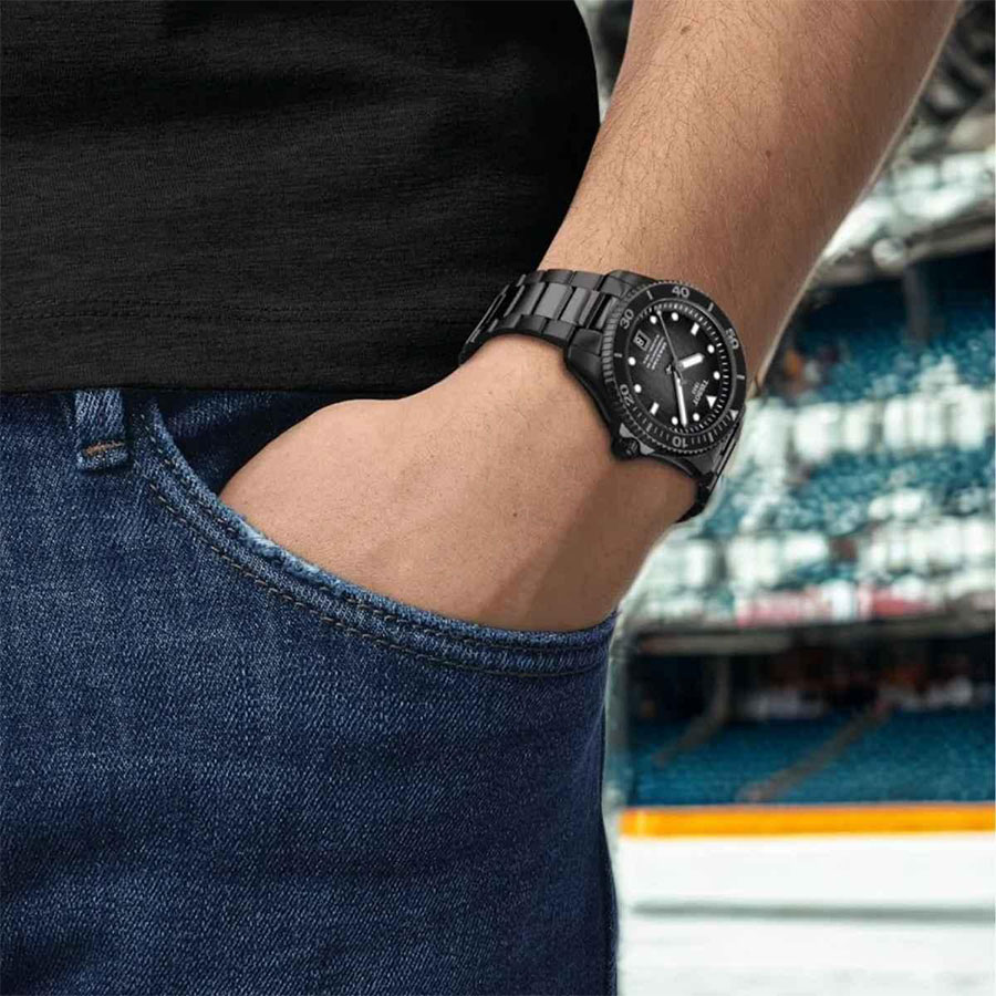 Корпус выполнен из нержавеющей стали с PVD-покрытием, браслет также изготовлен из стали и оснащён системой быстрой замены. Циферблат оформлен в серо-чёрном цвете, а стрелки и метки покрыты люминесцентным составом Super-LumiNova®, что обеспечивает отличную читаемость даже в темноте. Прозрачная задняя крышка даёт возможность наблюдать за работой механизма. Сапфировое стекло с антибликовым покрытием защищает часы от царапин.