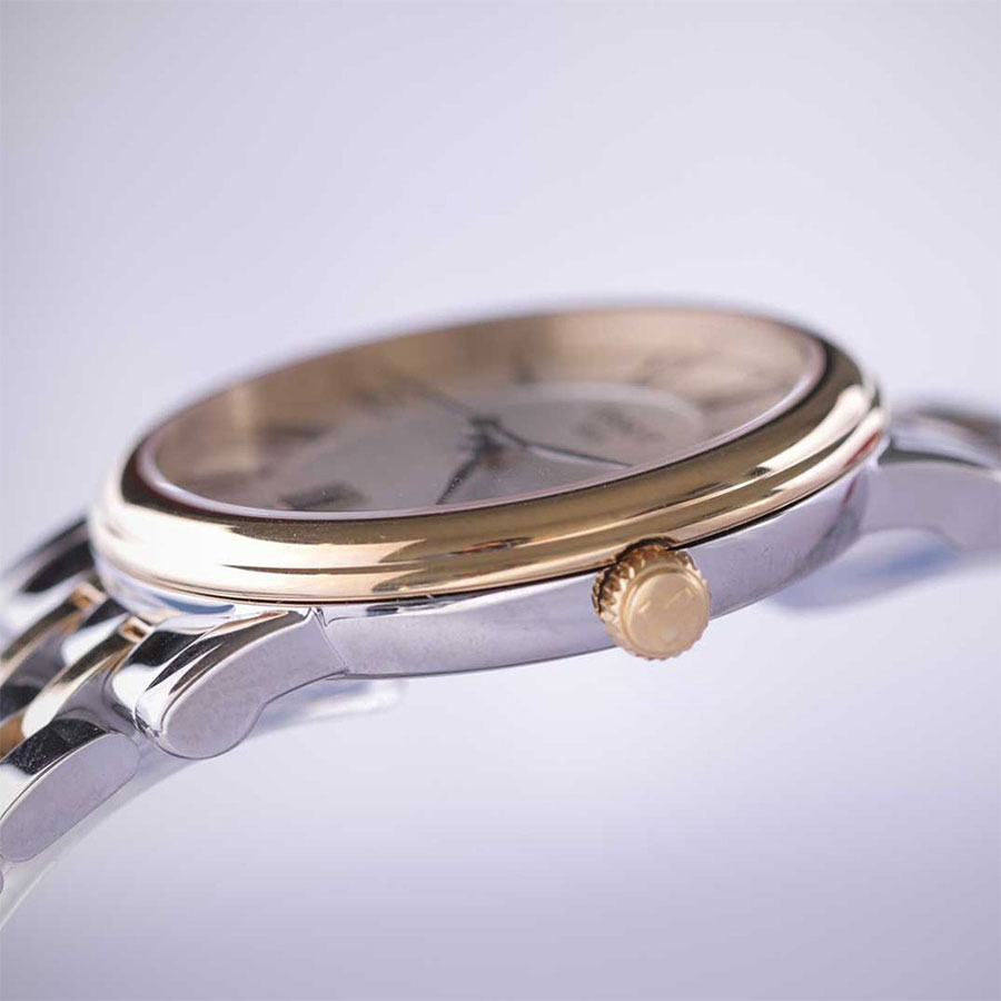 Корпус диаметром 30 мм. и толщиной всего 6,7 мм. придаёт часам утончённый и элегантный вид. Серебристый циферблат защищён сапфировым стеклом с антибликовым покрытием, устойчивым к появлению царапин. Стальной браслет гармонично сочетается с корпусом, а частичное PVD-покрытие добавляет благородный двухцветный акцент и защищает поверхность от износа.