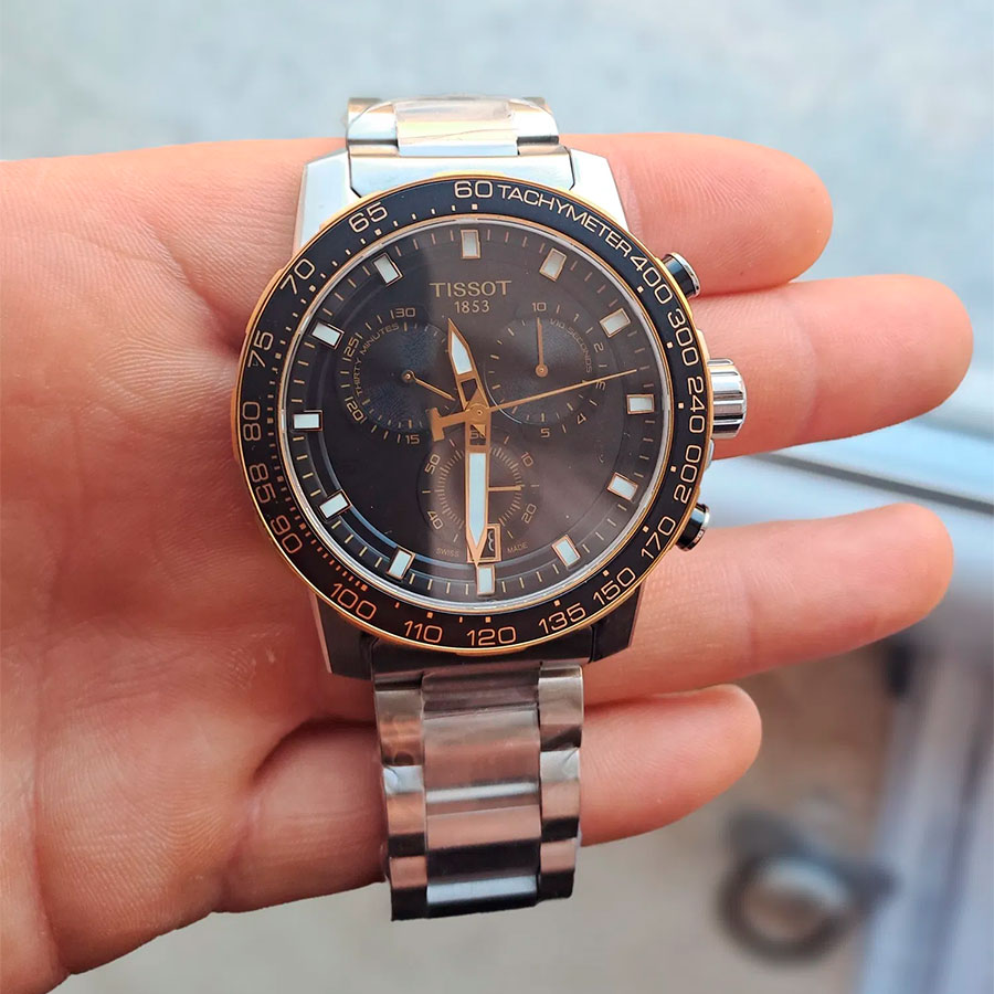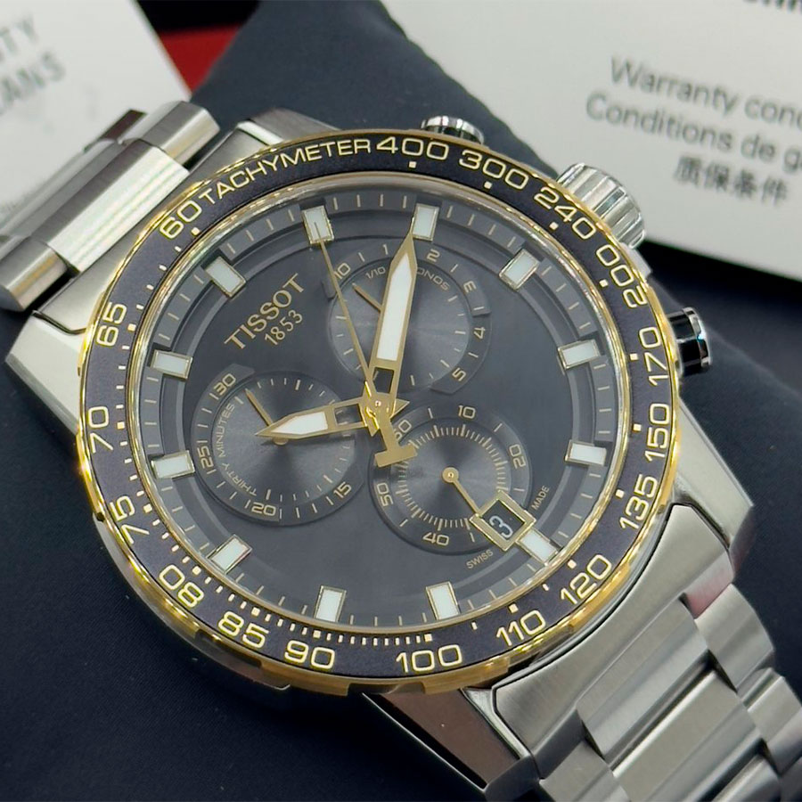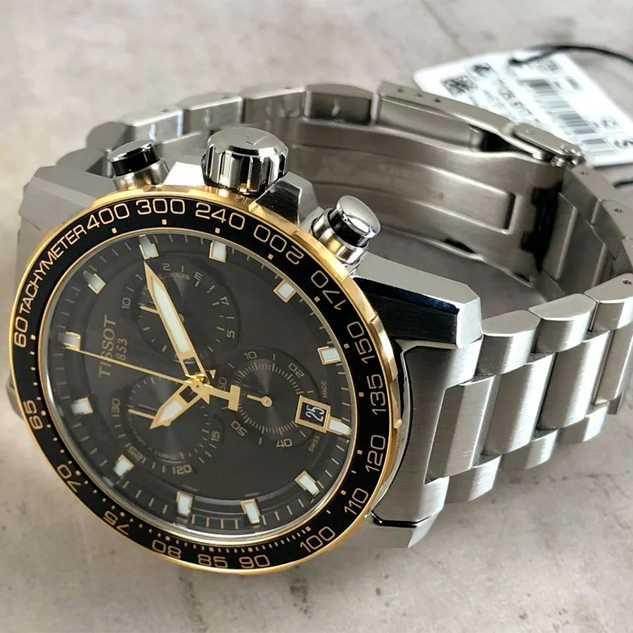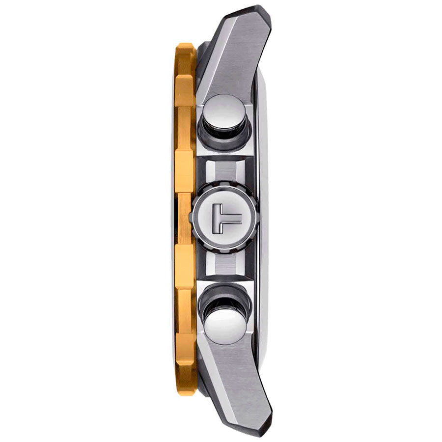Мужские кварцевые наручные часы с хронографом (секундомером) TISSOT SuperSport Chrono T125.617.21.051.00 коллекции T Sport. Калибр механизма — ETA G10.212. На данной модели отображается текущая дата. Секундомер может отсчитывать до 29 минут 59 секунд. На безеле присутсвует шкала тахиметра для измерения средней скорости движения. Стрелки и метки покрыты люминесцентным напылением Super-LumiNova® (светятся в темноте). Сапфировое стекло с антибликовым покрытием, устойчивое к появлению царапин. Стальной браслет. На корпус частично нанесено стойкое PVD покрытие. Водонепроницаемость WR100 (10 атм). Размеры корпуса: (ШxТ) 45.5х12 мм. Гарантийный срок — 3 года (1 год от производителя + 2 года от магазина).