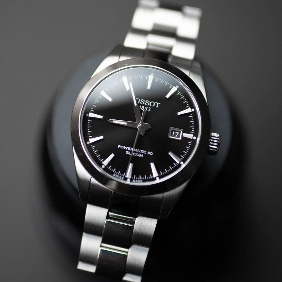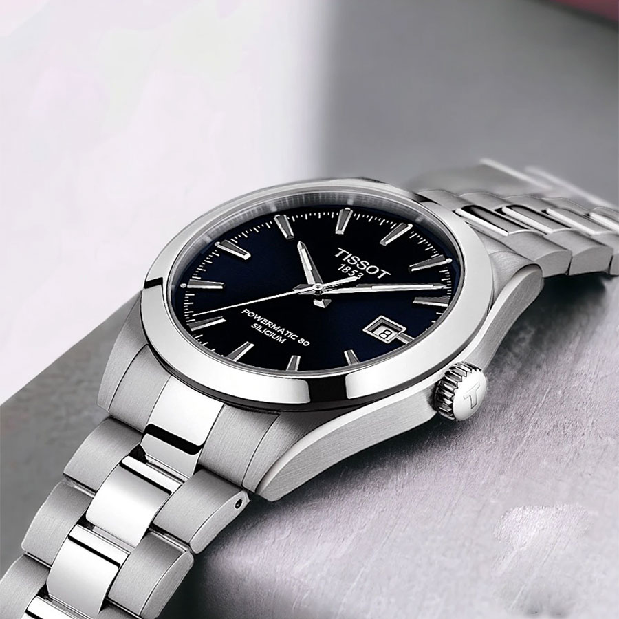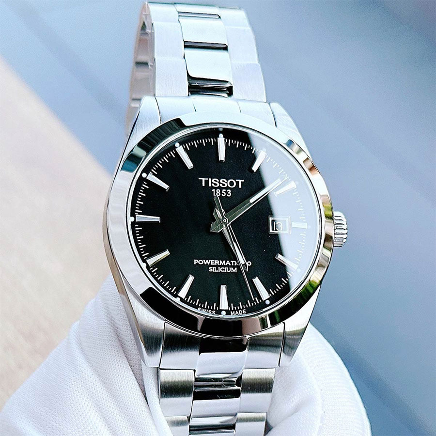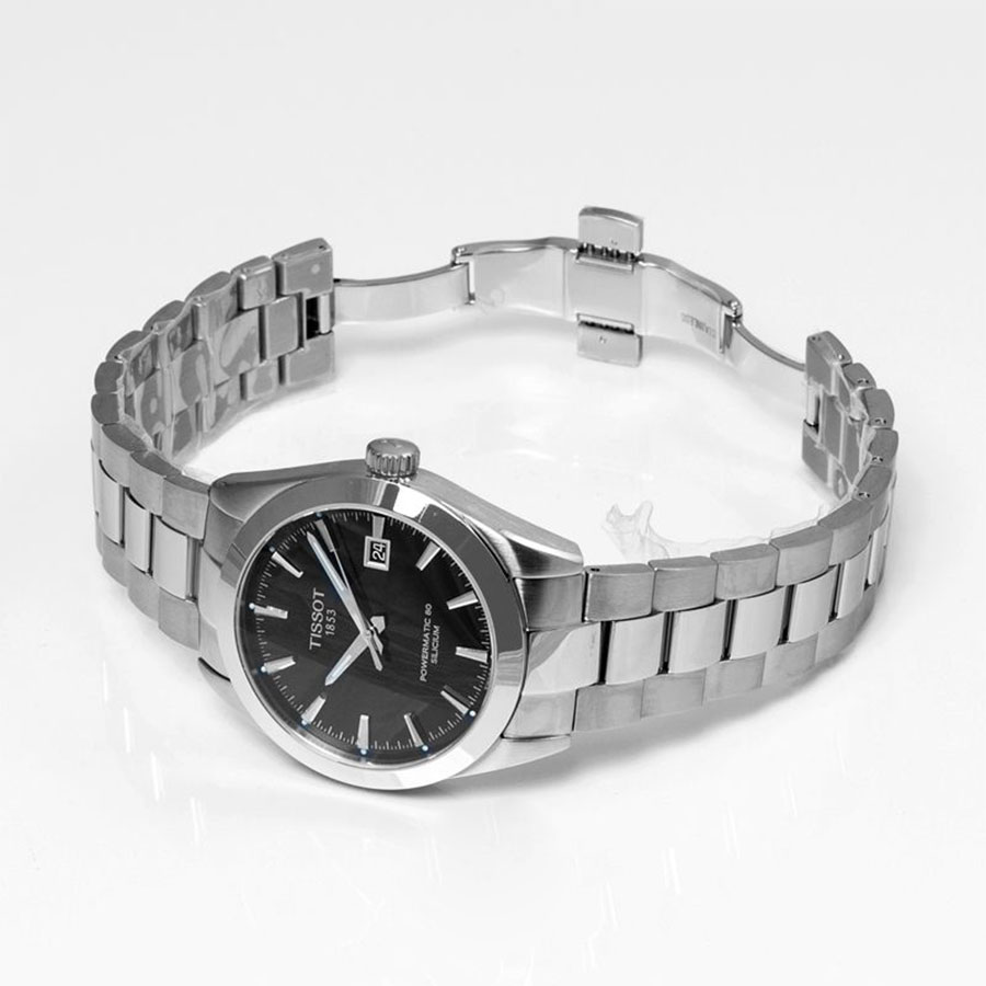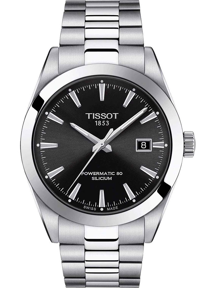 Мужские механические наручные часы TISSOT Gentleman Powermatic 80 Silicium T127.407.11.051.00 коллекции T Classic с автоподзаводом и возможностью ручного завода. Калибр механизма — C07.811. В механизме часов использована запатентованная кремниевая балансирная пружина, благодаря чему запас хода значительно увеличен и составляет не менее 80-ти часов. Количество камней - 26. Функция стоп-секунда (остановка секундной стрелки для установки точного времени). На данной модели отображается текущая дата. Стрелки и метки покрыты люминесцентным напылением Super-LumiNova® (светятся в темноте). Сапфировое стекло с антибликовым покрытием, устойчивое к появлению царапин. Завинчивающаяся прозрачная задняя крышка. Стальной браслет. Водонепроницаемость WR100 (10 атм). Размеры корпуса: (ШxТ) 40x11.5 мм. Гарантийный срок — 3 года (1 год от производителя + 2 года от магазина).