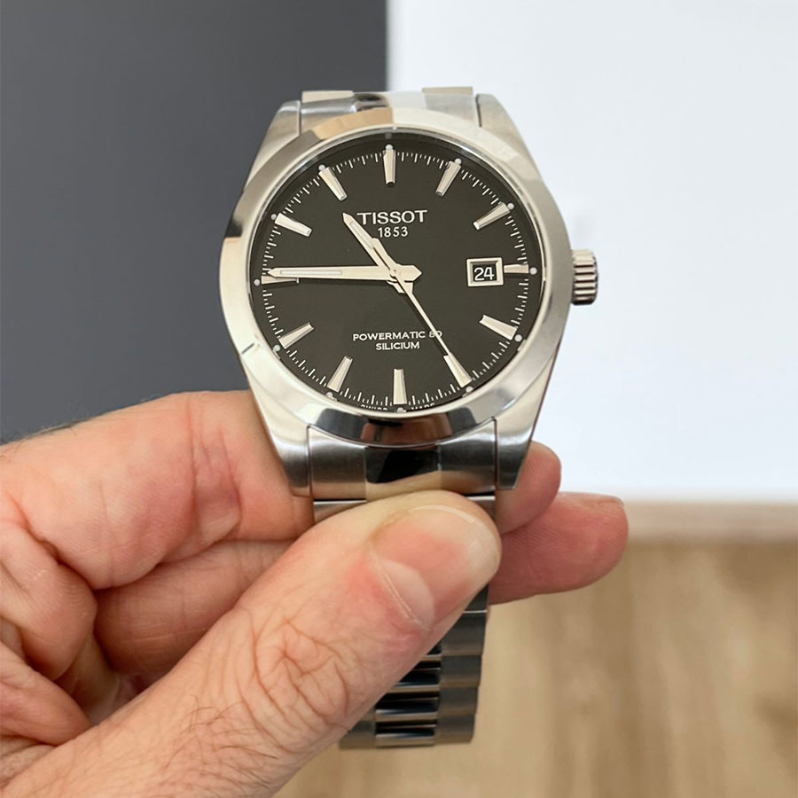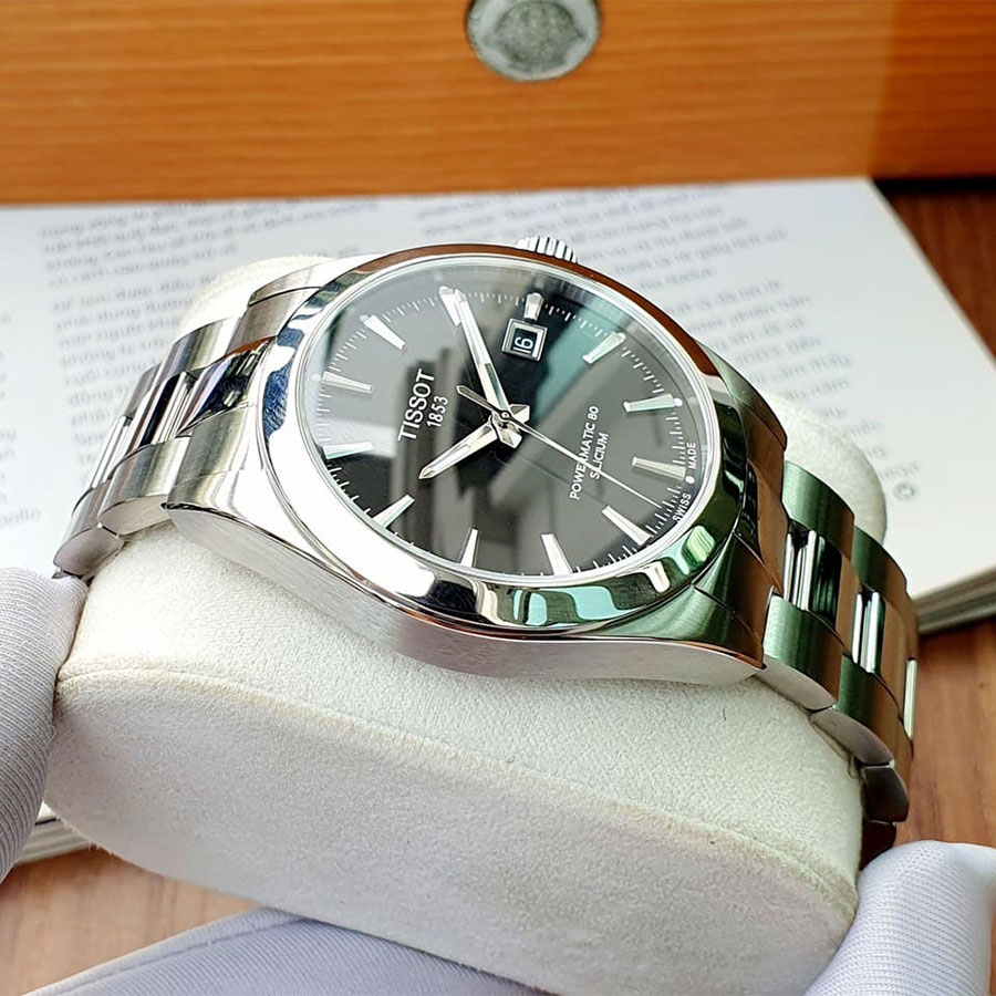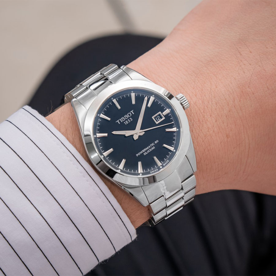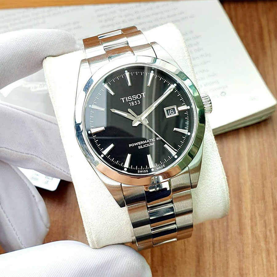 Мужские механические наручные часы TISSOT Gentleman Powermatic 80 Silicium T127.407.11.051.00 коллекции T Classic с автоподзаводом и возможностью ручного завода. Калибр механизма — C07.811. В механизме часов использована запатентованная кремниевая балансирная пружина, благодаря чему запас хода значительно увеличен и составляет не менее 80-ти часов. Количество камней - 26. Функция стоп-секунда (остановка секундной стрелки для установки точного времени). На данной модели отображается текущая дата. Стрелки и метки покрыты люминесцентным напылением Super-LumiNova® (светятся в темноте). Сапфировое стекло с антибликовым покрытием, устойчивое к появлению царапин. Завинчивающаяся прозрачная задняя крышка. Стальной браслет. Водонепроницаемость WR100 (10 атм). Размеры корпуса: (ШxТ) 40x11.5 мм. Гарантийный срок — 3 года (1 год от производителя + 2 года от магазина).