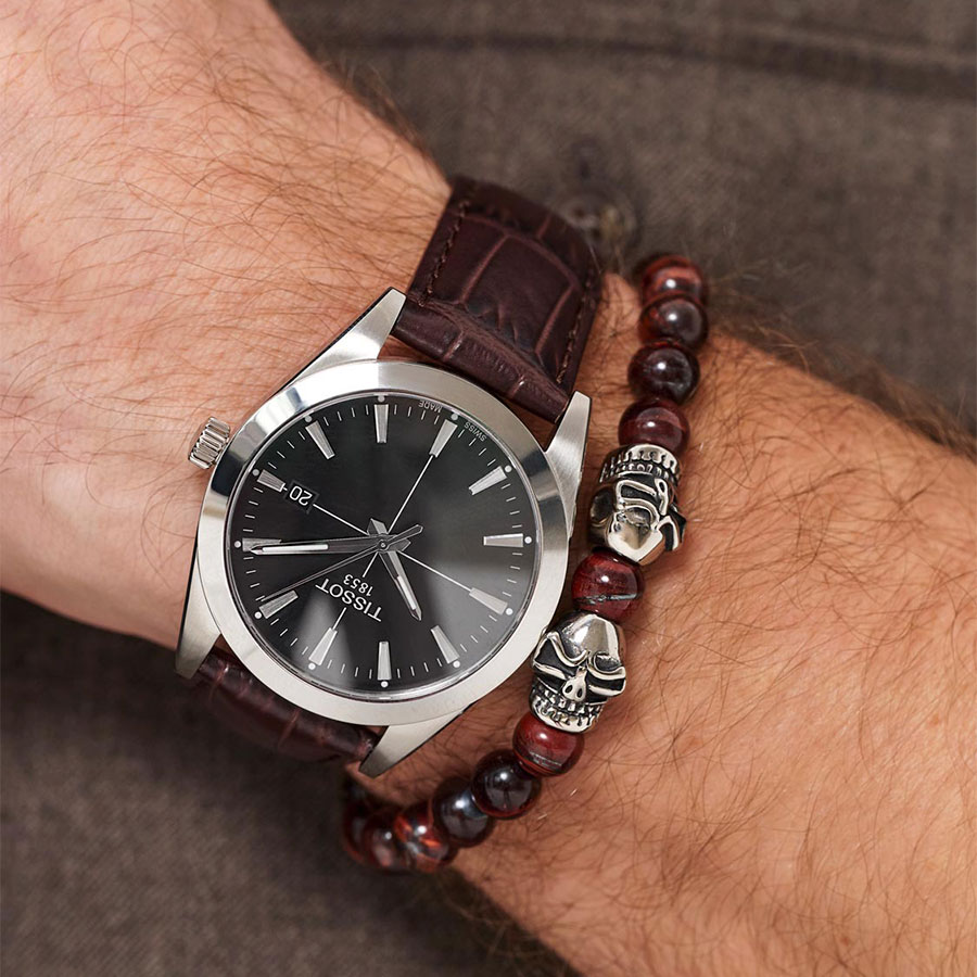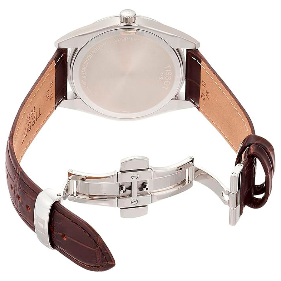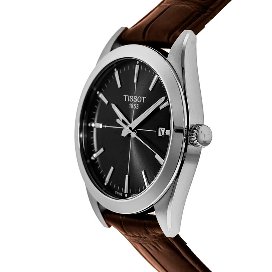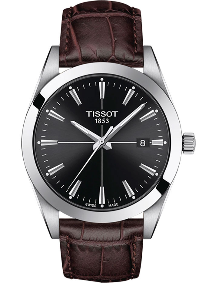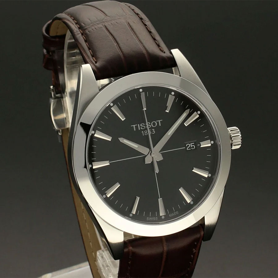 Мужские кварцевые наручные часы TISSOT Gentleman T127.410.16.051.01 коллекции T Classic. Калибр механизма — ETA F06.115. На данной модели отображается текущая дата. Стрелки и метки покрыты люминесцентным напылением Super-LumiNova® (светятся в темноте). Сапфировое стекло с антибликовым покрытием, устойчивое к появлению царапин. Кожаный ремешок. Водонепроницаемость WR100 (10 атм). Размеры корпуса: (ШxТ) 40x8.5 мм. Гарантийный срок — 3 года (1 год от производителя + 2 года от магазина).
