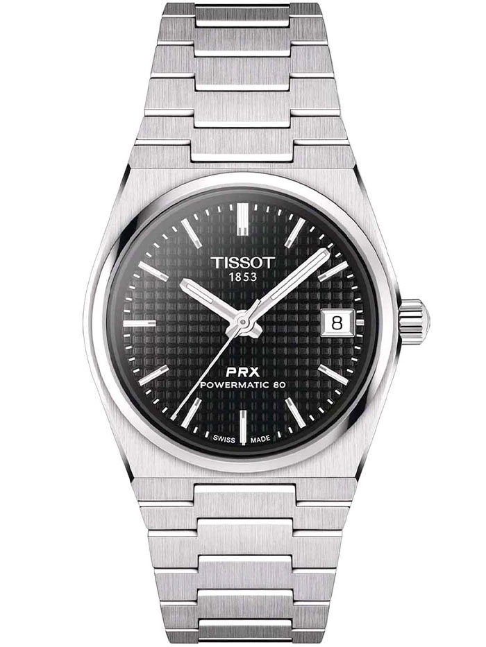 Женские механические наручные часы TISSOT PRX Powermatic 80 35mm T137.207.11.051.00 коллекции T Classic с автоподзаводом и возможностью ручного завода. Калибр механизма — Powermatic 80.111. В механизме часов использована запатентованная балансирная пружина Nivachron, благодаря чему запас хода значительно увеличен и составляет не менее 80-ти часов. Количество камней - 23. Функция стоп-секунда (остановка секундной стрелки для установки точного времени). На данной модели отображается текущая дата. Стрелки и метки покрыты люминесцентным напылением Super-LumiNova® (светятся в темноте). Сапфировое стекло с антибликовым покрытием, устойчивое к появлению царапин. Завинчивающаяся прозрачная задняя крышка. Стальной браслет. Водонепроницаемость WR100 (10 атм). Размеры корпуса: (ШxТ) 35x10.9 мм. Гарантийный срок — 3 года (1 год от производителя + 2 года от магазина).