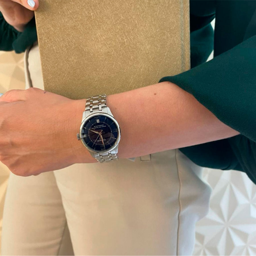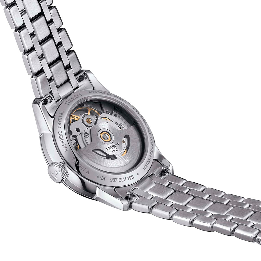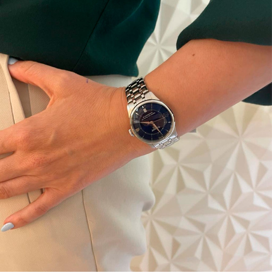 Корпус диаметром 34 мм. выполнен из нержавеющей стали и дополнен стальным браслетом, создающим цельный и элегантный образ. Синий циферблат подчёркивает женственность модели, а стрелки и метки гармонично дополняют дизайн. Надёжную защиту от повреждений обеспечивает сапфировое стекло с антибликовым покрытием. Прозрачная задняя крышка открывает вид на изысканную работу механизма.