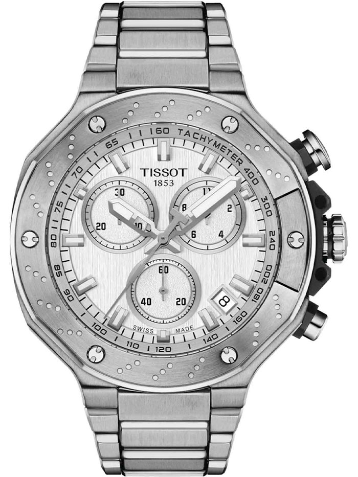 Мужские кварцевые наручные часы с хронографом (секундомером) TISSOT T-Race MotoGP Chronograph T141.417.11.031.00 коллекции T Sport. Калибр механизма — ETA G10.212. На данной модели отображается текущая дата. Секундомер может отсчитывать до 29 минут 59 секунд. На циферблате присутсвует шкала тахиметра для измерения средней скорости движения. Стрелки и метки покрыты люминесцентным напылением Super-LumiNova® (светятся в темноте). Сапфировое стекло с антибликовым покрытием, устойчивое к появлению царапин. Стальной браслет. Водонепроницаемость WR100 (10 атм). Размеры корпуса: (ШxТ) 45х11.7 мм. Гарантийный срок — 3 года (1 год от производителя + 2 года от магазина).