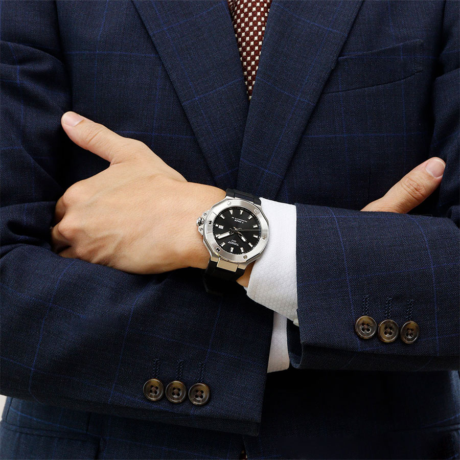 Корпус выполнен из нержавеющей стали и дополнен завинчивающейся прозрачной задней крышкой, открывающей вид на работу механизма. Циферблат глубокого чёрного цвета украшен стрелками и метками с люминесцентным покрытием Super-LumiNova®, что обеспечивает отличную читаемость даже в темноте. От царапин и бликов поверхность защищает сапфировое стекло с антибликовым напылением.