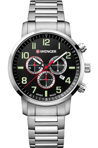 Мужские кварцевые часы Wenger 01.1543.102 с хронографом (секундомром). Коллекции Attitude Chrono. Калибр механизма — Ronda 5030D. На данной модели отображается текущая дата. Секундомер может отсчитывать до 12 часов. Стрелки и цифры покрыты люминесцентным напылением (светятся в темноте). Установлено минеральное стекло с сапфировым покрытием (устойчивое к царапинам). Стальной браслет с автоматической застежкой и дополнительным фиксатором. Завинчивающаяся задняя крышка часов. Водонепроницаемость WR100 (10 атм). Швейцарская сборка (Swiss made). Официальная гарантия от производителя — 3 года.