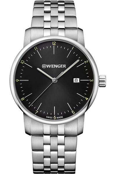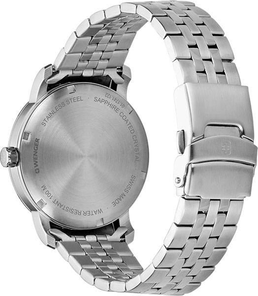Мужские кварцевые часы Wenger 01.1741.122 коллекции Urban Classic. Калибр механизма — Ronda 515. На данной модели отображается текущая дата. Стрелки покрыты люминесцентным напылением (светятся в темноте). Установлено минеральное стекло с сапфировым покрытием (устойчивое к царапинам). Стальной браслет с автоматической застежкой и дополнительным фиксатором. Завинчивающаяся задняя крышка часов. Водонепроницаемость WR100 (10 атм). Швейцарская сборка (Swiss made). Официальная гарантия от производителя — 3 года.