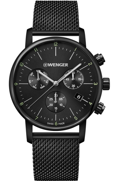 Мужские кварцевые часы Wenger 01.1743.116 с хронографом (секундомером). Коллекция Urban Classic Chrono. Калибр механизма — Ronda Z60. На данной модели отображается текущая дата и день недели. Стрелки покрыты люминесцентным напылением (светятся в темноте). Установлено минеральное стекло с сапфировым покрытием (устойчивое к царапинам). Стальной браслет с миланским плетением. На корпус и браслет нанесено стойкое PVD покрытие. Завинчивающаяся задняя крышка часов. Водонепроницаемость WR100 (10 атм). Швейцарская сборка (Swiss made). Официальная гарантия от производителя — 3 года.