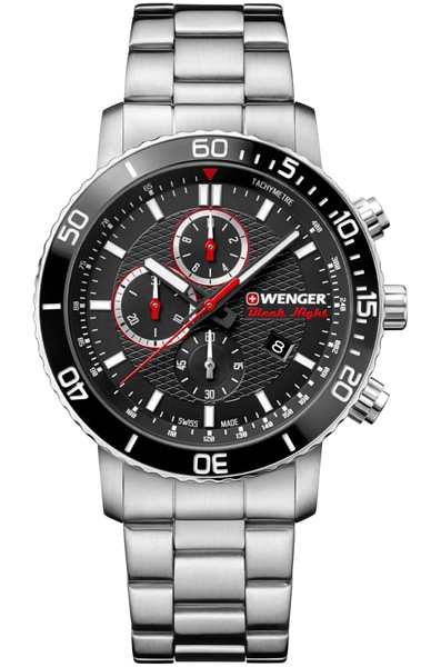 Мужские кварцевые часы Wenger 01.1843.106 с хронографом (секундомром). Коллекции Roadster Black Night Chronograph. Калибр механизма — Ronda 3540D. На данной модели отображается текущая дата. Секундомер может отсчитывать до 12 часов. Стрелки и цифры покрыты люминесцентным напылением (светятся в темноте). Установлено минеральное стекло с сапфировым покрытием (устойчивое к царапинам). Присутствует шкала тахиметра для измерения средней скорости движения. Стальной браслет с автоматической застежкой и дополнительным фиксатором. На корпус частично нанесено стойкое PVD покрытие. Завинчивающаяся задняя крышка часов. Водонепроницаемость WR100 (10 атм). Швейцарская сборка (Swiss made). Официальная гарантия от производителя — 3 года.