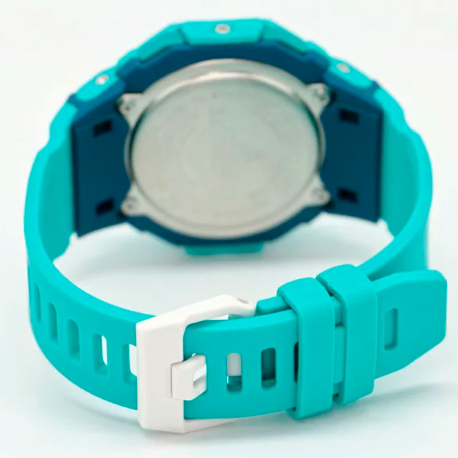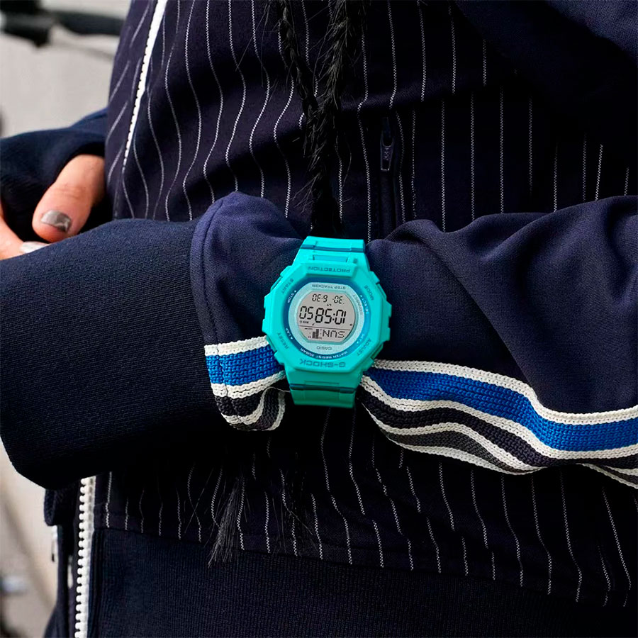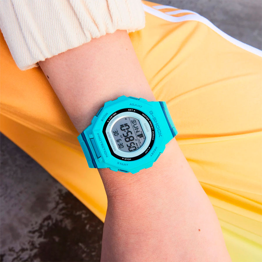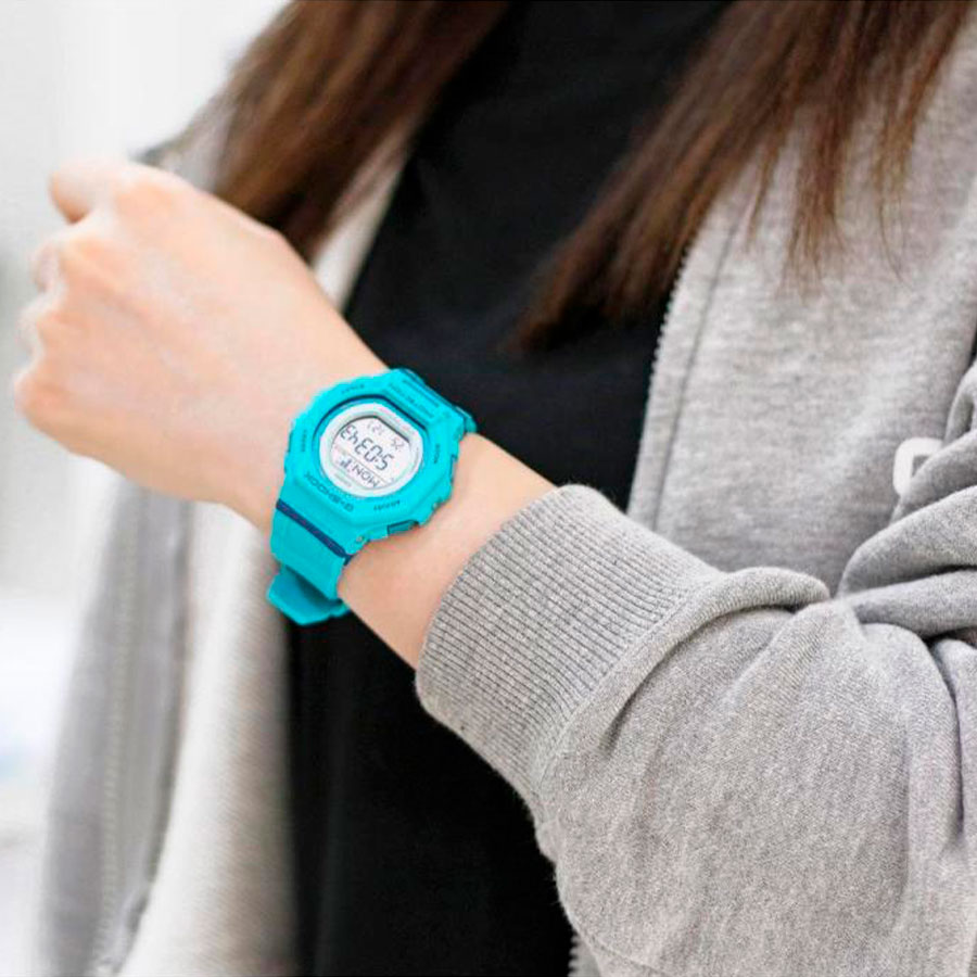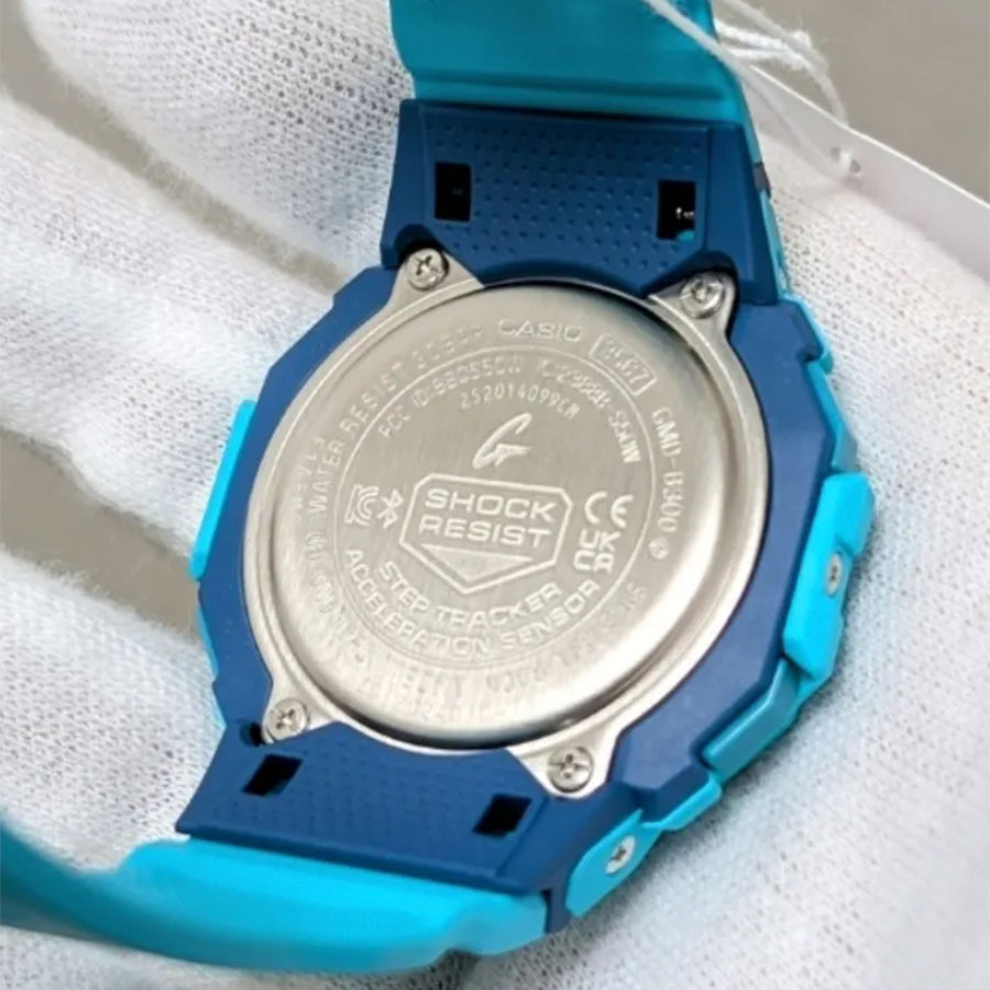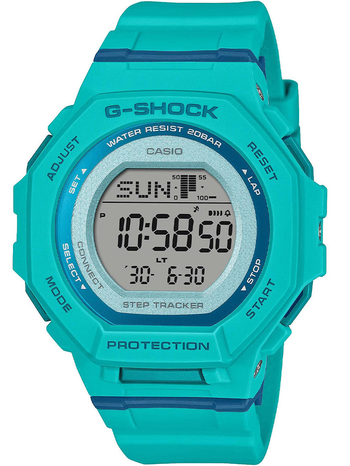 Противоударные кварцевые женские наручные часы Casio GMD-B300SC-2 коллекции G-Shock с цифровой индикацией времени, функцией шагомера и технологией Bluetooth® Smart. Калибр механизма — 3567. С помощью Bluetooth® вы можете подключить часы к смартфону и с помощью приложения G-SHOCK Move® получить доступ к полезным функциям. Часы автоматически связываются с телефоном через Bluetooth® и проверяют точность времени 4 раза в сутки. Просмотр количества шагов за 24 часа, интенсивность упражнений и физических нагрузок. Просмотр еженедельного количества шагов и числа сожженных калорий. Просмотр информации секундомера о времени прохождения кругов или промежуточных результатах (до 200 записей). Настройка мирового времени (300 городов). Функция поиска телефона, можно включить тоновый сигнал на телефоне, что позволит быстро найти телефон. Функциональность данной модели: формат времени 12/24, автоматический календарь до 2099 года; функция летнего времени (DST), функция двойного времени, 5 независимых будильников, сигнал начала часа, секундомер с точностью 1/100 секунды и измерением до 60 минут, с записью данных: до 200 записей (год начала измерения, месяц, дата, час, минута, время прохождения дистанции), таймер обратного отсчета (диапазон времени 60 минут), диодная подсветка циферблата (Super Illuminator) с функцией авто (включается при наклоне часов на 40°) и возможностью выбора времени свечения (1.5 или 3 секунды), режим выключения звука нажатия кнопок (Mute), режим энергосбережения и предупреждение о низком заряде батареи, режим полета (авиа режим), функции сенсора шагомера: измерение количества шагов: диапазон отображения количества шагов: от 0 до 999 999 шагов, отображение прогресса достижения цели по шагам (диапазон настройки целевого количества шагов: от 1000 до 50 000, с шагом в 1000 шагов), напоминание об активности (информирует вас, когда количество шагов слишком мало, с помощью дисплея и звукового сигнала), график количества шагов (почасовое количество шагов за последние 7 часов на 6-уровневом графике). Водонепроницаемость WR200 (20 атм). Размеры корпуса: (ШxВxТ) 43.8x46.4x12 мм. Гарантийный срок — 3 года (1 год от производителя + 2 года от магазина).