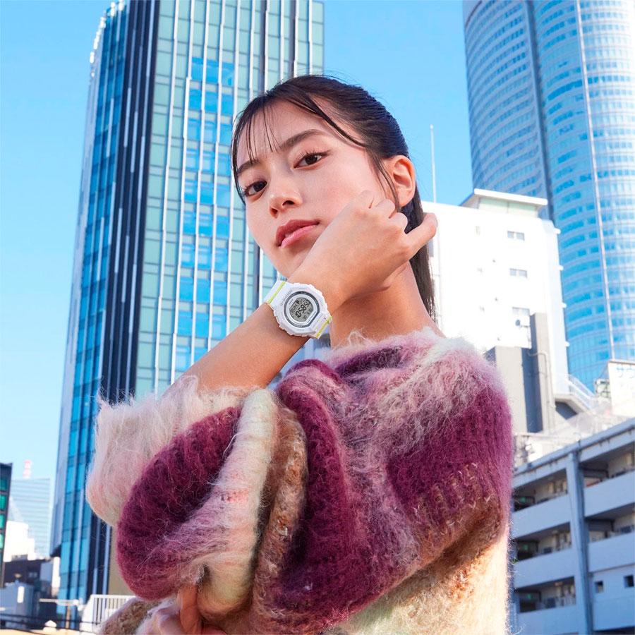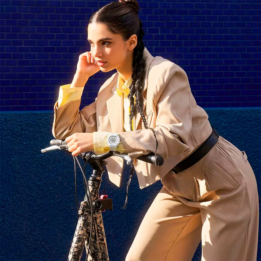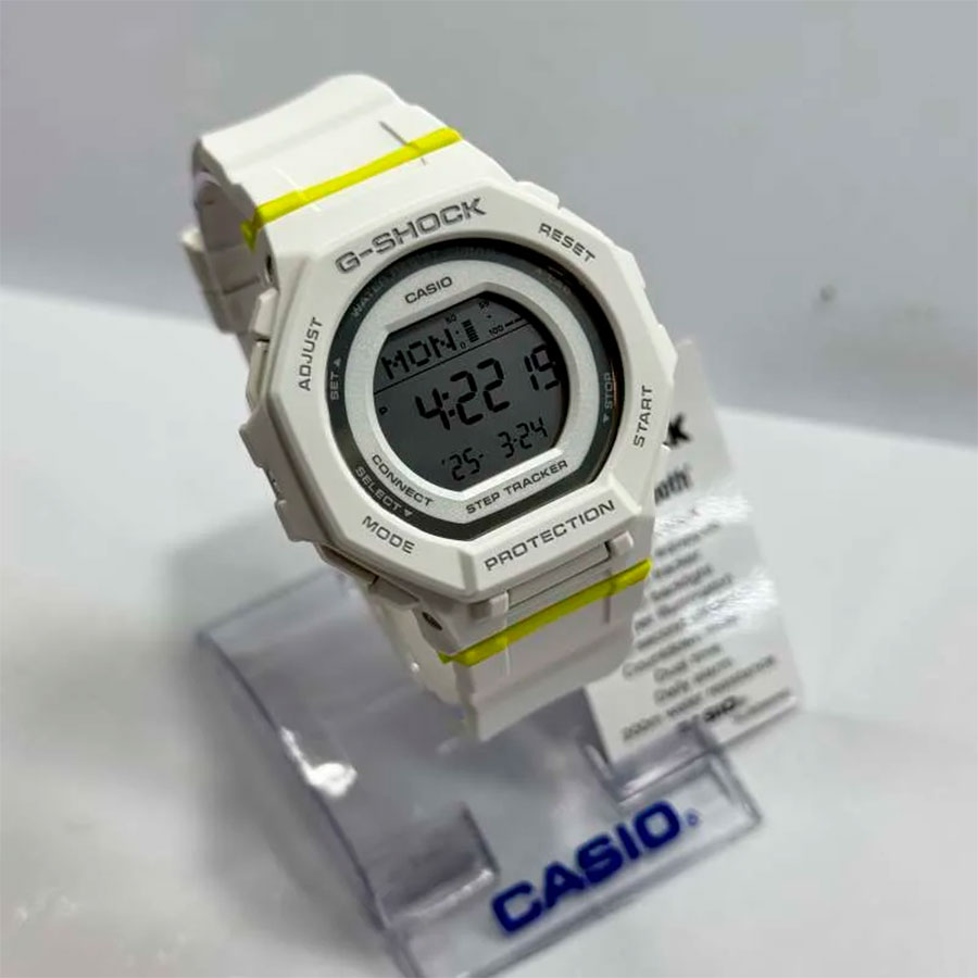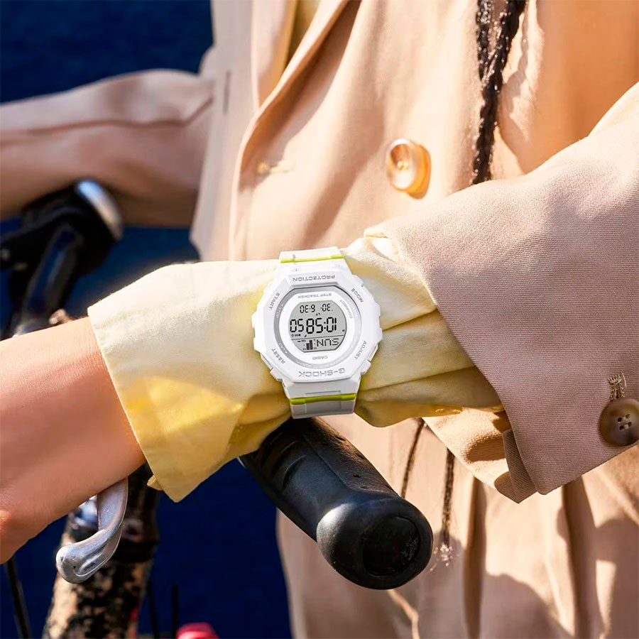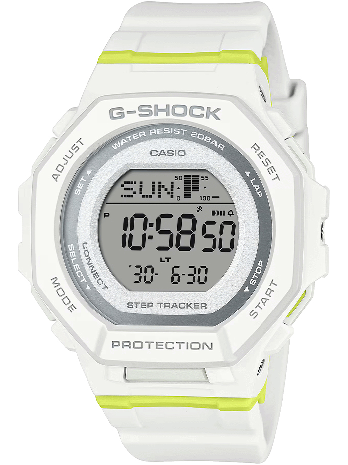 Противоударные кварцевые женские наручные часы Casio GMD-B300SC-7 коллекции G-Shock с цифровой индикацией времени, функцией шагомера и технологией Bluetooth® Smart. Калибр механизма — 3567. С помощью Bluetooth® вы можете подключить часы к смартфону и с помощью приложения G-SHOCK Move® получить доступ к полезным функциям. Часы автоматически связываются с телефоном через Bluetooth® и проверяют точность времени 4 раза в сутки. Просмотр количества шагов за 24 часа, интенсивность упражнений и физических нагрузок. Просмотр еженедельного количества шагов и числа сожженных калорий. Просмотр информации секундомера о времени прохождения кругов или промежуточных результатах (до 200 записей). Настройка мирового времени (300 городов). Функция поиска телефона, можно включить тоновый сигнал на телефоне, что позволит быстро найти телефон. Функциональность данной модели: формат времени 12/24, автоматический календарь до 2099 года; функция летнего времени (DST), функция двойного времени, 5 независимых будильников, сигнал начала часа, секундомер с точностью 1/100 секунды и измерением до 60 минут, с записью данных: до 200 записей (год начала измерения, месяц, дата, час, минута, время прохождения дистанции), таймер обратного отсчета (диапазон времени 60 минут), диодная подсветка циферблата (Super Illuminator) с функцией авто (включается при наклоне часов на 40°) и возможностью выбора времени свечения (1.5 или 3 секунды), режим выключения звука нажатия кнопок (Mute), режим энергосбережения и предупреждение о низком заряде батареи, режим полета (авиа режим), функции сенсора шагомера: измерение количества шагов: диапазон отображения количества шагов: от 0 до 999 999 шагов, отображение прогресса достижения цели по шагам (диапазон настройки целевого количества шагов: от 1000 до 50 000, с шагом в 1000 шагов), напоминание об активности (информирует вас, когда количество шагов слишком мало, с помощью дисплея и звукового сигнала), график количества шагов (почасовое количество шагов за последние 7 часов на 6-уровневом графике). Водонепроницаемость WR200 (20 атм). Размеры корпуса: (ШxВxТ) 43.8x46.4x12 мм. Гарантийный срок — 3 года (1 год от производителя + 2 года от магазина).