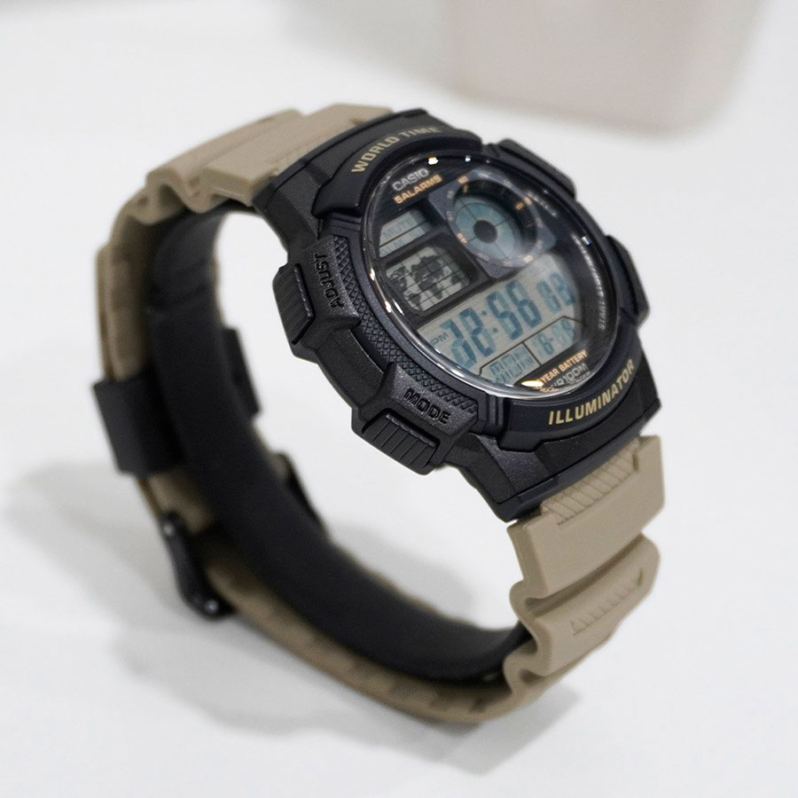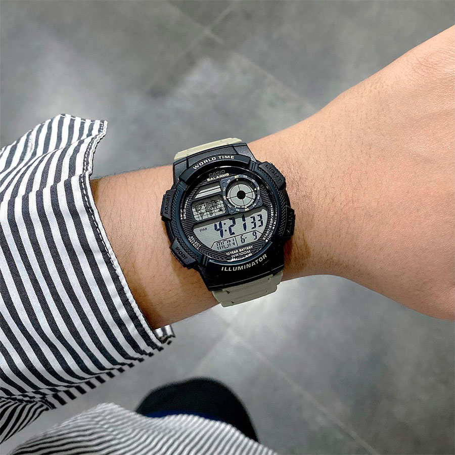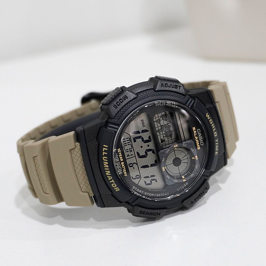 Электронные кварцевые мужские наручные часы Casio AE-1000W-5A с цифровой индикацией времени. Калибр механизма — 3198. Функциональность данной модели: формат времени 12/24, мировое время в 48 городах (31 часовой пояс), автоматический календарь до 2099 года, 5 независимых будильников, сигнал начала часа, секундомер с точностью 1/100 секунды и измерением до 23 часов 59 минут 59,99 cек., таймер обратного отсчета (диапазон времени 24 часа), функция выключения звука нажатия кнопок (Mute), диодная подсветка циферблата. Батарейка на 10 лет работы. Водонепроницаемость WR100 (10 атм). Размеры корпуса: (ШxВxТ) 45x48.2x13.8 мм. Гарантийный срок — 3 года (1 год от производителя + 2 года от магазина).