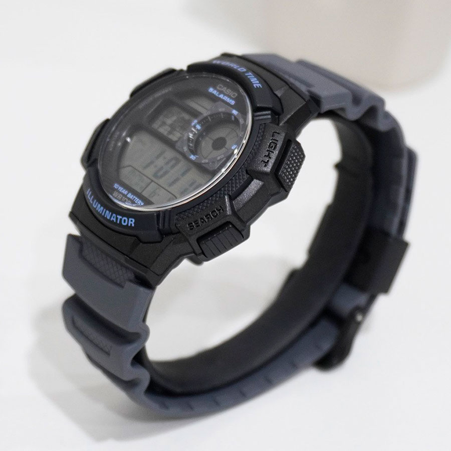 Электронные кварцевые мужские наручные часы Casio AE-1000W-8A с цифровой индикацией времени. Калибр механизма — 3198. Функциональность данной модели: формат времени 12/24, мировое время в 48 городах (31 часовой пояс), автоматический календарь до 2099 года, 5 независимых будильников, сигнал начала часа, секундомер с точностью 1/100 секунды и измерением до 23 часов 59 минут 59,99 cек., таймер обратного отсчета (диапазон времени 24 часа), функция выключения звука нажатия кнопок (Mute), диодная подсветка циферблата. Батарейка на 10 лет работы. Водонепроницаемость WR100 (10 атм). Размеры корпуса: (ШxВxТ) 45x48.2x13.8 мм. Гарантийный срок — 3 года (1 год от производителя + 2 года от магазина).