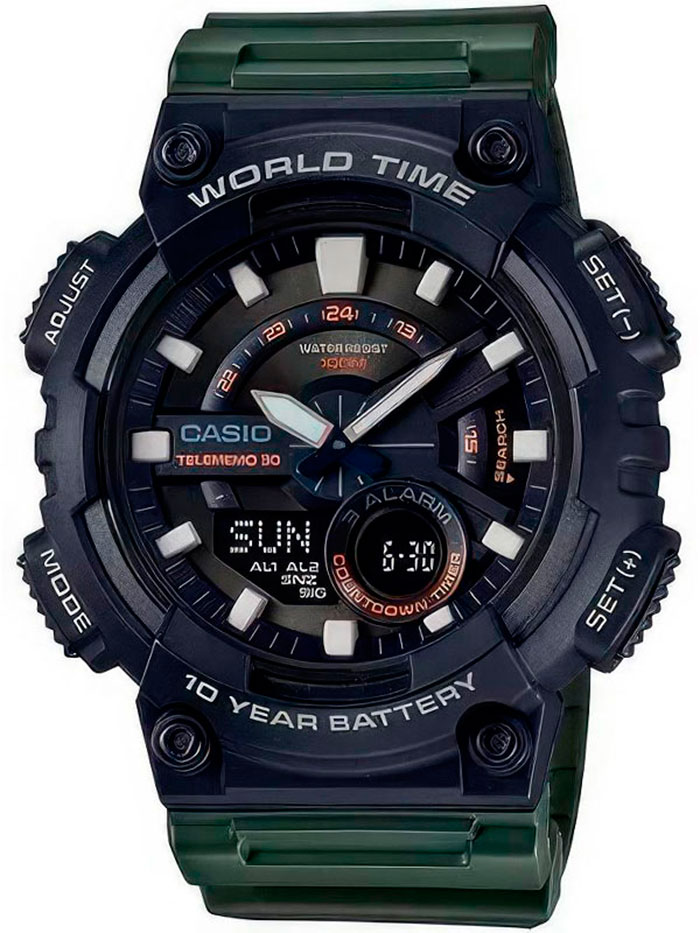 Кварцевые мужские наручные часы Casio AEQ-110W-3A с цифровой+стрелочной индикацией времени. Калибр механизма — 5479. Функциональность данной модели: формат времени 12/24, функция летнего времени (DST), мировое время 30 городов (29 часовых поясов), автоматический календарь до 2099 года, 3 независимых будильника, сигнал начала часа, секундомер с точностью 1/100 секунды и измерением до 23 часов 59 минут 59,99 cек., таймер обратного отсчета (диапазон времени 24 часа), записная книжка телефонных номеров на 30 записей, люминесцентное напыление на стрелках и метках часов (светятся в темноте). Батарейка на 10 лет работы. Водонепроницаемость WR100 (10 атм). Размеры корпуса: (ШxВxТ) 48.2x52.2x16.7 мм. Гарантийный срок — 3 года (1 год от производителя + 2 года от магазина).