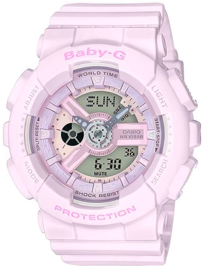 Противоударные кварцевые женские наручные часы Casio BA-110-4A2 коллекции Baby-G с двойной индикацией времени. Калибр механизма — 5338. Функциональность данной модели: формат времени 12/24, мировое время 48 городов (29 часовых поясов), автоматический календарь до 2099 года, функция летнего времени (DST), 5 независимых будильников, сигнал начала часа, секундомер с точностью 1/100 секунды и измерением до 23 часов 59 минут 59,99 cек., таймер обратного отсчета (диапазон времени 24 часа), диодная подсветка циферблата с функцией послесвечения, функция выключения звука нажатия кнопок (Mute). Стрелки покрыты необритовым (Neobrite) люминесцентным напылением (светятся в темноте). Водонепроницаемость WR100 (10 атм). Размеры корпуса: (ШхВхТ) 43.4x46.3x15.8 мм Гарантийный срок — 3 года (1 год от производителя + 2 года от магазина).