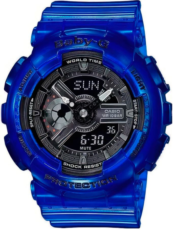 Противоударные кварцевые женские наручные часы Casio BA-110CR-2A коллекции Baby-G с двойной индикацией времени. Калибр механизма — 5338. Функциональность данной модели: формат времени 12/24, мировое время 48 городов (29 часовых поясов), автоматический календарь до 2099 года, функция летнего времени (DST), 5 независимых будильников, сигнал начала часа, секундомер с точностью 1/100 секунды и измерением до 23 часов 59 минут 59,99 cек., таймер обратного отсчета (диапазон времени 24 часа), диодная подсветка циферблата. Водонепроницаемость WR100 (10 атм). Размеры корпуса: Диаметр 42.6 мм; толщина 14.6 мм Гарантийный срок — 3 года (1 год от производителя + 2 года от магазина).
