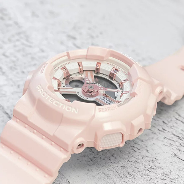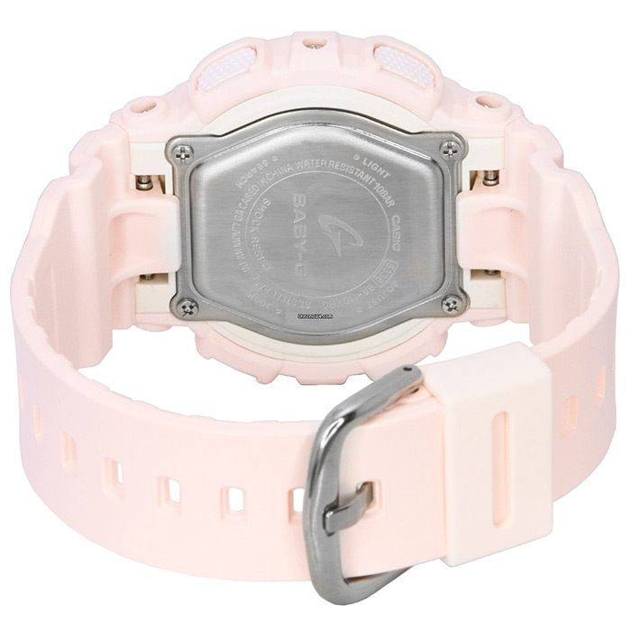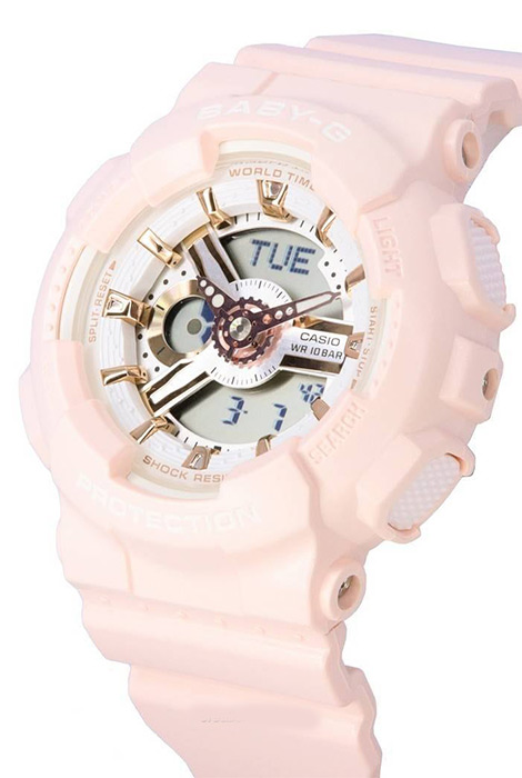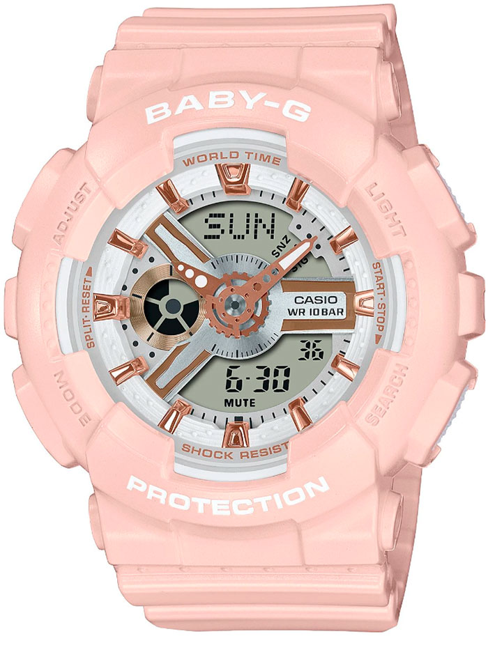 Противоударные кварцевые женские наручные часы Casio BA-110XRG-4A коллекции Baby-G с двойной индикацией времени. Калибр механизма — 5338. Функциональность данной модели: формат времени 12/24, мировое время 48 городов (29 часовых поясов), автоматический календарь до 2099 года, функция летнего времени (DST), 5 независимых будильников, сигнал начала часа, секундомер с точностью 1/100 секунды и измерением до 23 часов 59 минут 59,99 cек., таймер обратного отсчета (диапазон времени 24 часа), диодная подсветка циферблата с функцией послесвечения, функция выключения звука нажатия кнопок (Mute). Стрелки покрыты необритовым (Neobrite) люминесцентным напылением (светятся в темноте). Водонепроницаемость WR100 (10 атм). Размеры корпуса: (ШхВхТ) 43.4x46.3x15.8 мм Гарантийный срок — 3 года (1 год от производителя + 2 года от магазина).