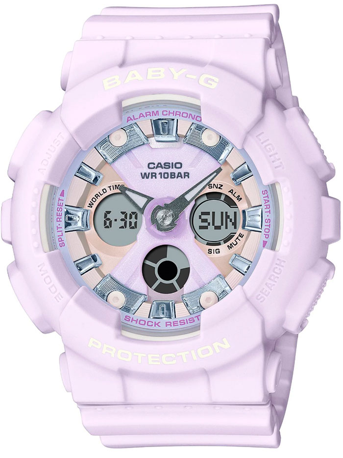 Противоударные кварцевые женские наручные часы Casio BA-130WP-6A коллекции Baby-G с двойной индикацией времени. Калибр механизма — 5607. Функциональность данной модели: формат времени 12/24, мировое время 48 городов (29 часовых поясов), автоматический календарь до 2099 года, функция летнего времени (DST), 5 независимых будильников, сигнал начала часа, секундомер с точностью 1/100 секунды и измерением до 23 часов 59 минут 59,99 cек., таймер обратного отсчета (диапазон времени 24 часа), диодная подсветка циферблата с функцией послесвечения, функция выключения звука нажатия кнопок (Mute). Стрелки покрыты необритовым (Neobrite) люминесцентным напылением (светятся в темноте). Водонепроницаемость WR100 (10 атм). Размеры корпуса: (ШхВхТ) 43.3x46.3x15.8 мм Гарантийный срок — 3 года (1 год от производителя + 2 года от магазина).
