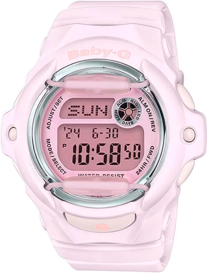 Противоударные кварцевые женские наручные часы Casio BG-169M-4 коллекции Baby-G с цифровой индикацией времени. Калибр механизма — 3252. Функциональность данной модели: формат времени 12/24, мировое время 30 городов (29 часовых поясов), записная книжка телефонных номеров (25 записей), режим отсчета дней до контрольной даты, автоматический календарь до 2099 года, функция летнего времени (DST), 5 независимых будильников, сигнал начала часа, секундомер с точностью 1/100 секунды и измерением до 23 часов 59 минут 59,99 cек., таймер обратного отсчета (диапазон времени 24 часа), электролюминесцентная подсветка циферблата с функцией послесвечения, функция выключения звука нажатия кнопок (Mute), Водонепроницаемость WR200 (20 атм). Размеры корпуса: (ШхВхТ) 42.6x45.9x16.4 мм Гарантийный срок — 3 года (1 год от производителя + 2 года от магазина).