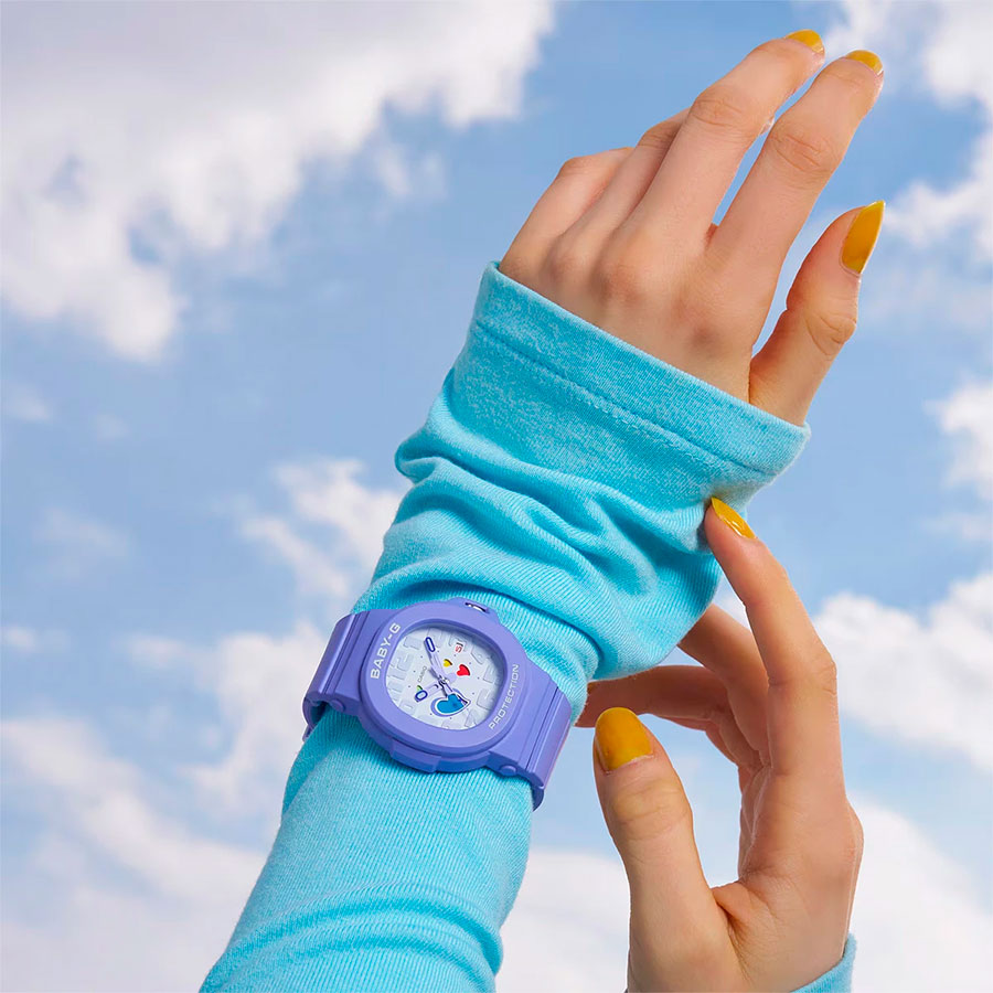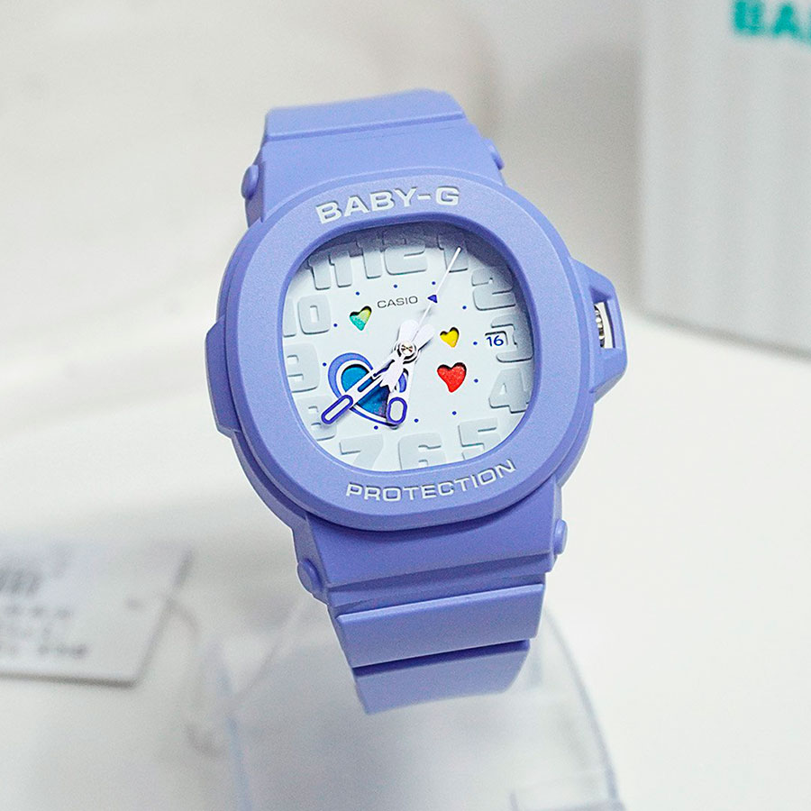 Противоударные кварцевые женские наручные часы Casio BGA-10-6A коллекции Baby-G с стрелочной индикацией времени. Калибр механизма — 5738. Забавные цветовые сочетания, которые меняются в зависимости от дня недели - «Весёлые сердечки» на циферблате Baby-G. На циферблате изображен мотив в виде сердечек, который меняется каждый день. С помощью заводной головки можно в любое время выбрать цветовое сочетание, которое лучше всего соответствует его настроению. Веселый и очаровательный дизайн для всех, кто радуется жизни каждый день. Четыре отверстия в форме сердца разного размера отображают оттенки вращающегося цветового круга под циферблатом, демонстрируя различные цветовые комбинации. Цвета сердечек и индикатора даты меняются автоматически каждый день, создавая веселый и динамичный дизайн циферблата. Вращая заводныу головку можно выбрать одну из нескольких предустановленных цветовых комбинаций. Быстросъемная оболочка для доступа к заводной головке. На данной модели отображается текущая дата. Стрелки покрыты необритовым (Neobrite) люминесцентным напылением (светятся в темноте). Водонепроницаемость WR100 (10 атм). Размеры корпуса: (ШхВхТ) 42.1x46.6x11.4 мм. Гарантийный срок — 3 года (1 год от производителя + 2 года от магазина).