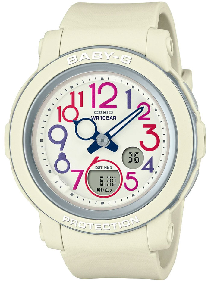 Противоударные кварцевые женские наручные часы Casio BGA-290PA-7A коллекции Baby-G с двойной индикацией времени. Калибр механизма — 5670. Функциональность данной модели: формат времени 12/24, мировое время в 48 городах (в 31 часовых поясах), автоматический календарь до 2099 года, функция летнего времени (DST), 5 будильников, сигнал начала часа, секундомер с шагом 1/100 секунды и измерением до 59 минут 59 cек., таймер обратного отсчета (диапазон времени 24 часа), двойная диодная подсветка циферблата с возможность выбора времени свечения (1.5 или 3 секунды), функция выключения звука нажатия кнопок. Стрелки покрыты необритовым (Neobrite) люминесцентным напылением (светятся в темноте). Функция ручного перемещения стрелок (стрелки перемещаются в сторону, чтобы обеспечить беспрепятственный просмотр содержимого цифрового дисплея). Водонепроницаемость WR100 (10 атм). Размеры корпуса: (ШxВxТ) 41.5x45.2x10.1 мм. Гарантийный срок — 3 года (1 год от производителя + 2 года от магазина).