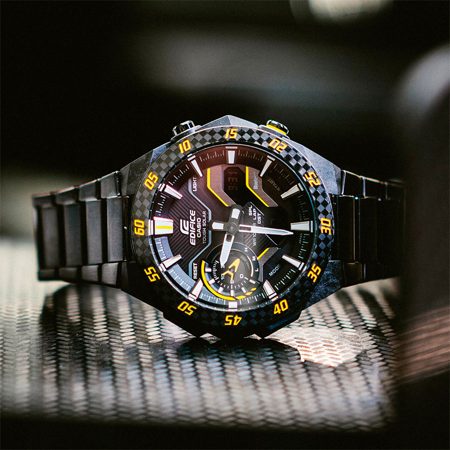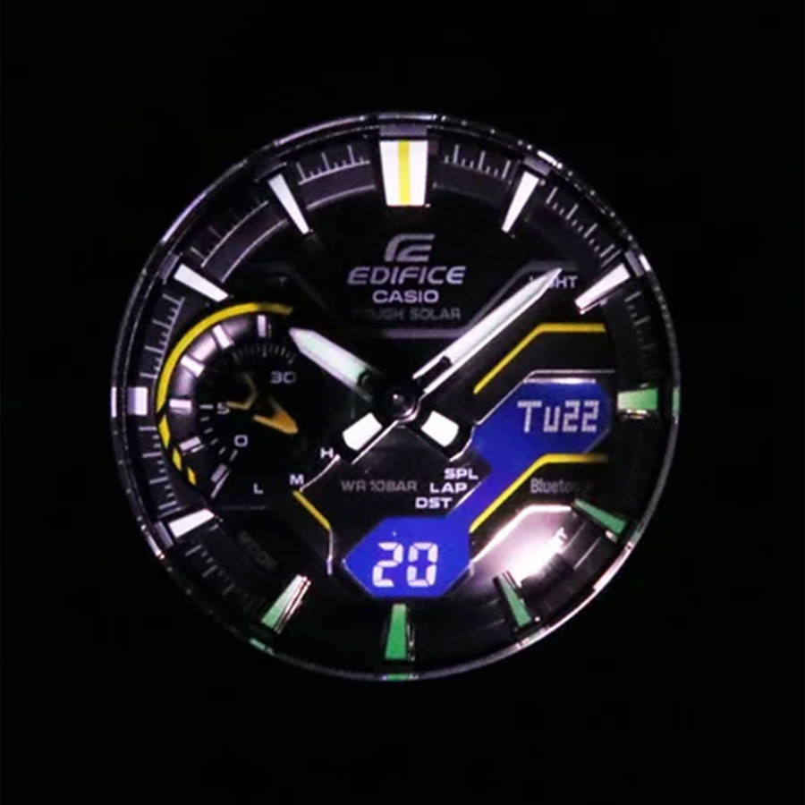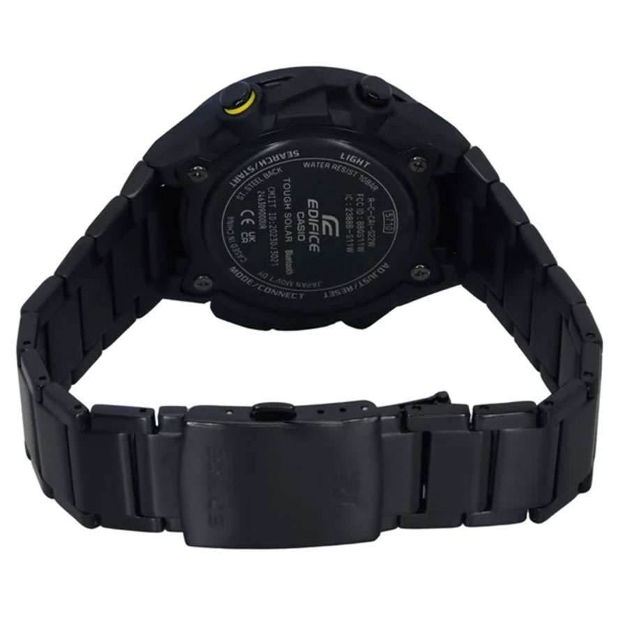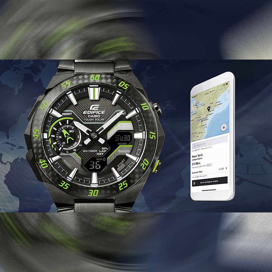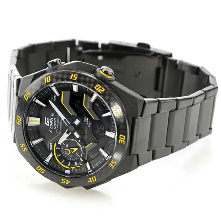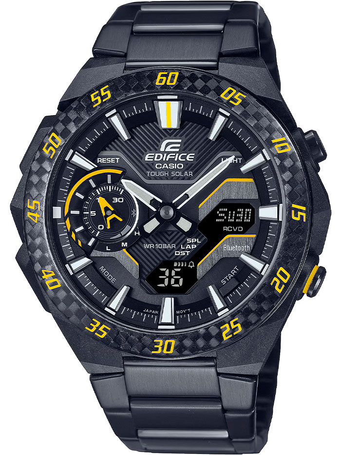 Кварцевые мужские наручные часы на солнечной батарее Casio ECB-2200RC-1A9 коллекции Edifice с технологией Bluetooth® Smart. Двойная (цифровая+аналоговая) индикация времени. Модельный ряд Windflow, вдохновленный гоночной трассой. Боковые грани корпуса созданы для ощущения ветра, струящегося по болиду Формулы-1, и четкий, объемный механический циферблат создают уникальный образ абсолютной скорости. Корпус из углеродного волокна в сочетании с нержавеющей сталью придает часам прочность, но при этом сохраняет их легкий вес, обеспечивая уникальный внешний вид. Калибр механизма — 5710. Аккумулятор данной модели заряжается от любого источника света. Срок работы аккумулятора с полным зарядом — около 7 месяцев при обычном использовании без воздействия света после зарядки и 18 месяцев при хранении в полной темноте с включенной функцией энергосбережения после полной зарядки. Примерный срок службы аккумулятора — 10 лет. Имеется режим энергосбережения (дисплей гаснет для экономии энергии, когда часы остаются в темноте) и индикатор уровня заряда батареи. С помощью Bluetooth® вы можете подключить часы к смартфону и получить доступ к полезным функциям. Часы автоматически связываются с телефоном через Bluetooth® и проверяют точность времени 4 раза в сутки. Возможности Bluetooth в данной модели: С помощью специального приложения CASIO WATCHES возможно установить время в конкретном городе (300 городов), установить точное текущее время, установить будильник, просмотреть показания секундомера, подстроить положение стрелок, записать данные о времени и  местоположении (TIME and PLACE). Функция поиска телефона - можно включить тоновый сигнал на телефоне, что позволит быстро найти телефон. Функциональность данной модели: формат времени 12/24; индикация даты и дня недели (в том числе на Русском языке); мировое время в 38 городах (в 38 часовых поясах); двойное время; автоматический календарь до 2099 года; 5 ежедневных будильников; сигнал начала часа; секундомер с измерением до 23 часов 59 минут 59 cек и записью результатов (до 200 записей); таймер обратного отсчета (диапазон времени 60 минут), двойная диодная подсветка циферблата с возможностью выбора времени свечения (1.5 или 3 секунды); функция выключения звука нажатия кнопок (Mute). Функция ручного перемещения стрелок (стрелки перемещаются в сторону, чтобы обеспечить беспрепятственный просмотр содержимого цифрового дисплея). Стрелки и метки покрыты необритовым (Neobrite) люминесцентным напылением (светятся в темноте). Карбоновый корпус усиленный вставками из нержавеющей стали. Стальной браслет. На браслет нанесено стойкое PVD покрытие. Водонепроницаемость WR100 (10 атм). Размеры корпуса: (ШхВхТ) 48.2x47.6x11.9 мм. Гарантийный срок — 3 года (1 год от производителя + 2 года от магазина).
