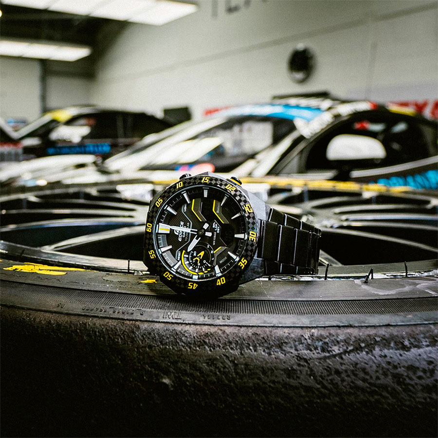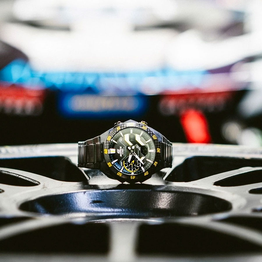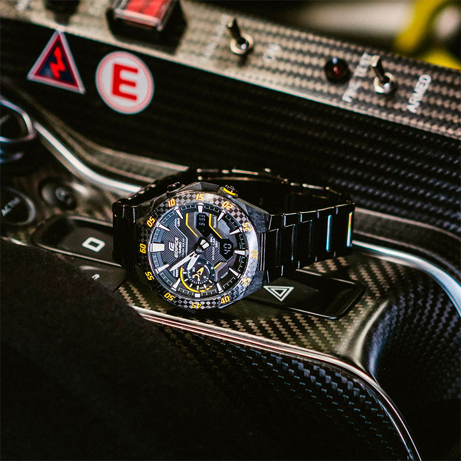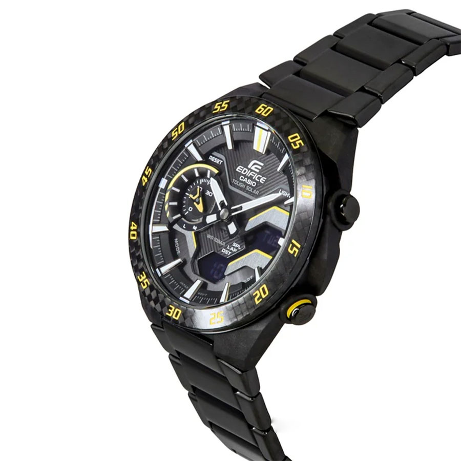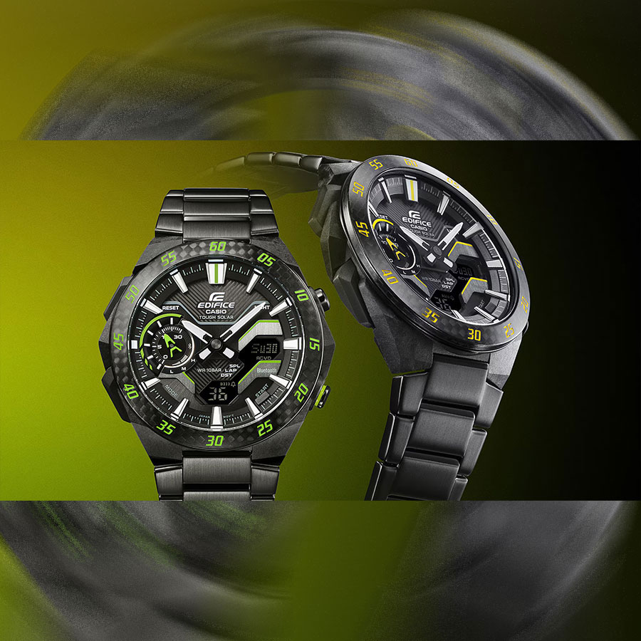 Кварцевые мужские наручные часы на солнечной батарее Casio ECB-2200RC-1A9 коллекции Edifice с технологией Bluetooth® Smart. Двойная (цифровая+аналоговая) индикация времени. Модельный ряд Windflow, вдохновленный гоночной трассой. Боковые грани корпуса созданы для ощущения ветра, струящегося по болиду Формулы-1, и четкий, объемный механический циферблат создают уникальный образ абсолютной скорости. Корпус из углеродного волокна в сочетании с нержавеющей сталью придает часам прочность, но при этом сохраняет их легкий вес, обеспечивая уникальный внешний вид. Калибр механизма — 5710. Аккумулятор данной модели заряжается от любого источника света. Срок работы аккумулятора с полным зарядом — около 7 месяцев при обычном использовании без воздействия света после зарядки и 18 месяцев при хранении в полной темноте с включенной функцией энергосбережения после полной зарядки. Примерный срок службы аккумулятора — 10 лет. Имеется режим энергосбережения (дисплей гаснет для экономии энергии, когда часы остаются в темноте) и индикатор уровня заряда батареи. С помощью Bluetooth® вы можете подключить часы к смартфону и получить доступ к полезным функциям. Часы автоматически связываются с телефоном через Bluetooth® и проверяют точность времени 4 раза в сутки. Возможности Bluetooth в данной модели: С помощью специального приложения CASIO WATCHES возможно установить время в конкретном городе (300 городов), установить точное текущее время, установить будильник, просмотреть показания секундомера, подстроить положение стрелок, записать данные о времени и  местоположении (TIME and PLACE). Функция поиска телефона - можно включить тоновый сигнал на телефоне, что позволит быстро найти телефон. Функциональность данной модели: формат времени 12/24; индикация даты и дня недели (в том числе на Русском языке); мировое время в 38 городах (в 38 часовых поясах); двойное время; автоматический календарь до 2099 года; 5 ежедневных будильников; сигнал начала часа; секундомер с измерением до 23 часов 59 минут 59 cек и записью результатов (до 200 записей); таймер обратного отсчета (диапазон времени 60 минут), двойная диодная подсветка циферблата с возможностью выбора времени свечения (1.5 или 3 секунды); функция выключения звука нажатия кнопок (Mute). Функция ручного перемещения стрелок (стрелки перемещаются в сторону, чтобы обеспечить беспрепятственный просмотр содержимого цифрового дисплея). Стрелки и метки покрыты необритовым (Neobrite) люминесцентным напылением (светятся в темноте). Карбоновый корпус усиленный вставками из нержавеющей стали. Стальной браслет. На браслет нанесено стойкое PVD покрытие. Водонепроницаемость WR100 (10 атм). Размеры корпуса: (ШхВхТ) 48.2x47.6x11.9 мм. Гарантийный срок — 3 года (1 год от производителя + 2 года от магазина).