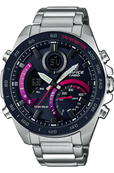 Кварцевые наручные часы на солнечной батарее Casio ECB-900DB-1A коллекции Edifice с технологией Bluetooth®. Калибр механизма — 5582. Аккумулятор данной модели заряжается от любого источника света. Аккумулятор данной модели заряжается от любого источника света. Срок работы аккумулятора с полным зарядом — около 5-ти месяцев. Примерный срок службы аккумулятора — 10 лет. Имеется режим энергосбережение (дисплей гаснет для экономии энергии, когда часы остаются в темноте) и индикатор уровня заряда батареи. С помощью Bluetooth® вы можете подключить часы к смартфону и получить доступ к полезным функциям. Часы автоматически связываются с телефоном через Bluetooth® и проверяют точность времени 4 раза в сутки. Возможности Bluetooth в данной модели: С помощью специального приложения CASIO WATCHES возможно установить время в конкретном городе (300 городов), установить точное текущее время, установить будильник, просмотреть показания секундомера, подстроить положение стрелок, проверить уровень заряда аккумулятора. Функция поиска телефона, можно включить тоновый сигнал на телефоне, что позволит быстро найти телефон. Функциональность данной модели: отображение времени в 12-часовом или 24-часовом формате; индикация даты и дня недели (в том числе на Русском языке); автоматический календарь до 2099 года; мировое время в 39 городах (39 часовых поясов); функция летнего времени (DST); 5 независимых будильников и сигнал начала часа; секундомер с точностью 1/1000 секунды и измерением до 23 часов 59 минут 59 cек. и записью результатов (до 200 записей); отображение скорости (Можно рассчитать среднюю скорость пройденного маршрута); таймер обратного отсчета с точностью 1/10 сек. (диапазон времени 24 часа); функция принудительного перемещения стрелок (стрелки перемещаются в сторону, чтобы обеспечить беспрепятственный просмотр содержимого цифрового дисплея), режим полета (авиа режим); функция выключения звука нажатия кнопок (Mute). Двойная диодная подсветка циферблата с функцией авто (включается при наклоне часов на 40°) и возможностью выбора времени свечения (1.5 или 3 секунды) + необритовое (Neobrite) покрытие на стрелках для длительного послесвечения в темноте. На безеле присутствует шкала тахиметра для измерения средней скорости движения. На корпус частично нанесено стойкое PVD покрытие. Стальной браслет. Водонепроницаемость WR100 (10 атм). Размеры корпуса: (ШхВхТ) 48x51.5x13.9 мм Гарантийный срок — 3 года (1 год от производителя + 2 года от магазина).