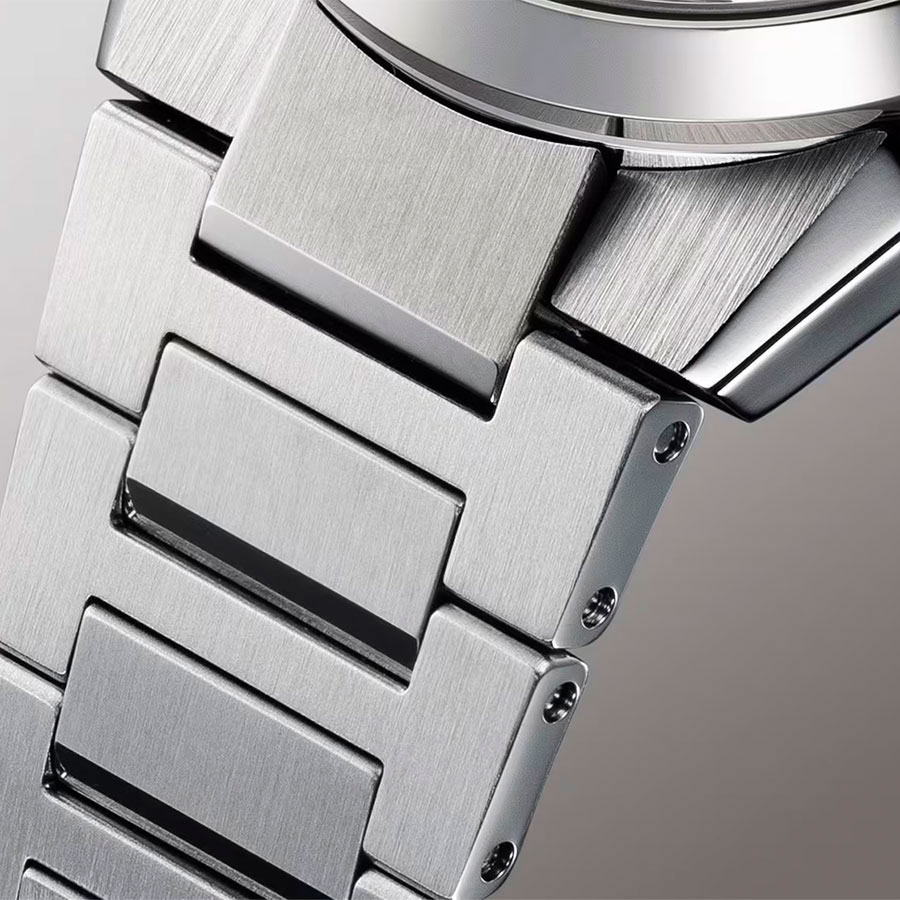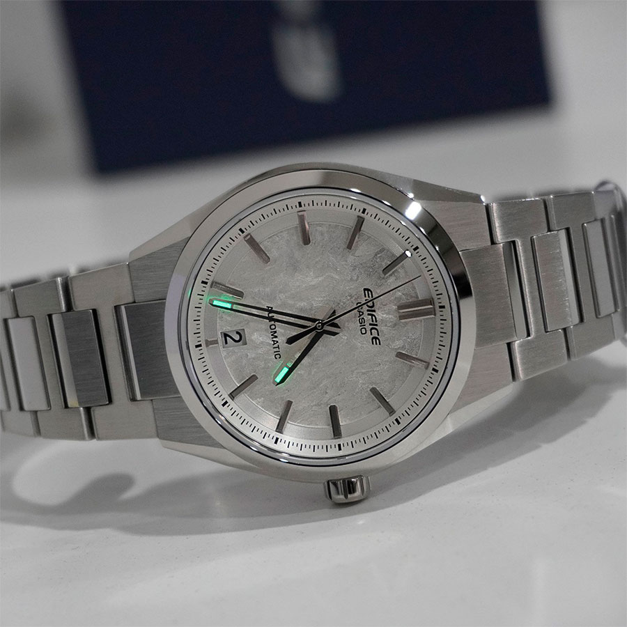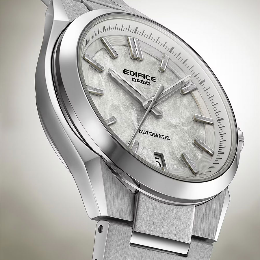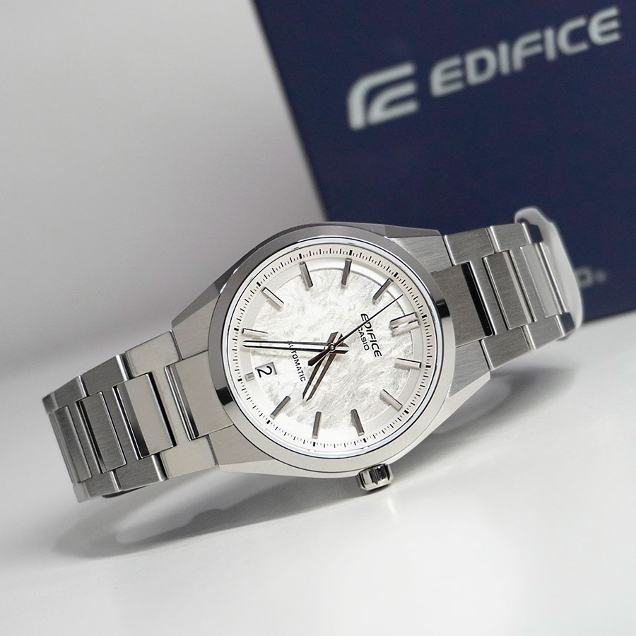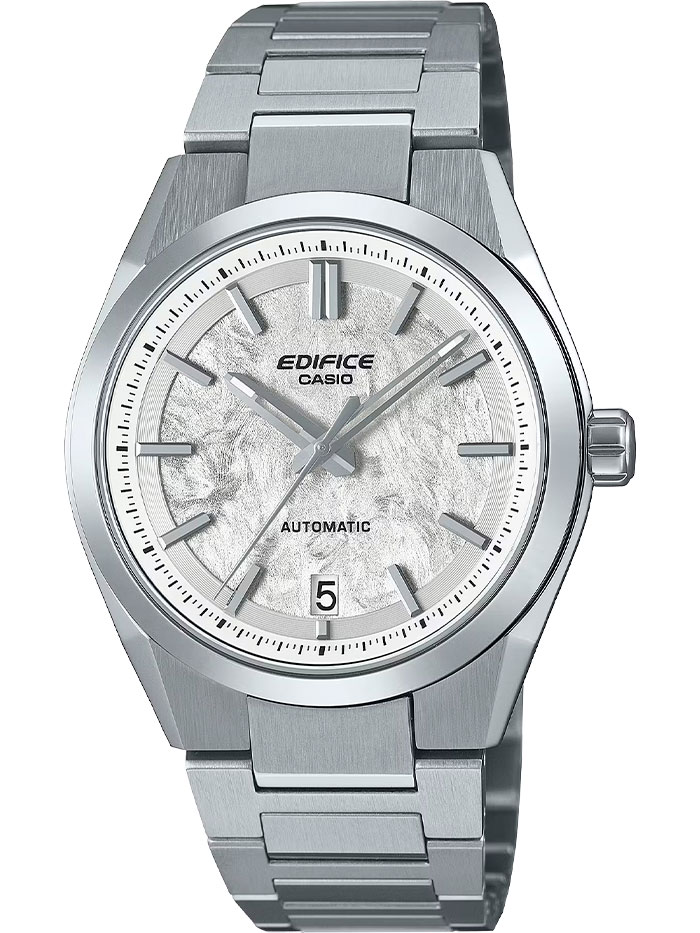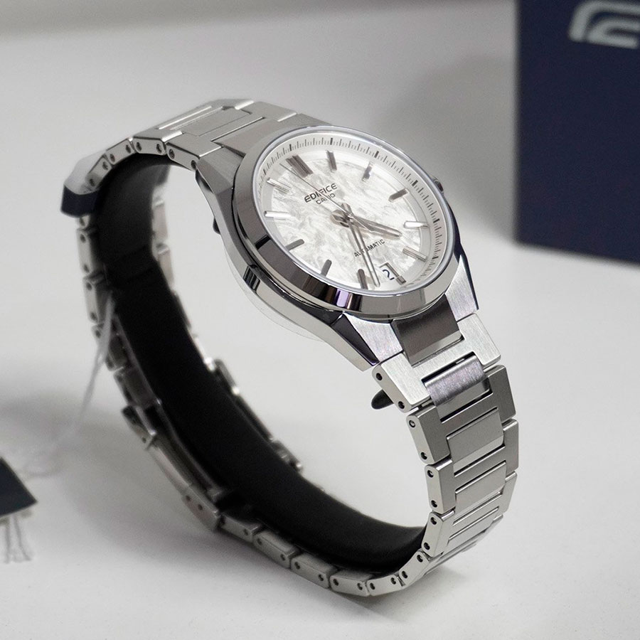 Корпус и браслет выполнены из нержавеющей стали, а светлый циферблат с динамичными индексами под сапфировым стеклом придаёт модели элегантность и свежий вид. Завинчивающаяся прозрачная задняя крышка демонстрирует работу механизма, подчёркивая премиальный характер часов. Стрелки покрыты люминесцентным составом для читаемости в темноте, а дополнительное окошко даты повышает удобство.