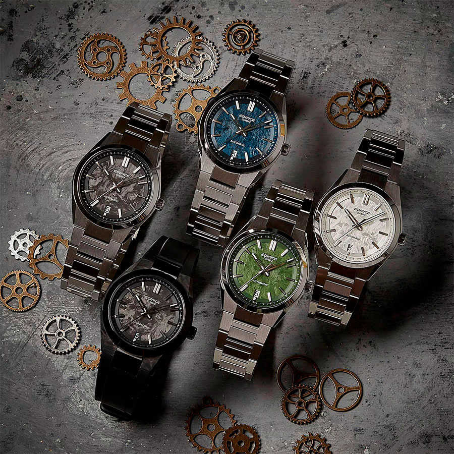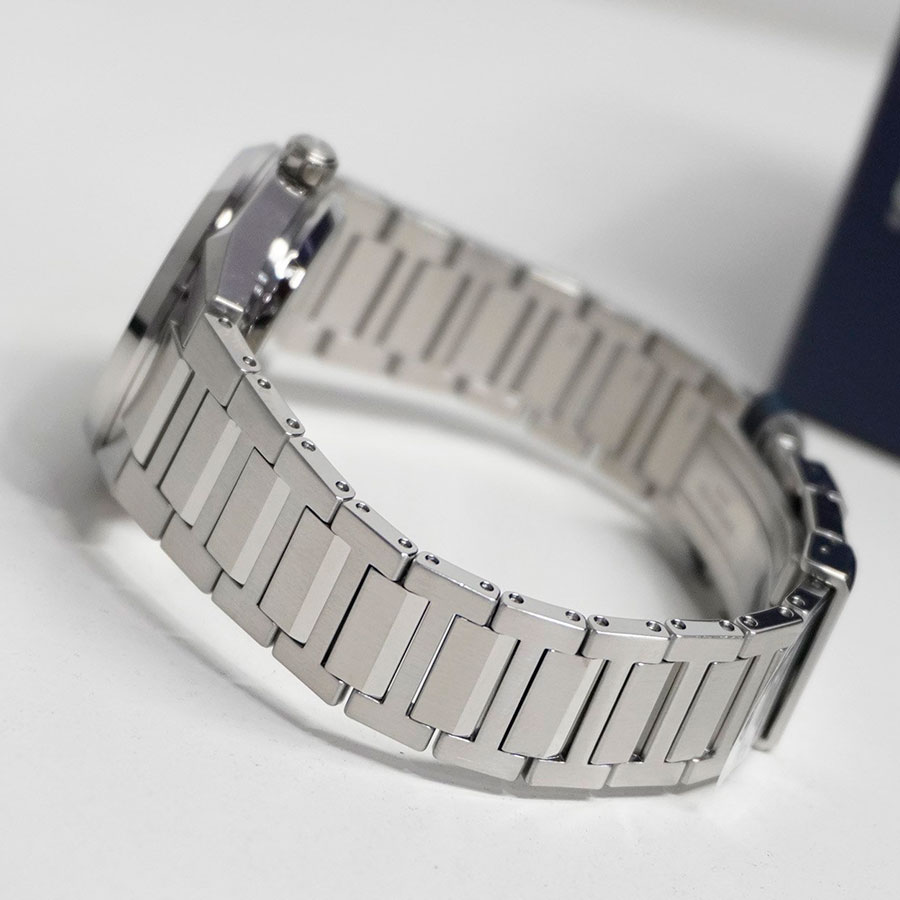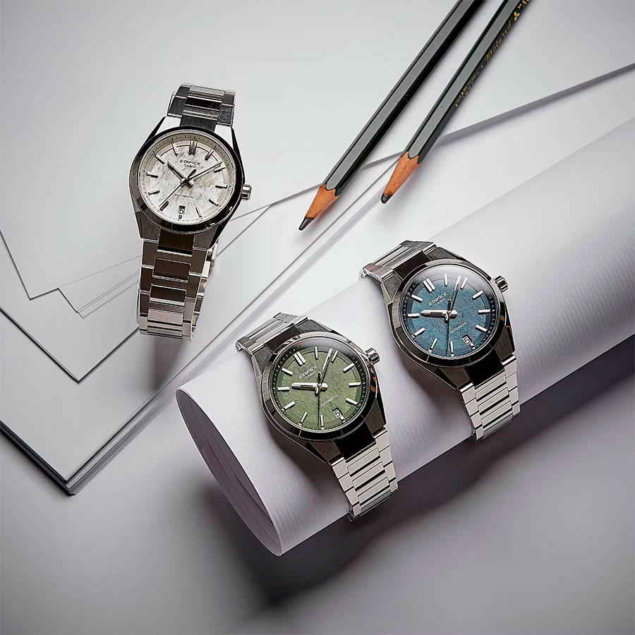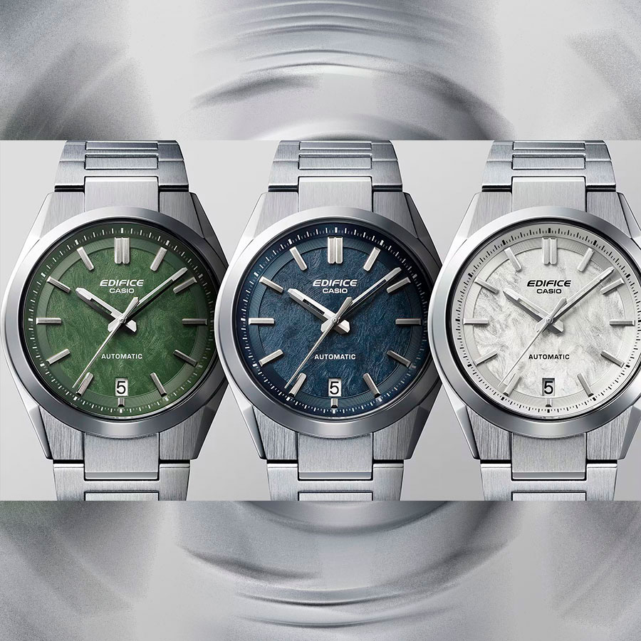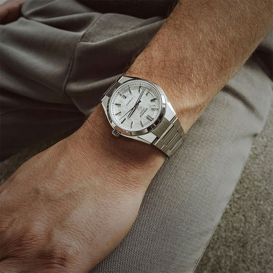 Корпус и браслет выполнены из нержавеющей стали, а светлый циферблат с динамичными индексами под сапфировым стеклом придаёт модели элегантность и свежий вид. Завинчивающаяся прозрачная задняя крышка демонстрирует работу механизма, подчёркивая премиальный характер часов. Стрелки покрыты люминесцентным составом для читаемости в темноте, а дополнительное окошко даты повышает удобство.