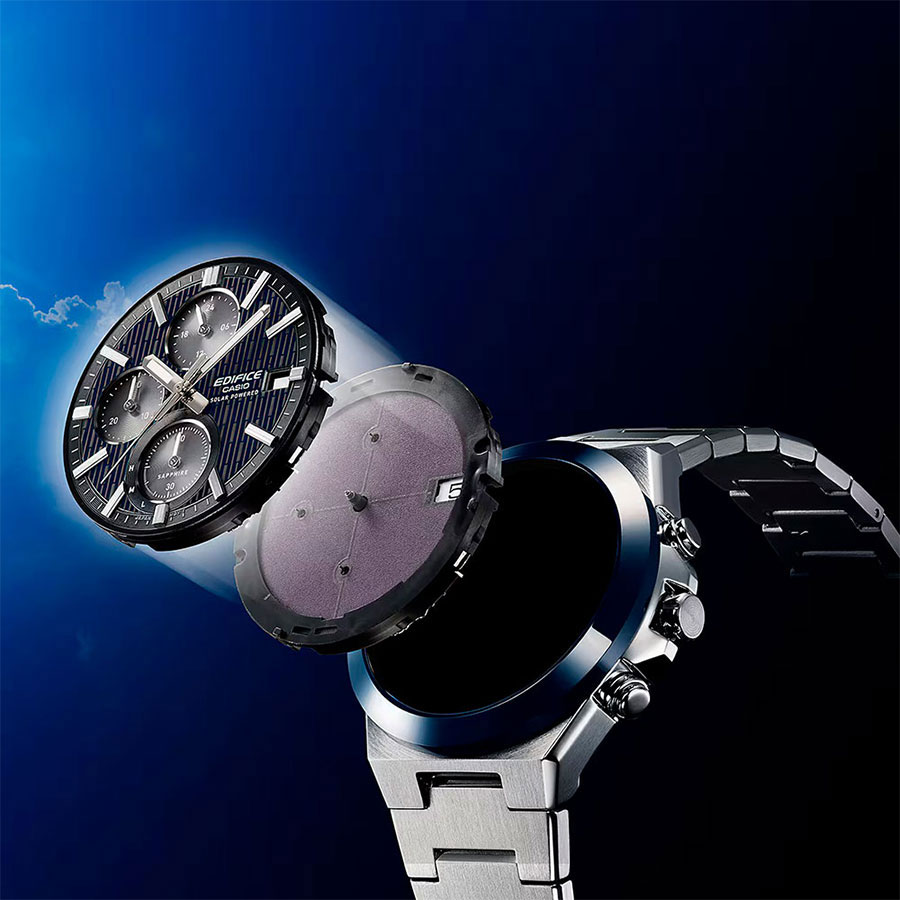 В основе установлен кварцевый механизм калибра 5529, питающийся от солнечного света. Полный заряд обеспечивает до 5 месяцев работы, а аккумулятор рассчитан примерно на 10 лет службы. Часы оснащены индикатором уровня заряда и системой уведомления о недостаточном заряде, что гарантирует удобство эксплуатации.