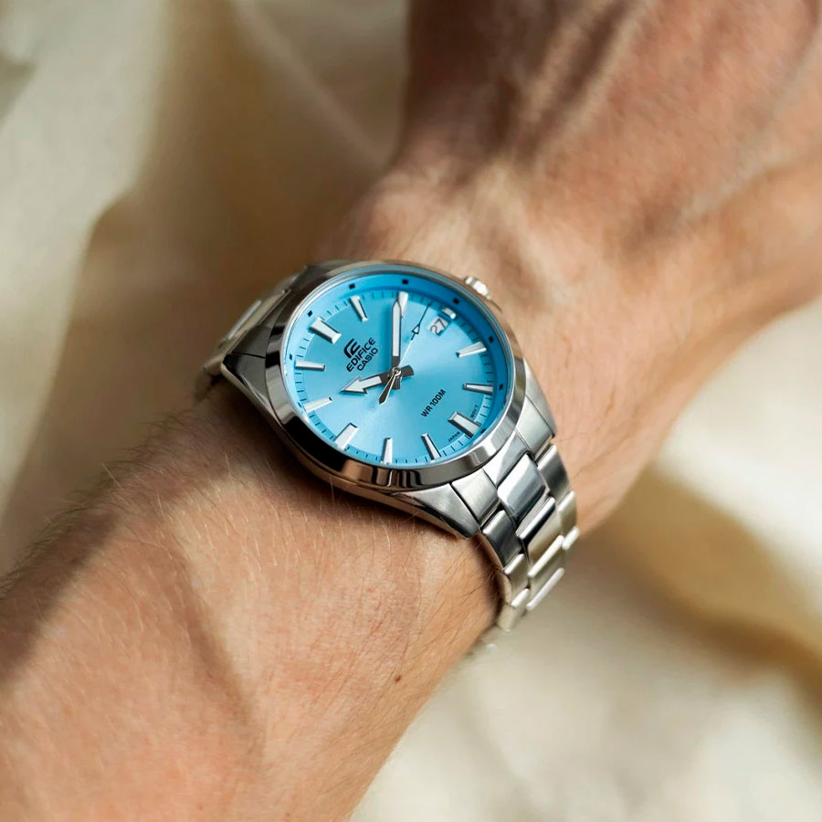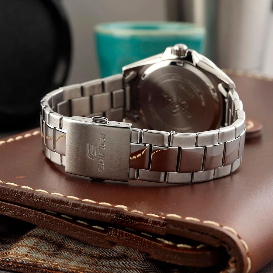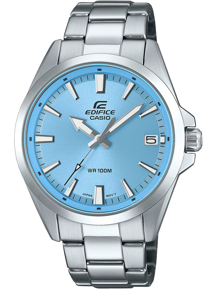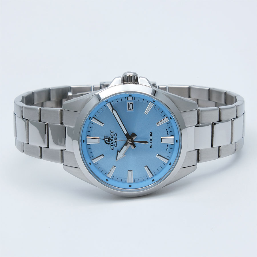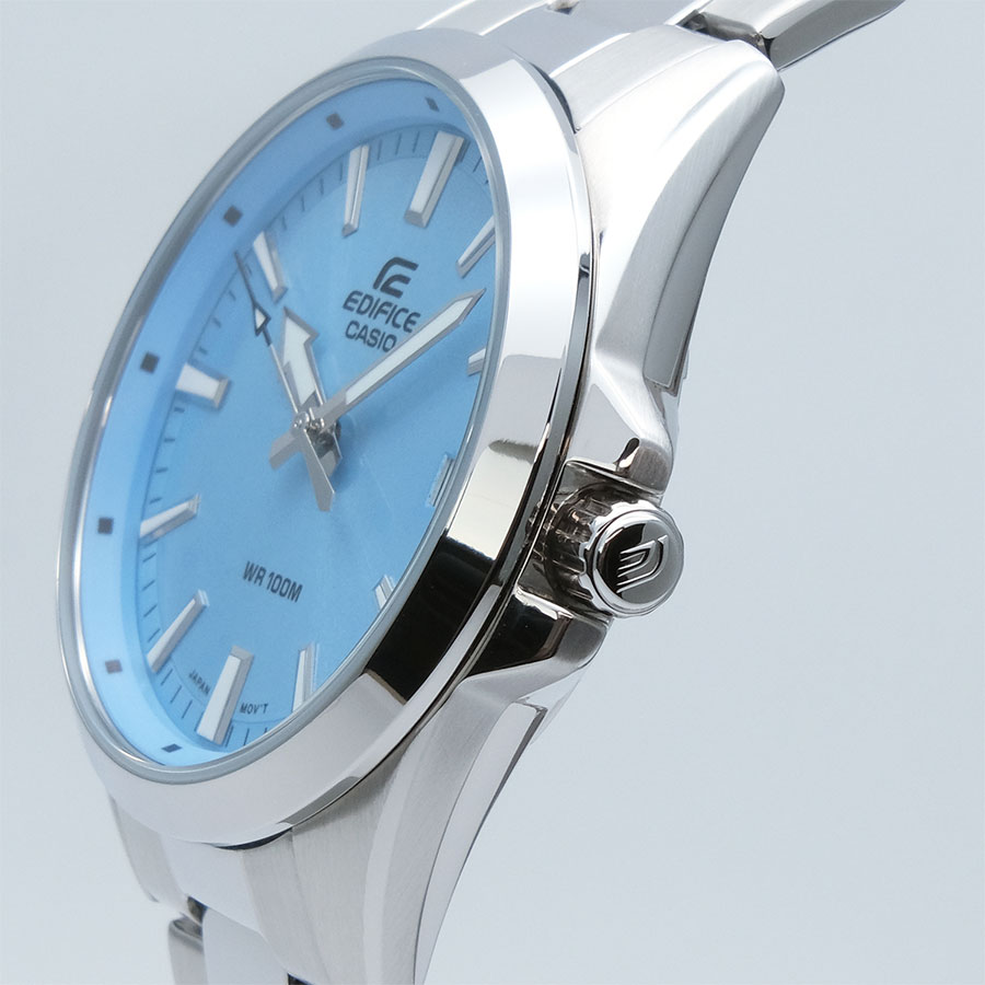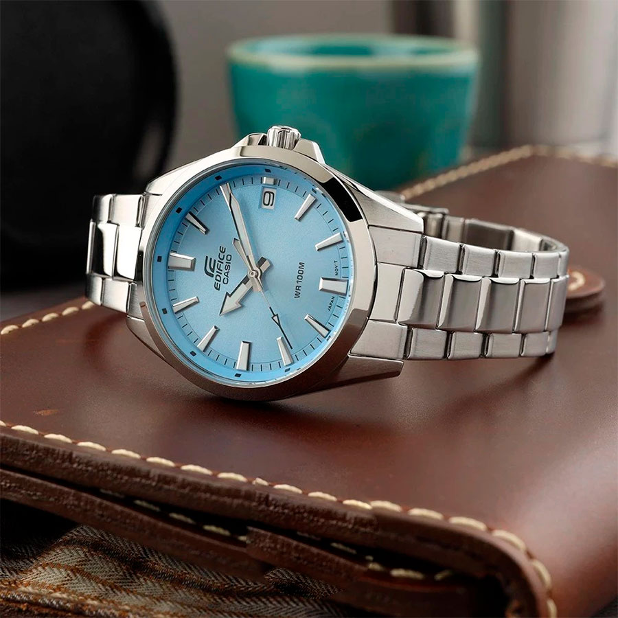 Корпус и браслет выполнены из нержавеющей стали, а голубой циферблат с аккуратными индексами придаёт часам утончённый и современный вид. Завинчивающаяся задняя крышка повышает герметичность и защищает механизм от влаги и пыли. Стиль Edifice подчеркивается чистыми линиями и продуманными пропорциями.