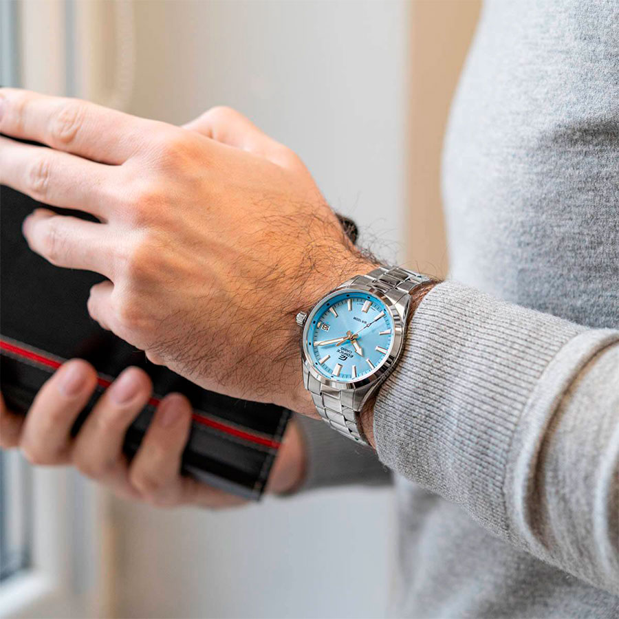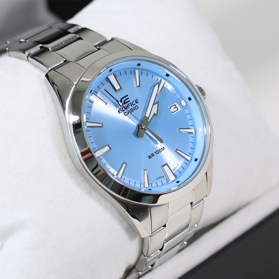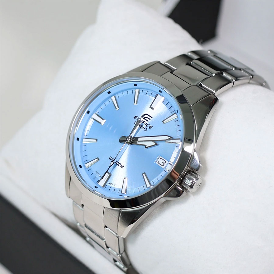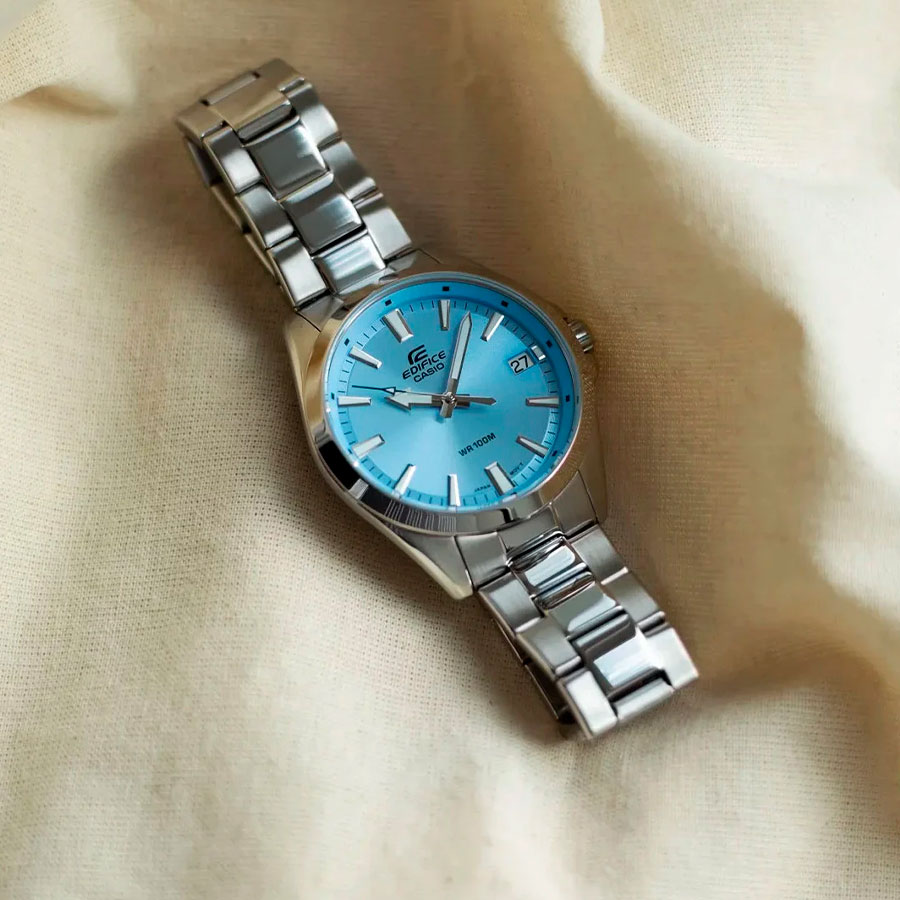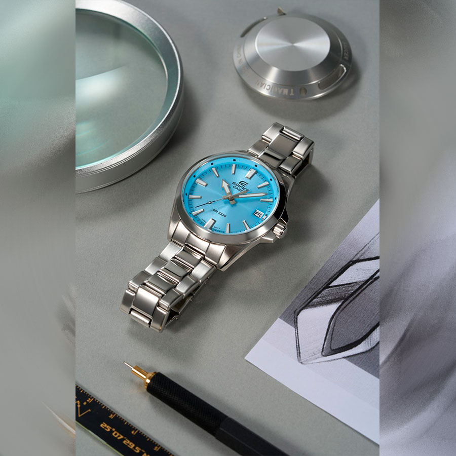Корпус и браслет выполнены из нержавеющей стали, а голубой циферблат с аккуратными индексами придаёт часам утончённый и современный вид. Завинчивающаяся задняя крышка повышает герметичность и защищает механизм от влаги и пыли. Стиль Edifice подчеркивается чистыми линиями и продуманными пропорциями.