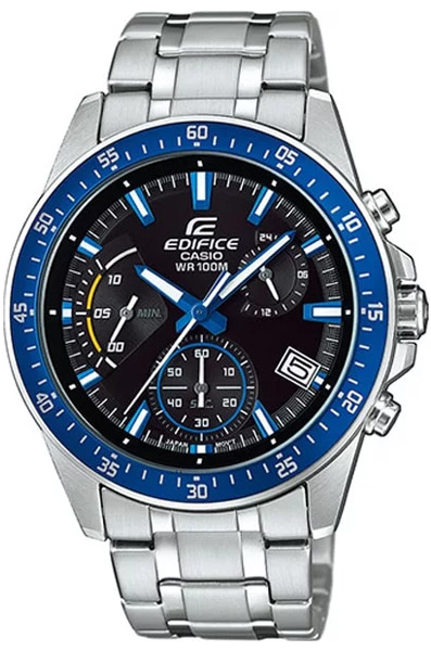 Мужские кварцевые наручные часы с хронографом (секундомером) Casio EFV-540D-1A2. Коллекция Edifice. Калибр механизма — 5563. На данной модели отображается дата и время суток (24 часа). Секундомер может отсчитывать до 9 минут 59 секунд. Стрелки и метки покрыты люминесцентным напылением (светятся в темноте). На корпус частично нанесено стойкое PVD покрытие. Водонепроницаемость WR100 (10 атм). Завинчивающаяся задняя крышка. Размеры корпуса: (ШхВхТ) 43.8x48.5x12.1 мм Гарантийный срок — 3 года (1 год от производителя + 2 года от магазина).
